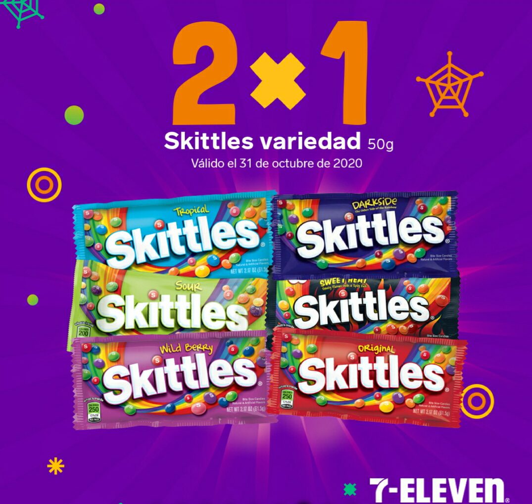 Hoy sábado 31 de octubre las tiendas 7-Eleven tienen 2×1 en dulces y chocolates seleccionados (Hersheys, Snickers, Milky Way, M&Ms, Skwinkles, Lucas, etc.) para celebrar la clásica tradición de pedir calaverita este Halloween. En la compra de un dulce o chocolate seleccionado se llevan gratis el segundo de igual o menor precio.