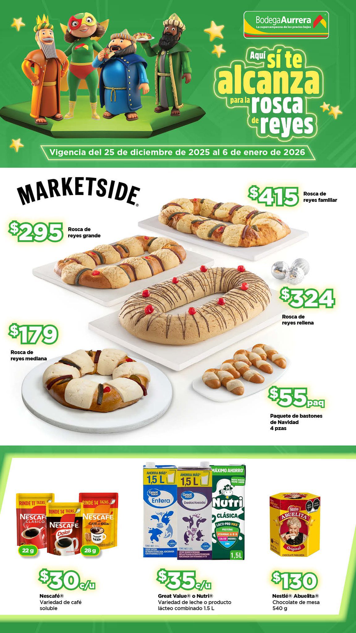 Acabo de ver el folleto Aquí si te Alcanza para la Rosca de Reyes de las tiendas de autoservicio Bodega Aurrera, que contiene sus ofertas válidas del 25 de diciembre 2025 al 06 de enero de 2026, en el que encontrarás Precios especiales; las ofertas aplican en artículos seleccionados, son válidas en su tienda en línea bodegaaurrera.com.mx y en sus sucursales físicas y éste es su folleto: