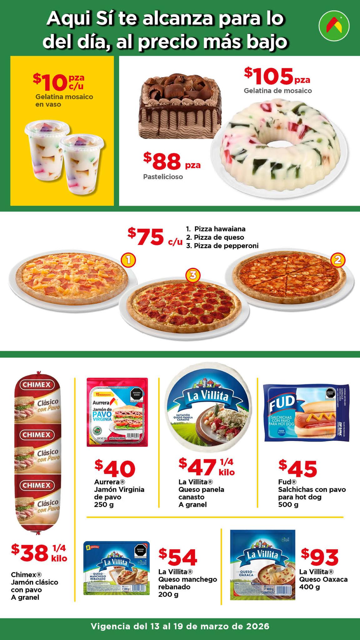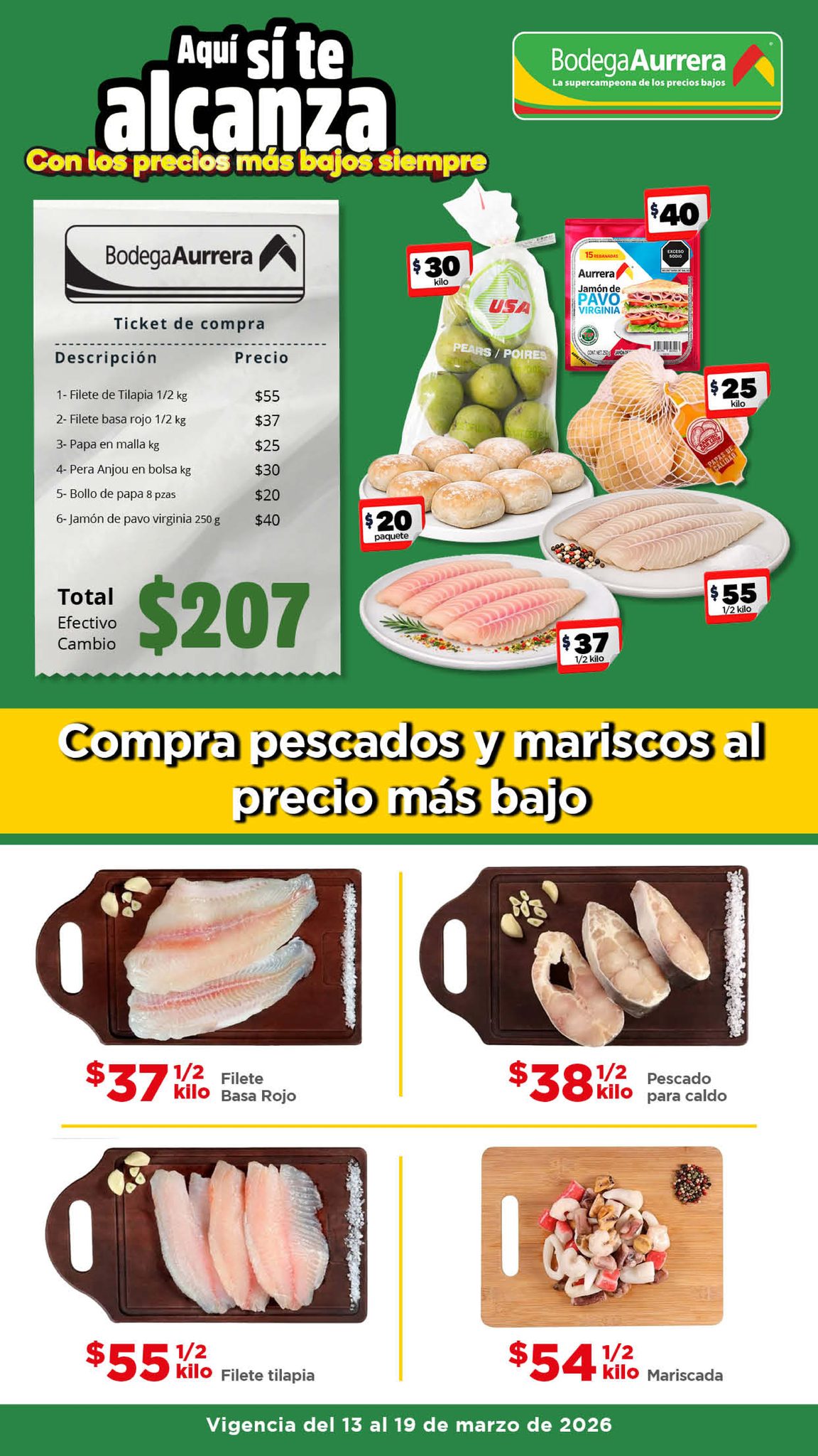 Estoy viendo el folleto “El Tianguis de frutas y verduras, Precio Bodega” de las tiendas de autoservicio Bodega Aurrera, que contiene sus ofertas válidas del 13 al 19 de marzo de 2026, en el que encontrarás Precios especiales; las ofertas aplican en artículos seleccionados, son válidas en su tienda en línea bodegaaurrera.com.mx y en sus sucursales físicas.