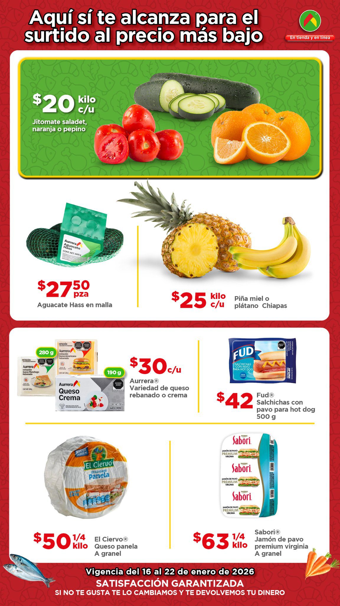 Estoy viendo el folleto “El Tianguis de frutas y verduras, Precio Bodega” de las tiendas de autoservicio Bodega Aurrera, que contiene sus ofertas válidas del 16 al 22 de enero de 2026, en el que encontrarás Precios especiales; las ofertas aplican en artículos seleccionados, son válidas en su tienda en línea bodegaaurrera.com.mx y en sus sucursales físicas.