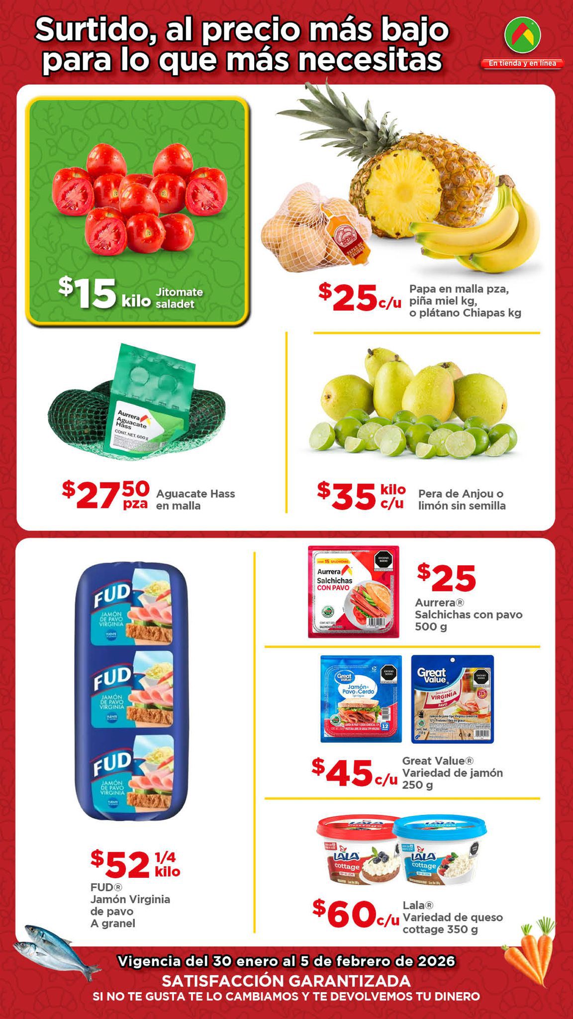 Estoy viendo el folleto “El Tianguis de frutas y verduras, Precio Bodega” de las tiendas de autoservicio Bodega Aurrera, que contiene sus ofertas válidas del 30 de enero el 05 de febrero de 2026, en el que encontrarás Precios especiales; las ofertas aplican en artículos seleccionados, son válidas en su tienda en línea bodegaaurrera.com.mx y en sus sucursales físicas.