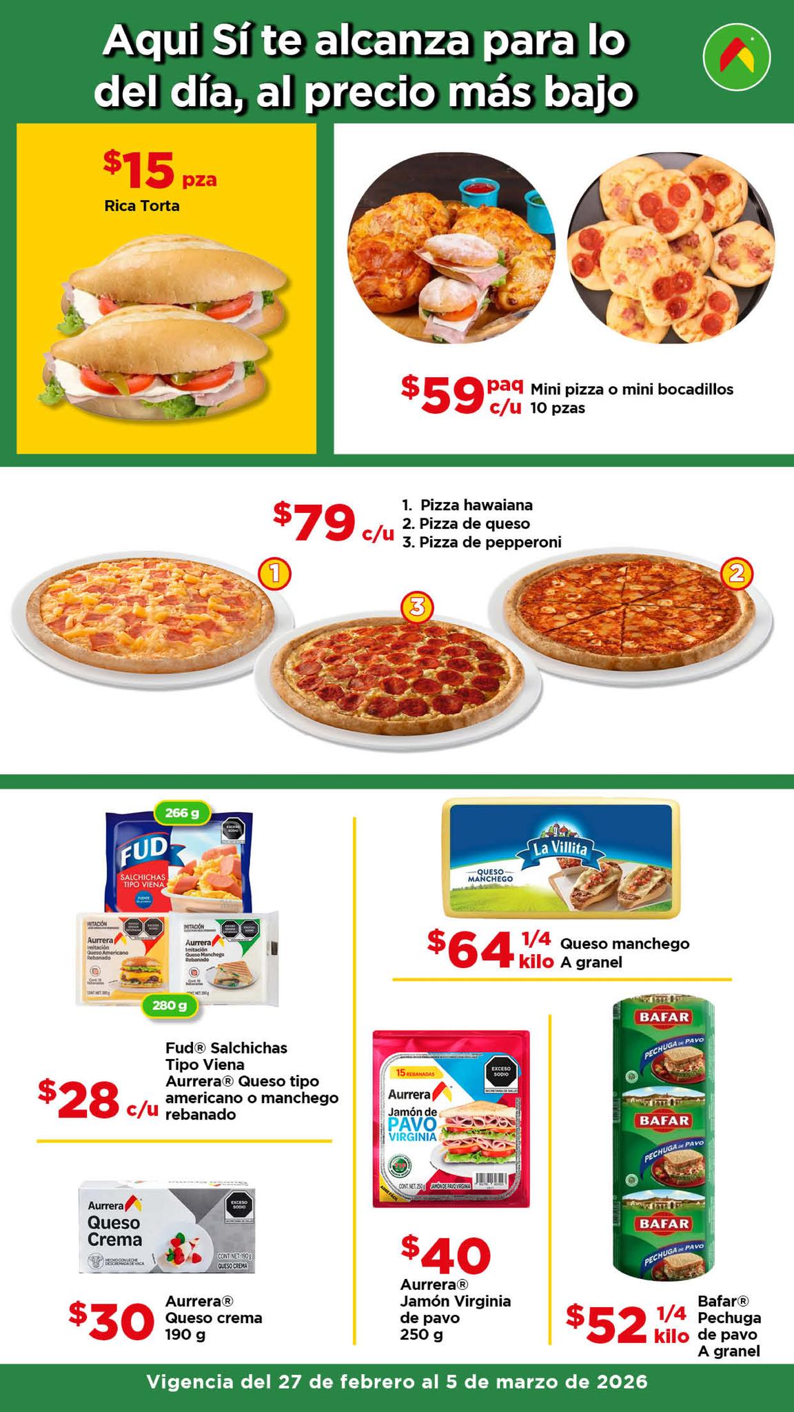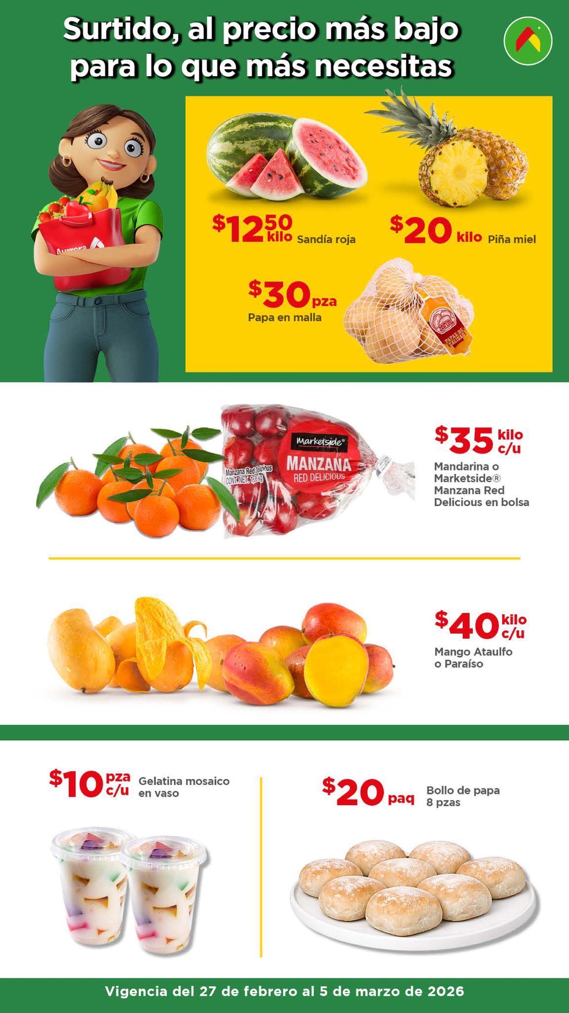 Estoy viendo el folleto “El Tianguis de frutas y verduras, Precio Bodega” de las tiendas de autoservicio Bodega Aurrera, que contiene sus ofertas válidas del 27 de febrero al 05 de marzo de 2026, en el que encontrarás Precios especiales; las ofertas aplican en artículos seleccionados, son válidas en su tienda en línea bodegaaurrera.com.mx y en sus sucursales físicas.