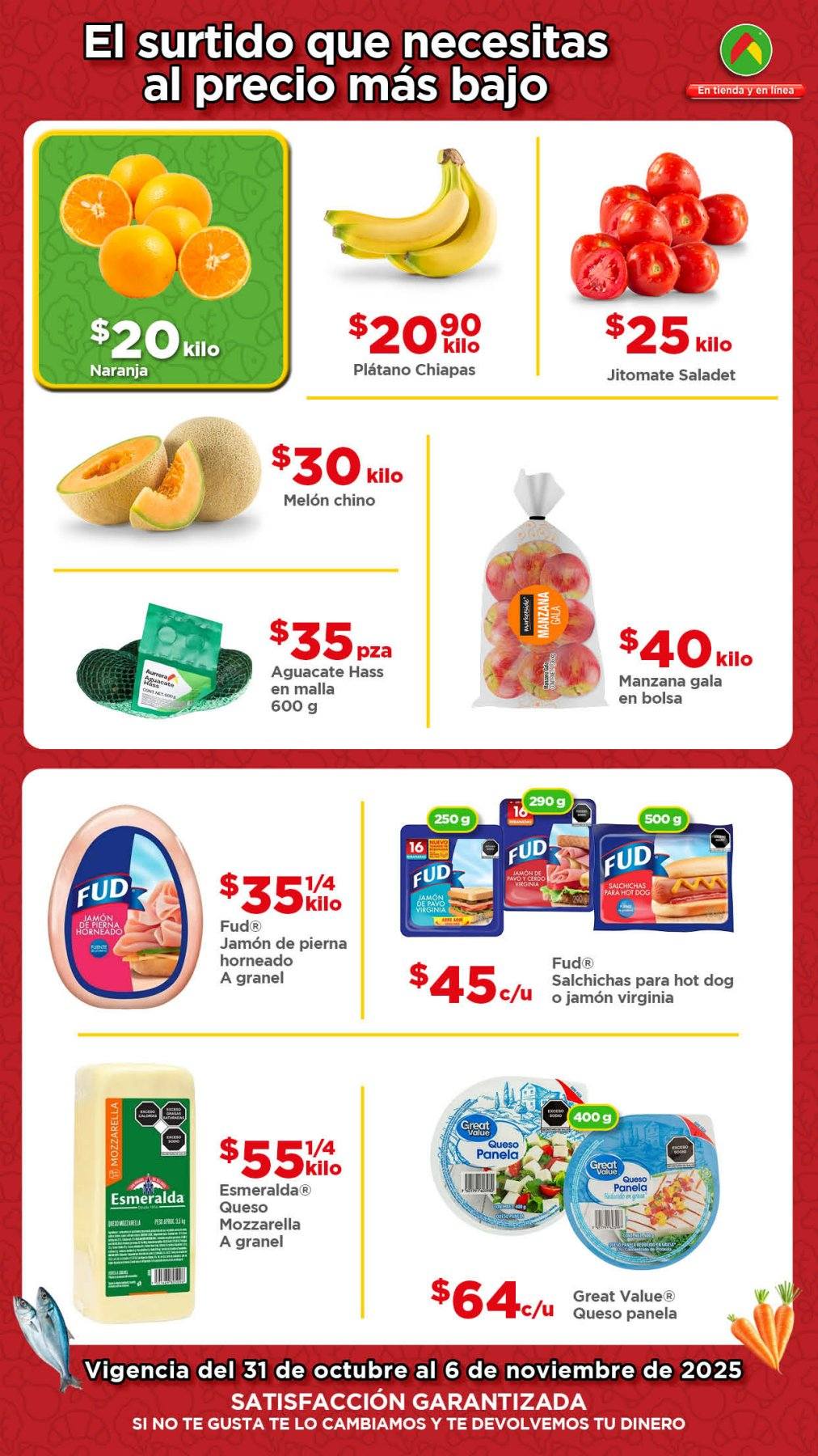 Estoy viendo el folleto “El Tianguis de frutas y verduras, Precio Bodega” de las tiendas de autoservicio Bodega Aurrera, que contiene sus ofertas válidas del 31 de octubre al 06 de noviembre de 2025, en el que encontrarás Precios especiales; las ofertas aplican en artículos seleccionados, son válidas en su tienda en línea bodegaaurrera.com.mx y en sus sucursales físicas.