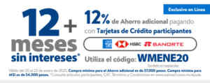 Del lunes 20 al miércoles 22 de enero de 2025, en las tiendas de autoservicio Walmart estará una promoción, en la que te están dando un 12% de Ahorro adicional si pagas con tarjetas de crédito participantes (American Express, HSBC y Banorte) + 12 meses sin intereses; la promoción aplica en compras por un mínimo de $7,000.00, es válida en pedidos realizados en su App sección “Exclusivos online” (que puedes descargar en estos enlaces: para Google Play ó para App Store) y en su tienda en línea walmart.com.mx, en la que deberás usar el código WMENE20.