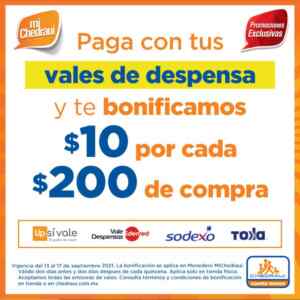 Les comparto que en Chedraui hay una promoción en la que si Pagas con tus Vales de Despensa (de cualquier emisora como Up Sí Vale, Edenred, Sodexo o Toka), te darán $10.00 de bonificación por cada $200.00 de compra; la bonificación aplica en tu Monedero Michedraui, estará vigente Dos días Antes y Dos Días Después de cada Quincena (en esta ocasión del 13 al 17 de septiembre de 2021) y es válida solo en sus sucursales físicas.