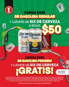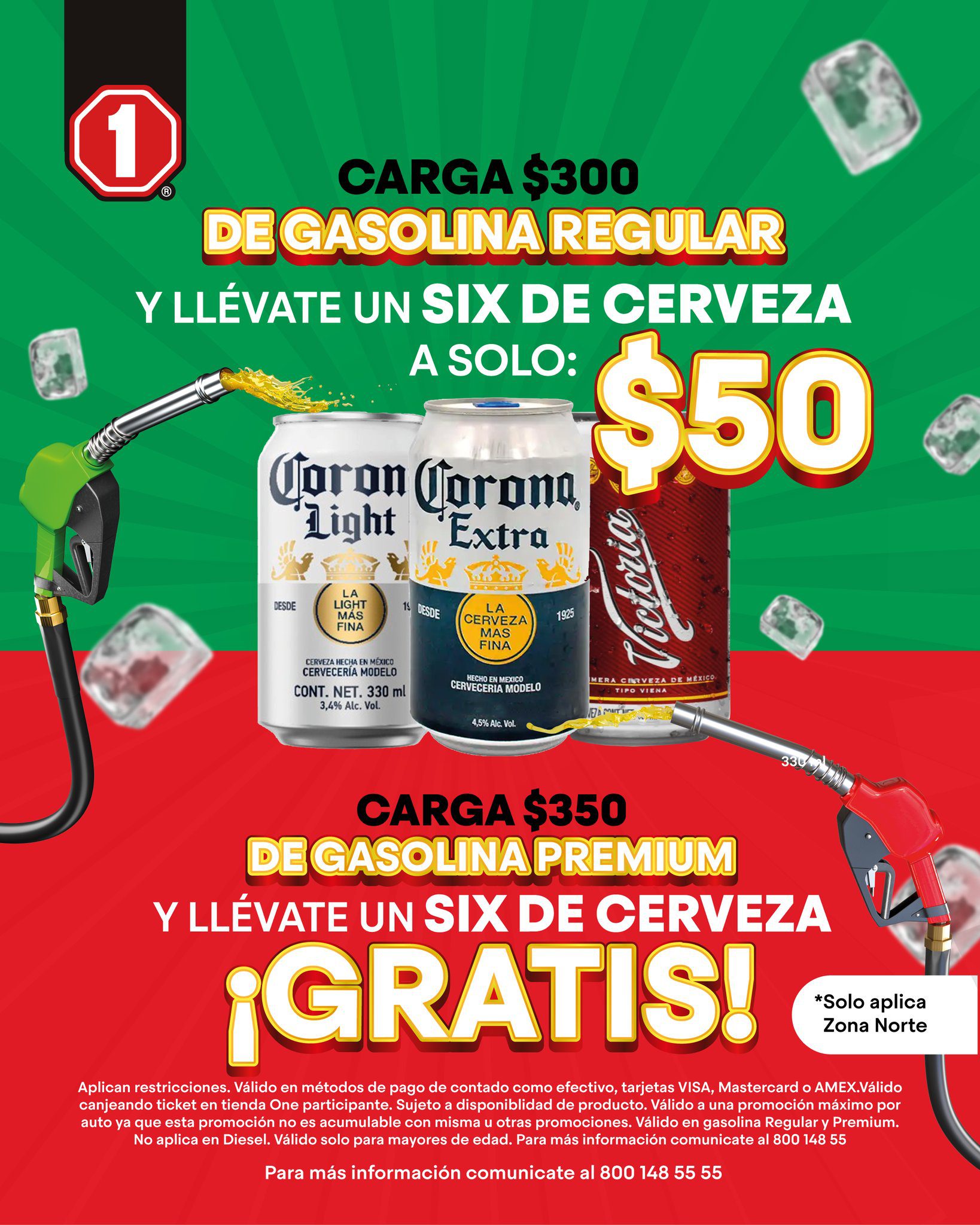 Les comento que en las estaciones One con su promoción Aprovecha el sabor de tu Promo Six, si cargan $350.00 de Gasolina Premium, se llevarán GRATIS 1 Six de Cerveza de 330 ml, ó en la carga de $300.00 de Gasolina Regular, les darán un Six de Cerveza por solo $50.00 (participan marcas como Corona Extra, Corona Light y Victoria); la promoción aplica en pagos de contado en Efectivo, Visa, Mastercard o American Express y es válida en sus estaciones de servicio de la Zona Norte. Deberán canjear el ticket dentro de 30 minutos en las tiendas One México que participan.