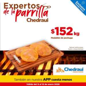 Desde el viernes 09 y hasta el domingo 11 de enero de 2026, en las tiendas de autoservicio Chedraui, estará su promoción Expertos de la Parrilla, con la que encontrarás hasta un 20% de Bonificación en monedero MiChedraui, hasta un 15% de descuento y Precios especiales; la promoción aplica en productos seleccionados y es válida en su tienda en línea www.chedraui.com.mx/ y en sus sucursales físicas.