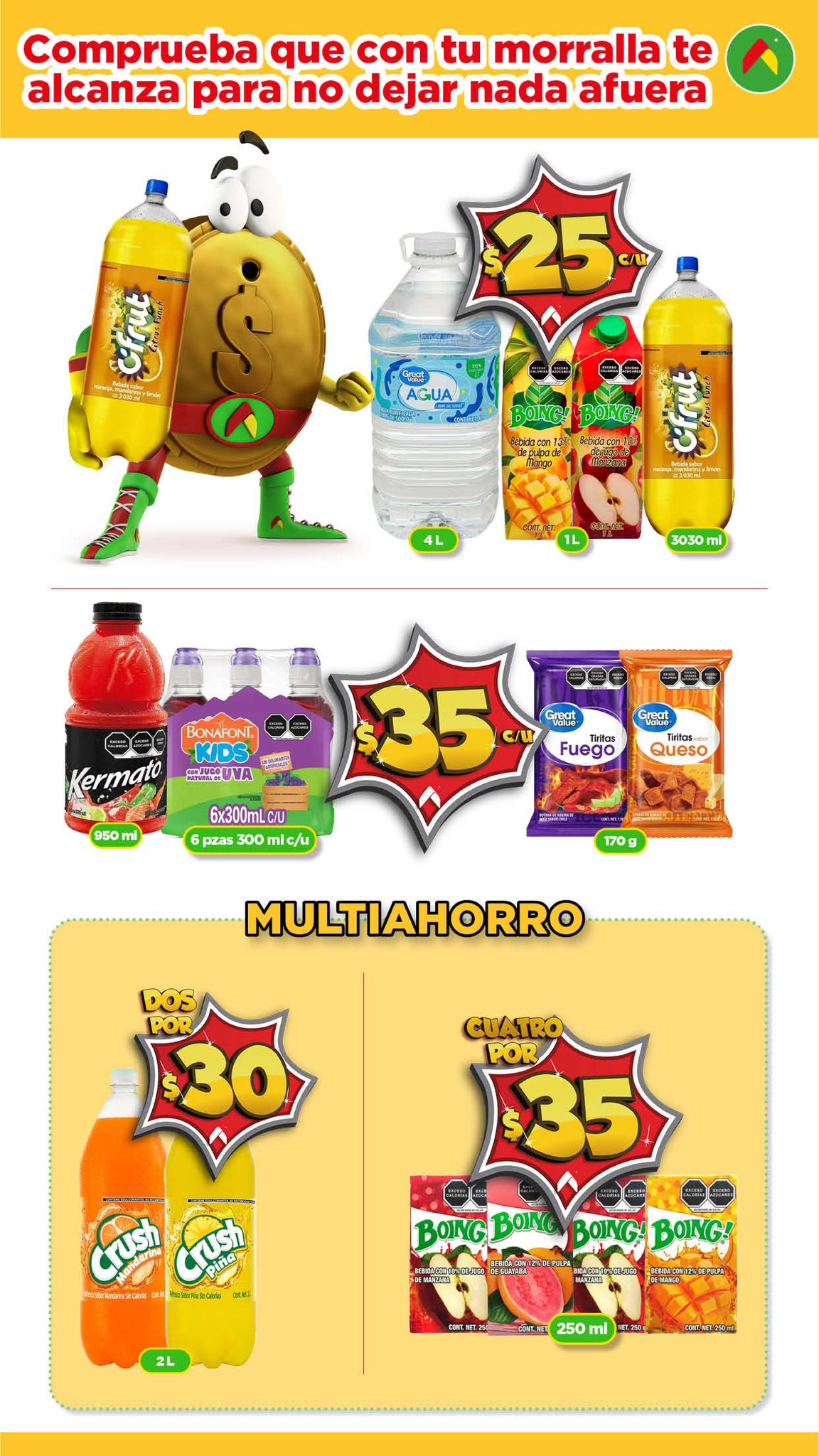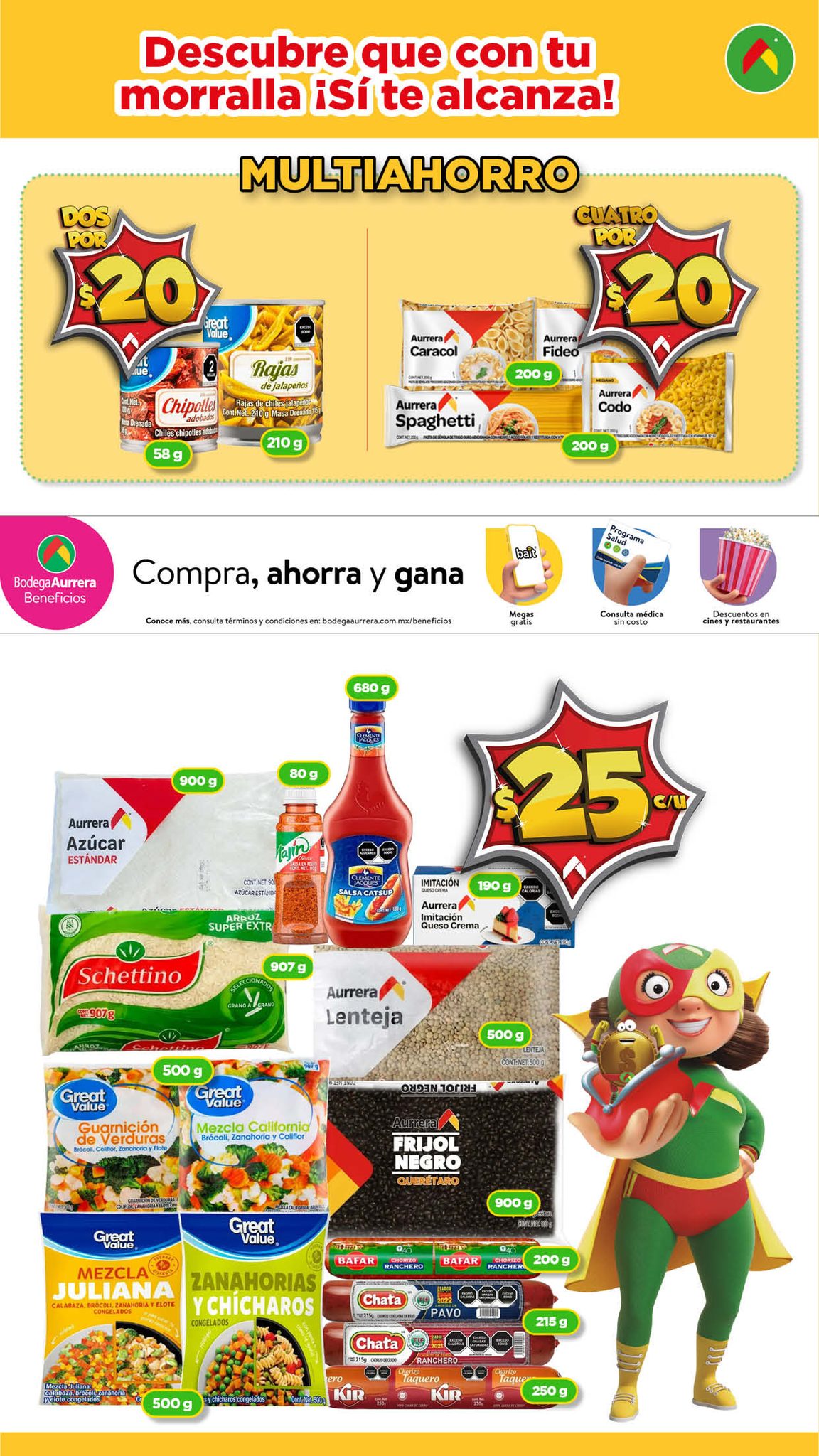 Te comparto el folleto Morralla, Aquí Sí te Alcanza de las tiendas de autoservicio Bodega Aurrera, que contiene sus ofertas válidas del 14 de octubre al 05 de noviembre de 2025 en el que encontrarás Precios especiales en artículos seleccionados de sus diversos departamentos (tienen artículos a $5.00, $10.00, $15.00, $20.00, $25.00, $30.00 y $35.00 c/u), Multiahorros (Ahorros especiales en la compra de determinadas unidades) y hasta un 20% de Bonificación en productos participantes si pagas con Cashi; las ofertas son válidas en su tienda en línea bodegaaurrera.com.mx y en sus sucursales físicas y éste es su folleto: