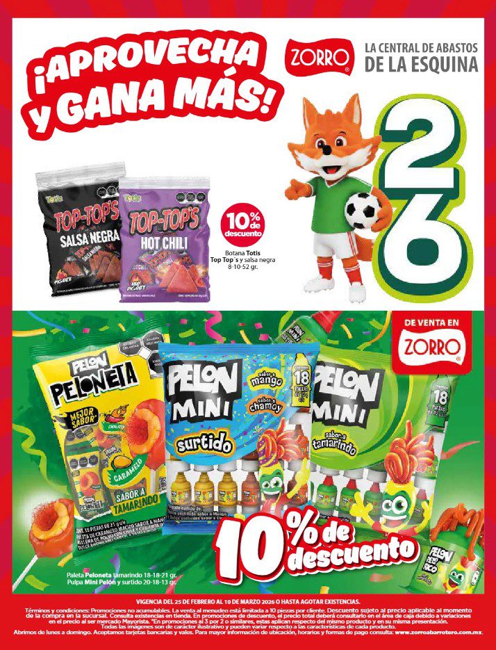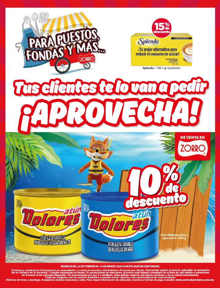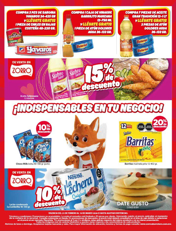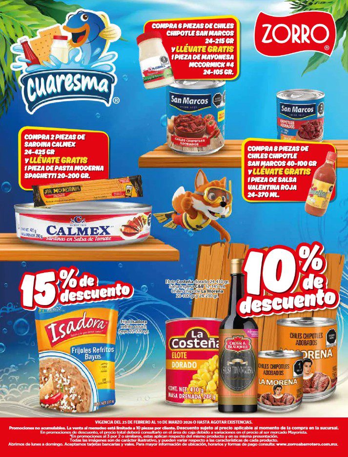 Apenas estoy viendo el folleto de Cuaresma, que el Zorro Abarrotero publicó y que contiene sus ofertas que estarán disponibles del 25 de febrero al 10 de marzo de 2026, entre las que se encuentran Marcas Exclusivas, Indispensables para tu Negocio, Producto Gratis en la compra de mercancía seleccionada, hasta un 25% de descuento y Precios especiales; las ofertas aplican en mercancía seleccionada. No es acumulable con otras promociones y aquí les dejo el folleto completo: