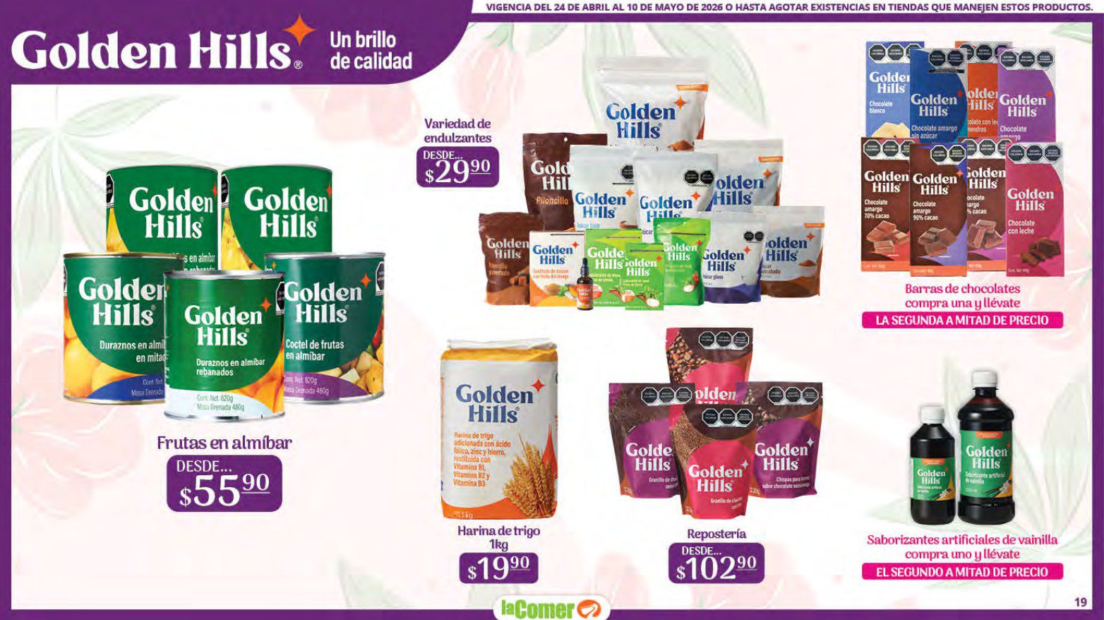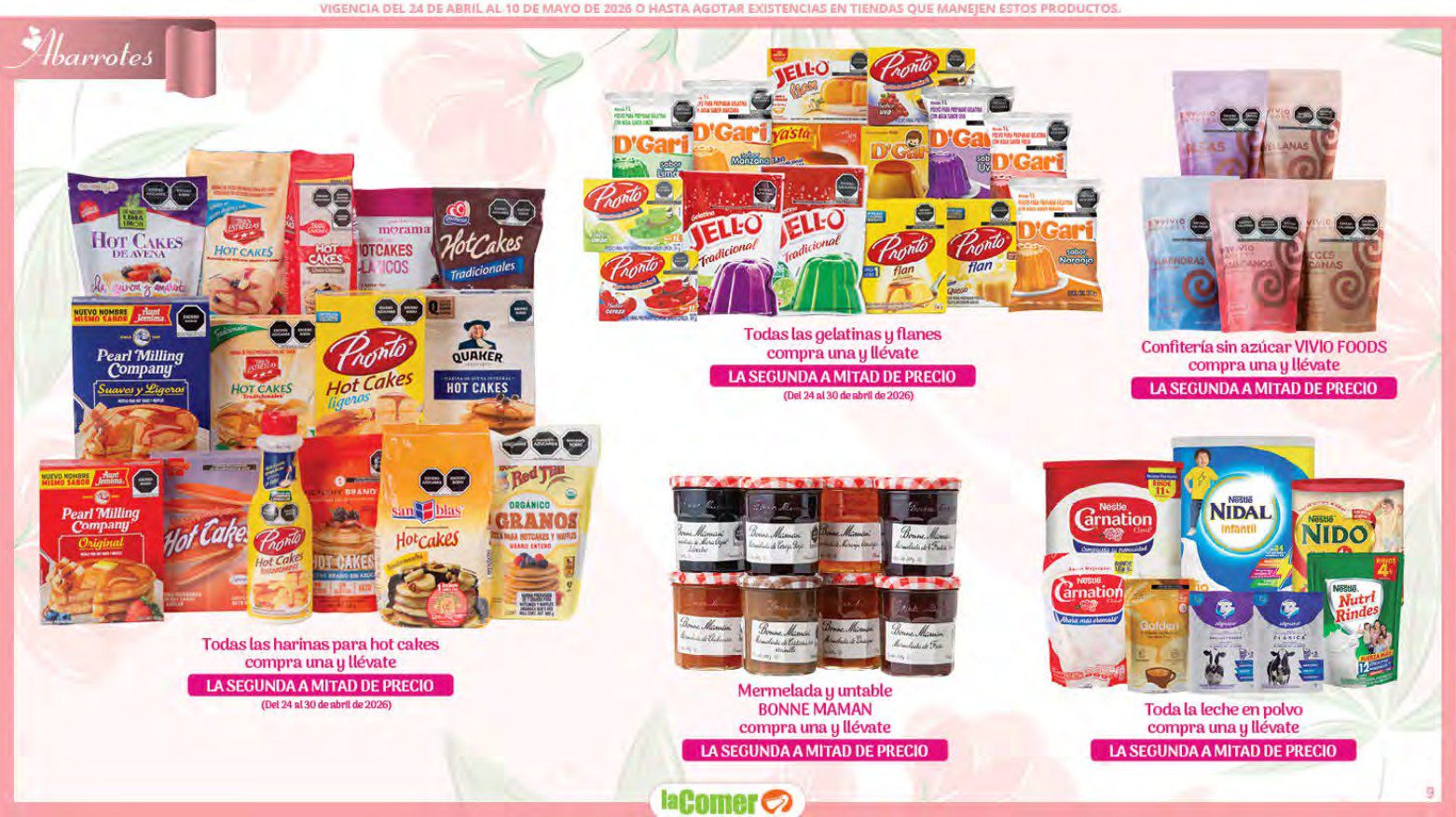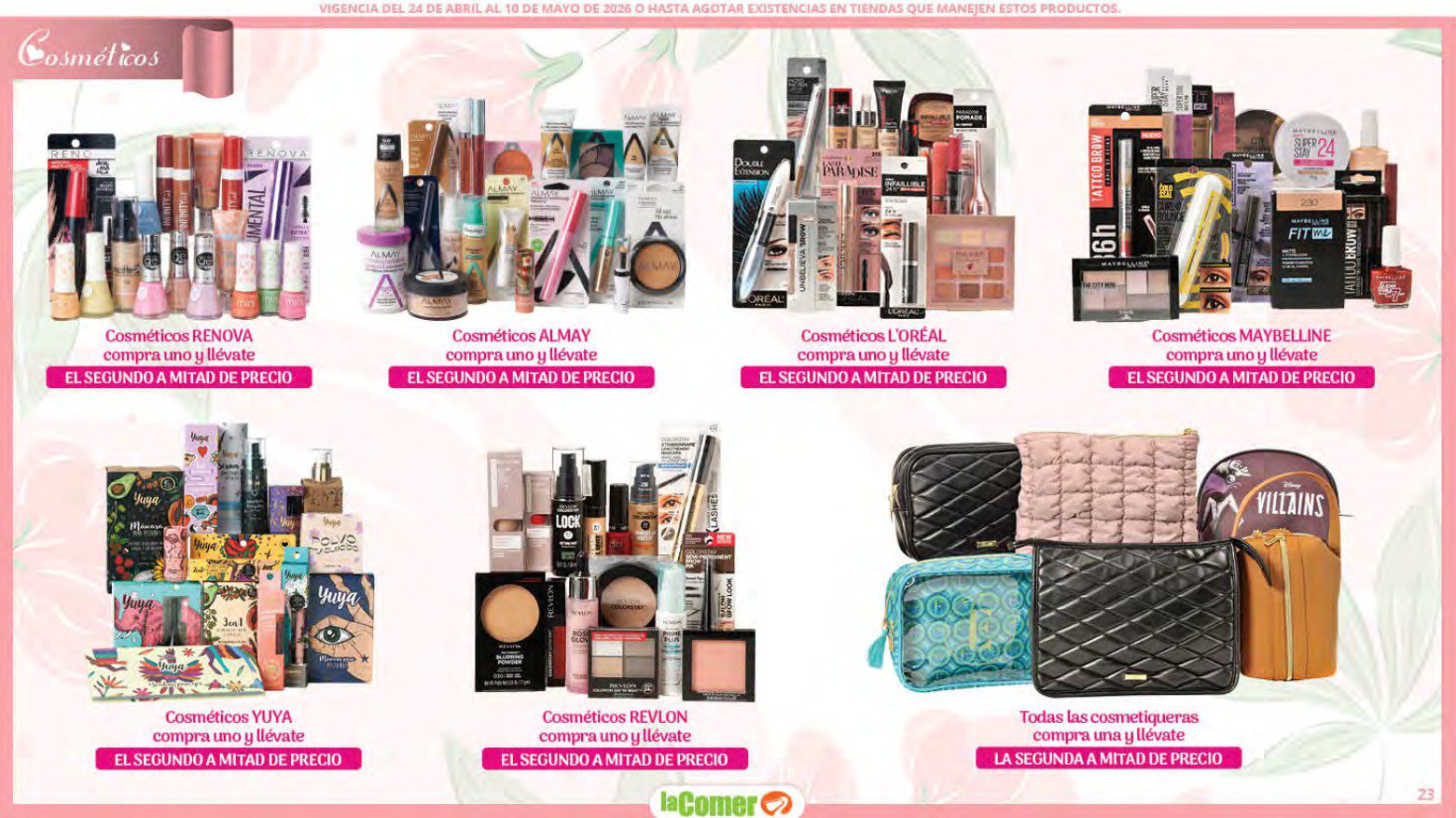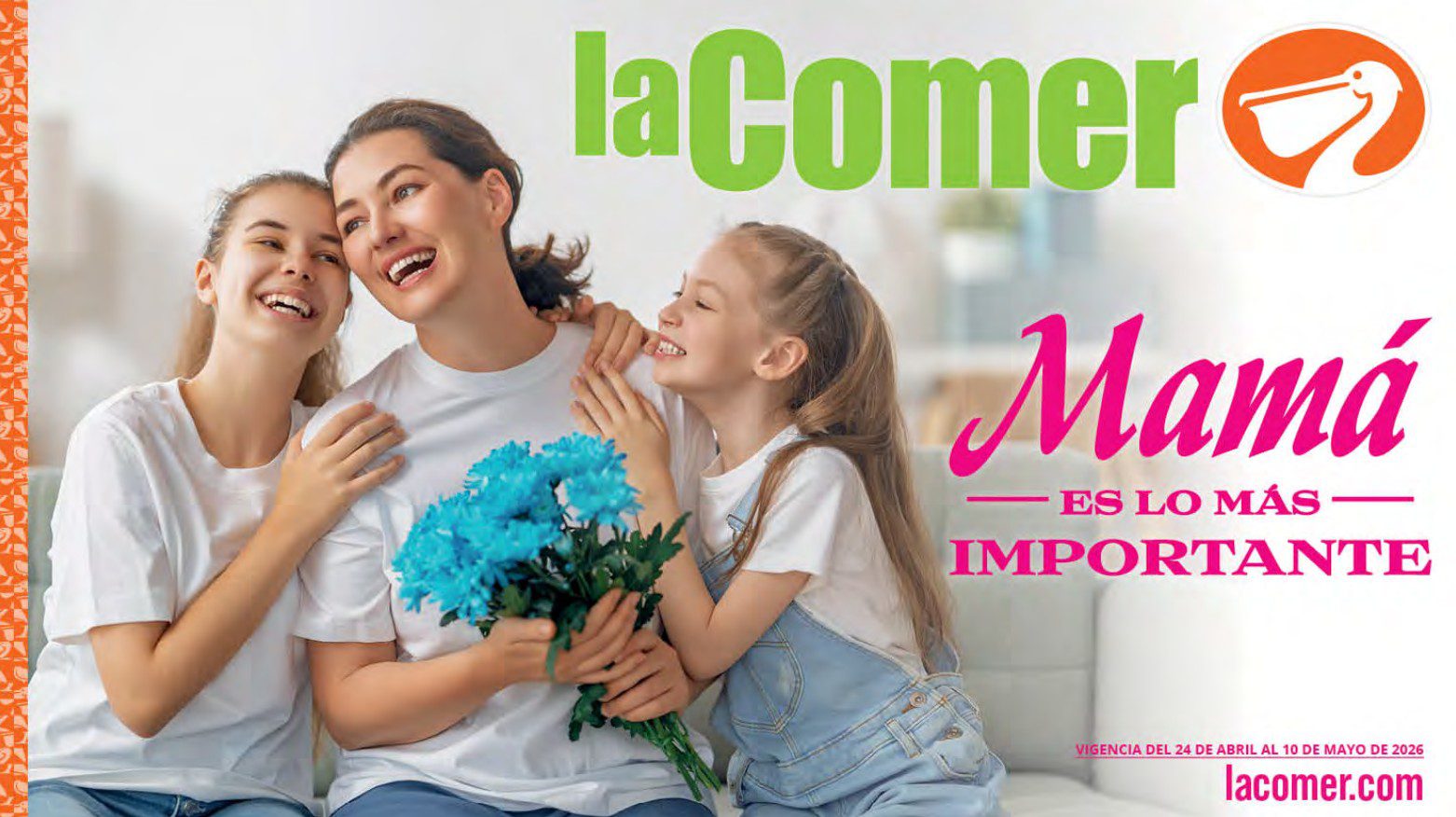 Te comparto el folleto Mamá es lo más Importante por el Día de las Madres de La Comer, que contiene sus ofertas válidas del 24 de abril al 10 de mayo de 2026 o hasta agotar existencias y en el que encontrarás que, en la compra de 1 te llevas el Segundo a Mitad de precio, Bonificaciones en tu Monedero Naranja en la compra de determinados importes, hasta un 30% de descuento, Descuentos especiales en compras por determinadas importes, Precios especiales en productos seleccionados, un 20% de Bonificación en Monedero Naranja por tus Compras en Mundo del Bebé y Ofertas especiales en sus líneas de productos Golden Hills; las ofertas son válidas en su tienda en línea: www.lacomer.com.mx y en sus sucursales físicas y este es su folleto: