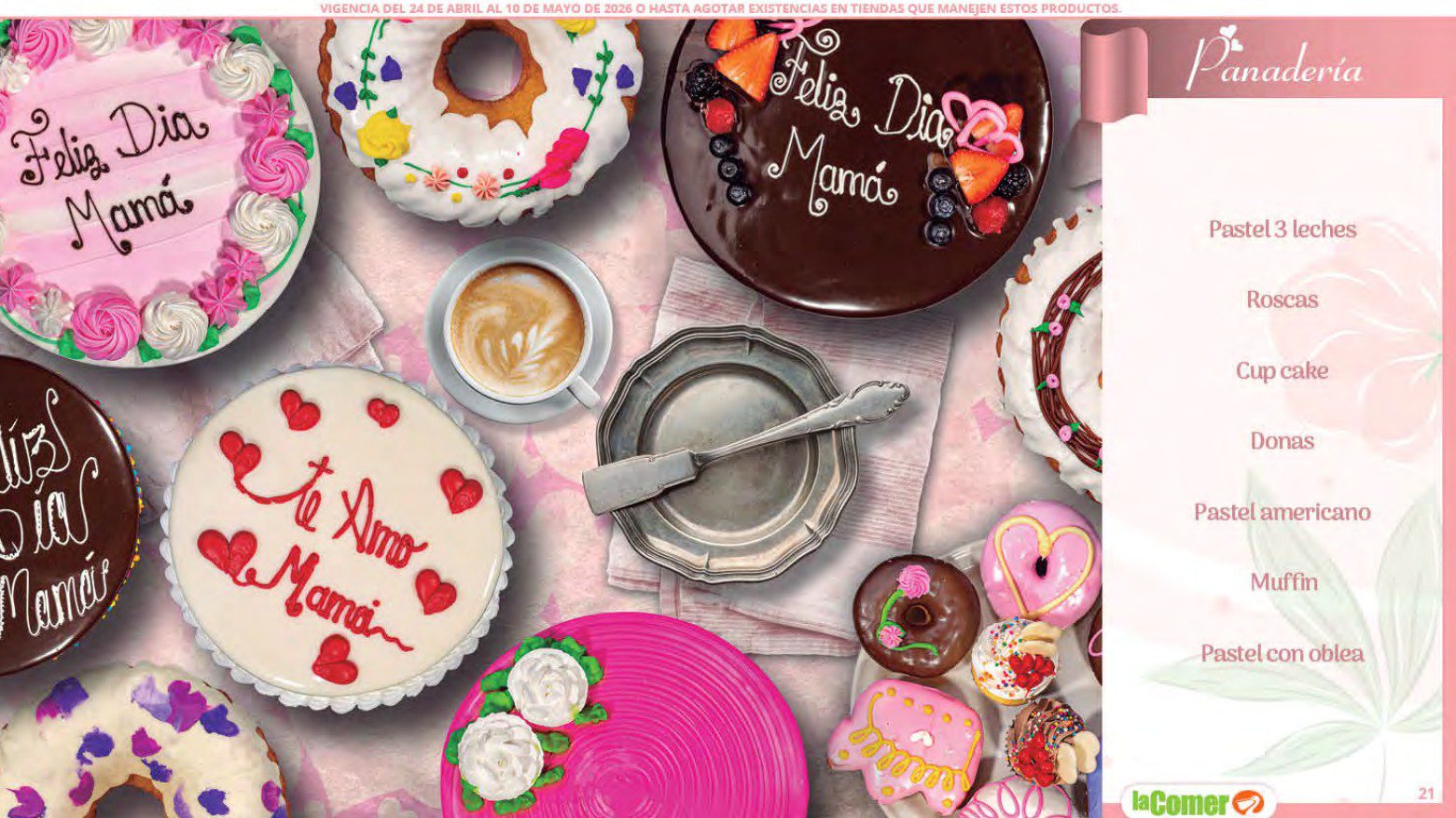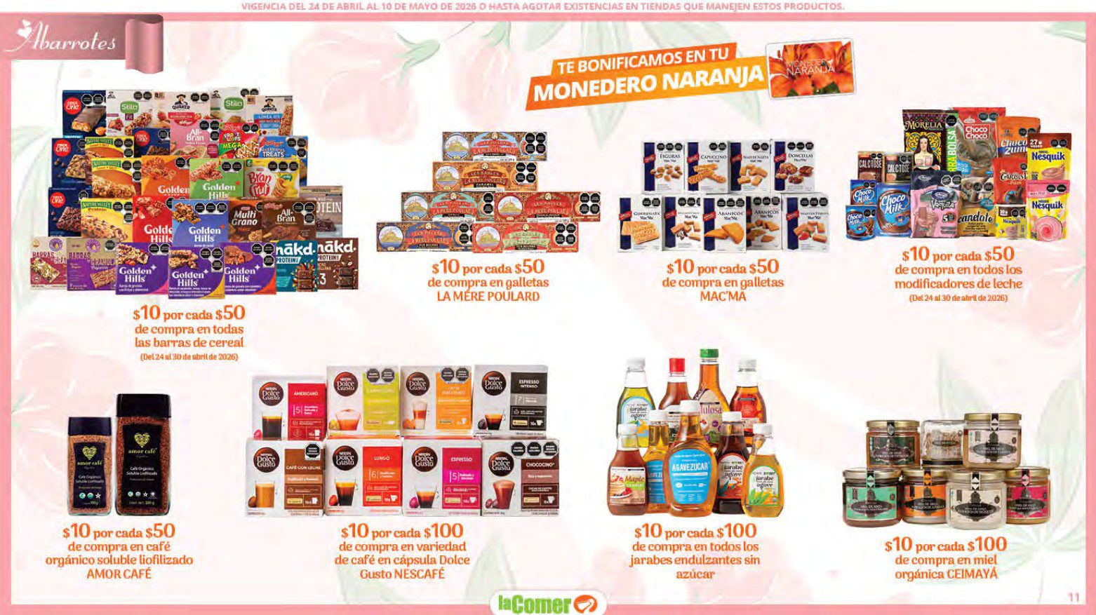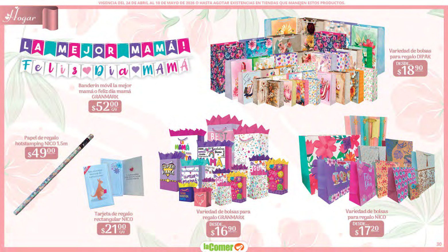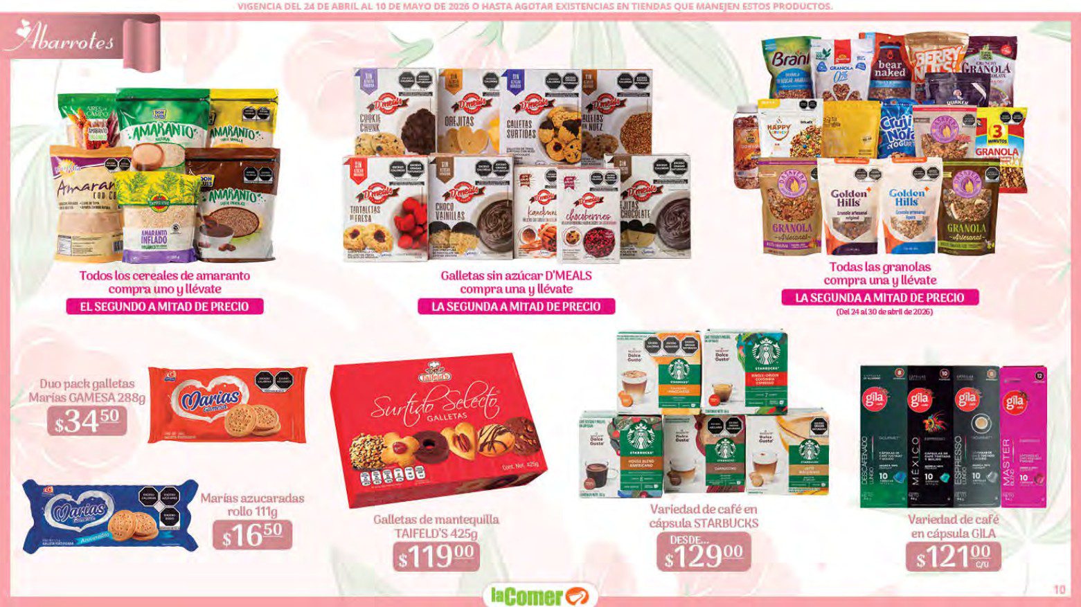 Te comparto el folleto Mamá es lo más Importante por el Día de las Madres de La Comer, que contiene sus ofertas válidas del 24 de abril al 10 de mayo de 2026 o hasta agotar existencias y en el que encontrarás que, en la compra de 1 te llevas el Segundo a Mitad de precio, Bonificaciones en tu Monedero Naranja en la compra de determinados importes, hasta un 30% de descuento, Descuentos especiales en compras por determinadas importes, Precios especiales en productos seleccionados, un 20% de Bonificación en Monedero Naranja por tus Compras en Mundo del Bebé y Ofertas especiales en sus líneas de productos Golden Hills; las ofertas son válidas en su tienda en línea: www.lacomer.com.mx y en sus sucursales físicas y este es su folleto: