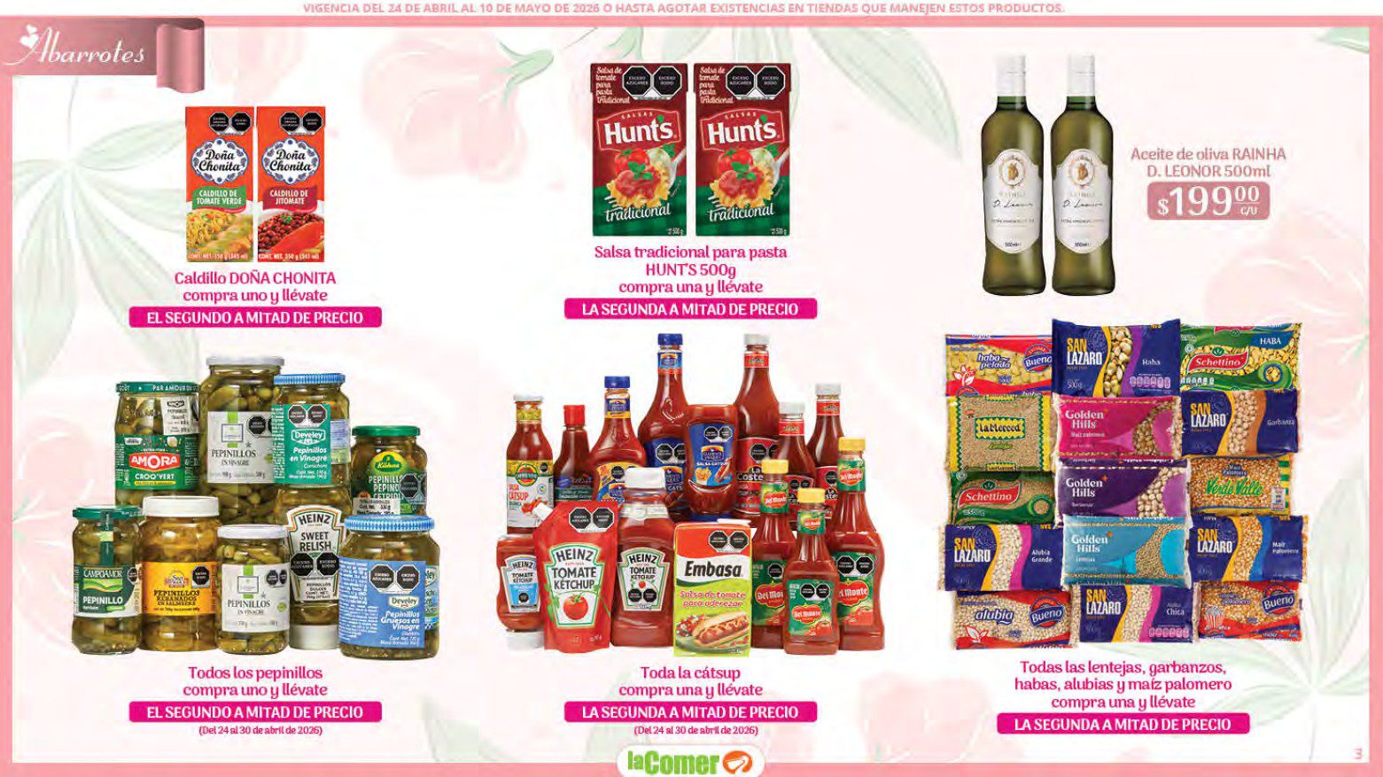 Te comparto el folleto Mamá es lo más Importante por el Día de las Madres de La Comer, que contiene sus ofertas válidas del 24 de abril al 10 de mayo de 2026 o hasta agotar existencias y en el que encontrarás que, en la compra de 1 te llevas el Segundo a Mitad de precio, Bonificaciones en tu Monedero Naranja en la compra de determinados importes, hasta un 30% de descuento, Descuentos especiales en compras por determinadas importes, Precios especiales en productos seleccionados, un 20% de Bonificación en Monedero Naranja por tus Compras en Mundo del Bebé y Ofertas especiales en sus líneas de productos Golden Hills; las ofertas son válidas en su tienda en línea: www.lacomer.com.mx y en sus sucursales físicas y este es su folleto: