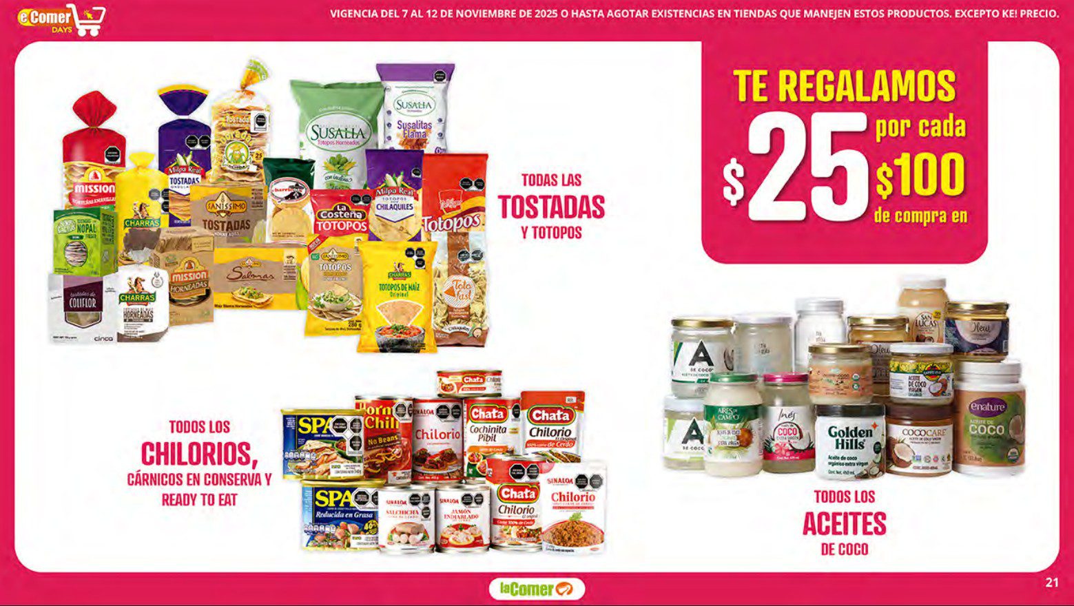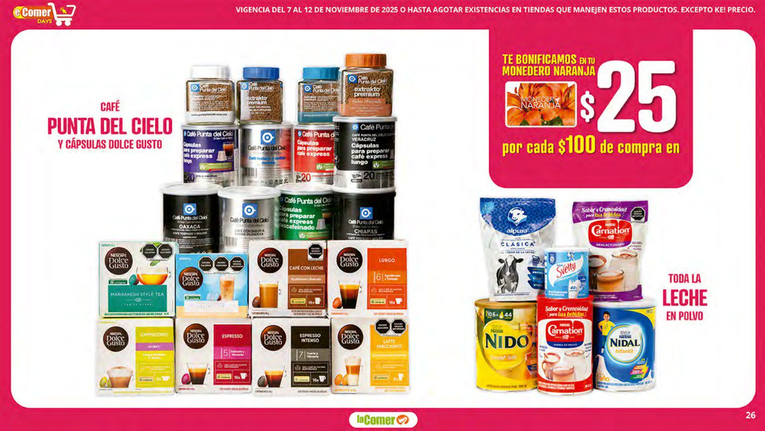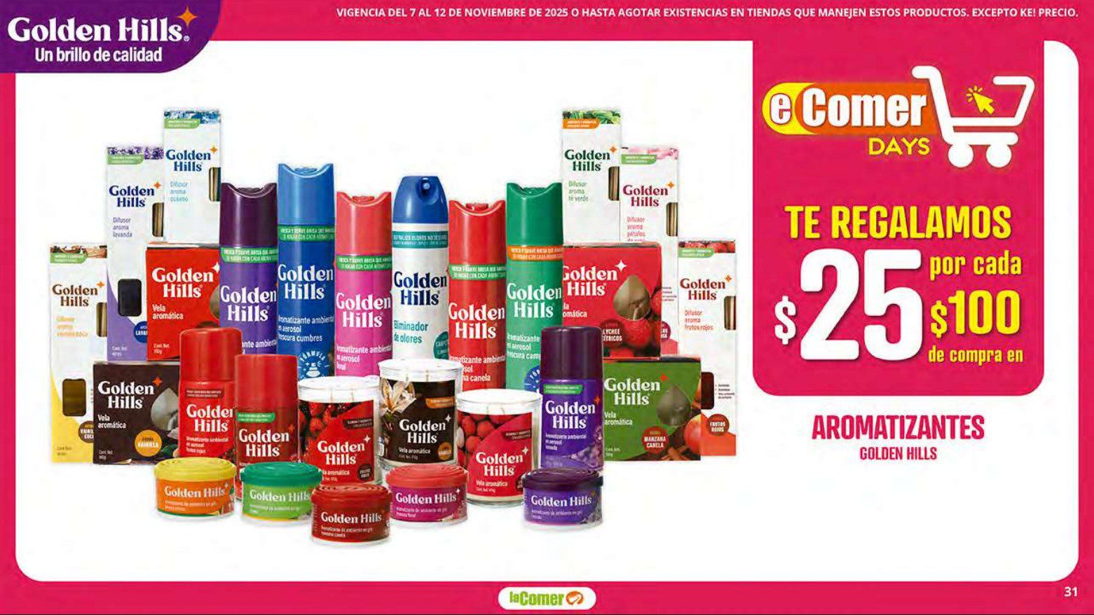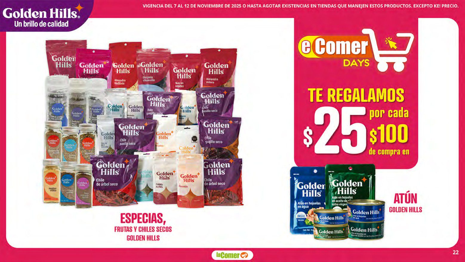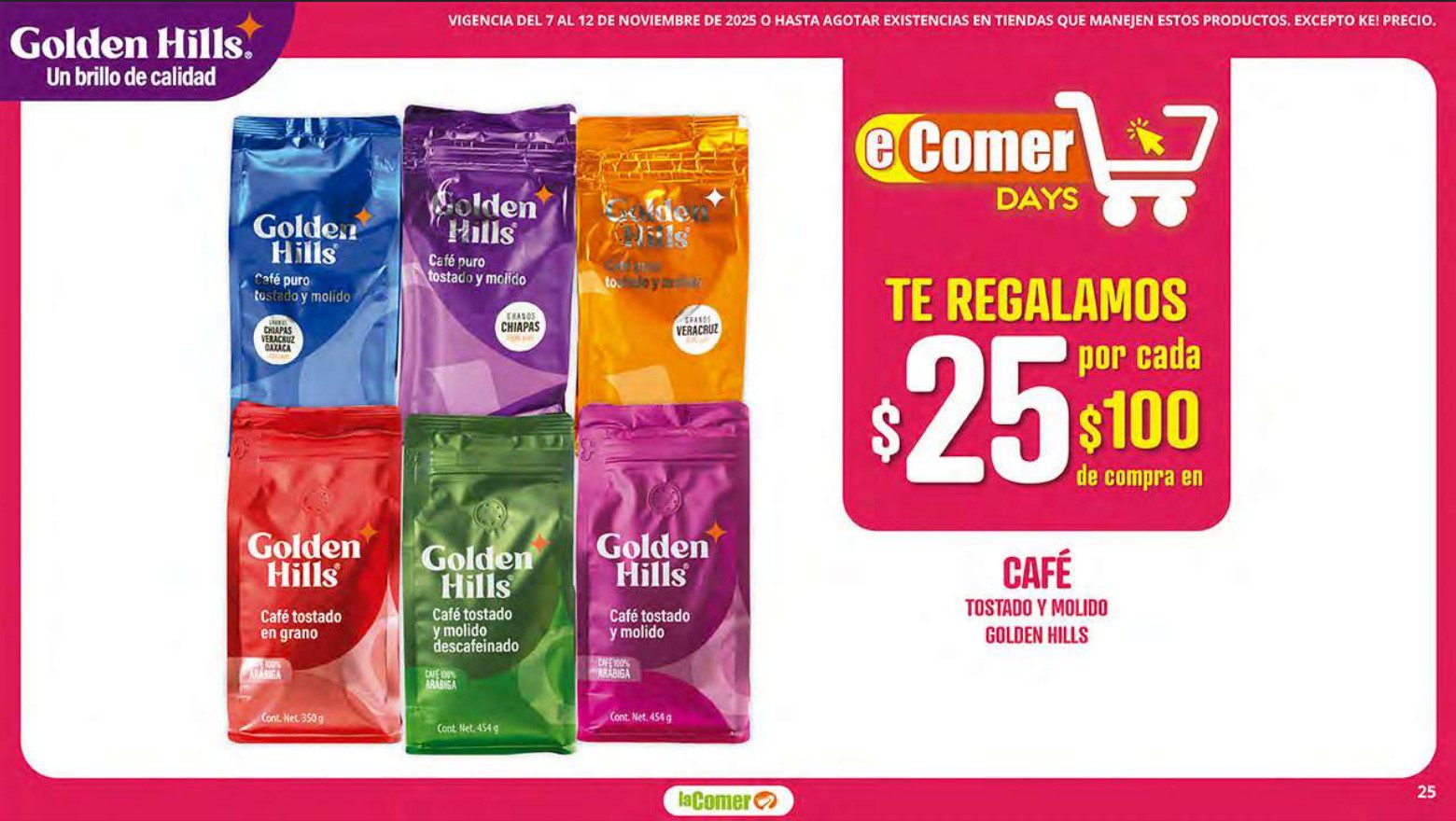 Les aviso que en La Comer continúa su promoción eComer Days 2025, en la que del 07 al 12 de noviembre de 2025 o hasta agotar existencias, encontrarán Bonificaciones en tu Monedero Naranja en la compra de determinados importes, Descuentos especiales en compras por determinadas cantidades, Precios especiales y Ofertas en su línea de productos Golden Hills; las ofertas son válidas en su tienda en línea lacomer.com.mx y ahora también en sus sucursales físicas participantes.