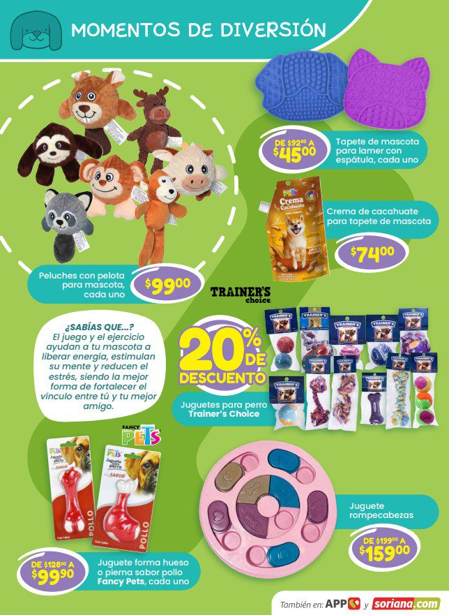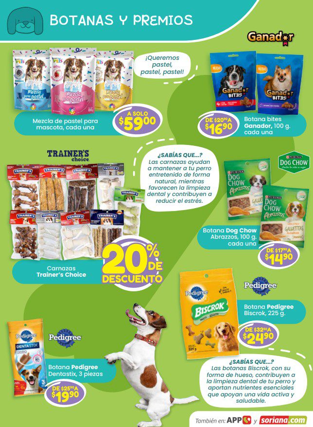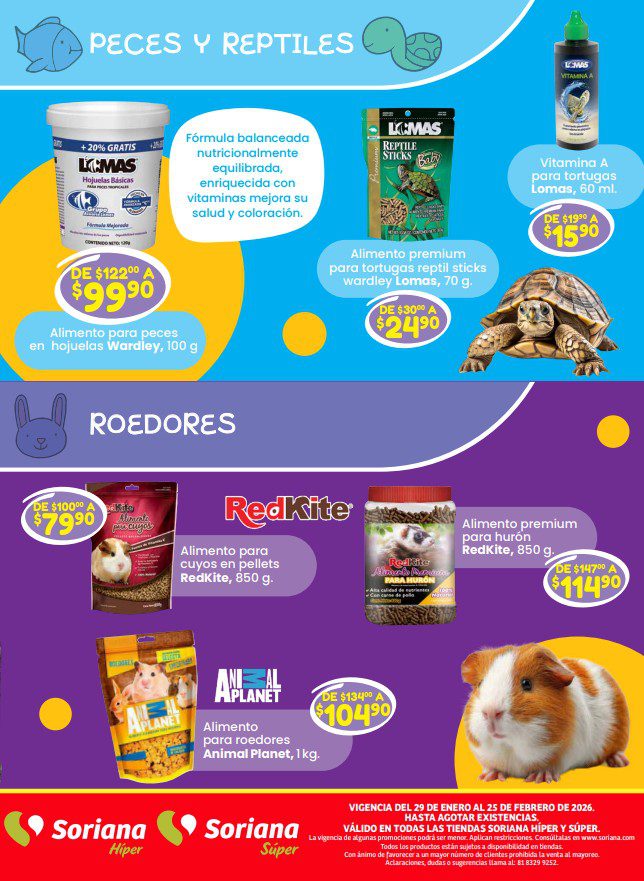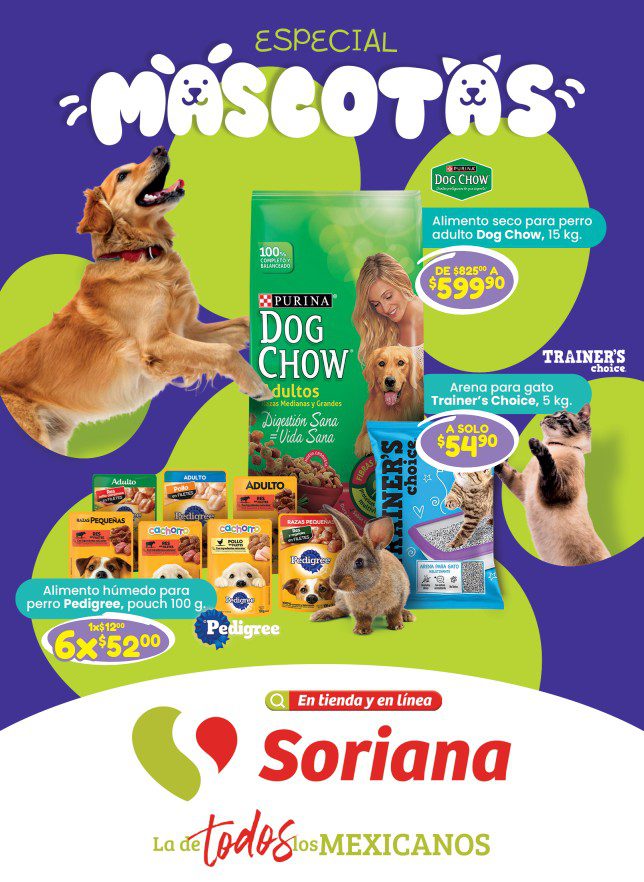 Hace un momento vi el folleto Especial Mascotas de Soriana Híper y Súper, que contiene sus ofertas válidas del 29 de enero al 25 de febrero de 2026 o agotar existencias, y en el que encontrarás hasta un 20% de descuento, Ahorros especiales en la compra de determinadas unidades y Precios especiales; las ofertas son válidas en artículos seleccionados y aplican en sus sucursales físicas y en su tienda en línea www.soriana.com.