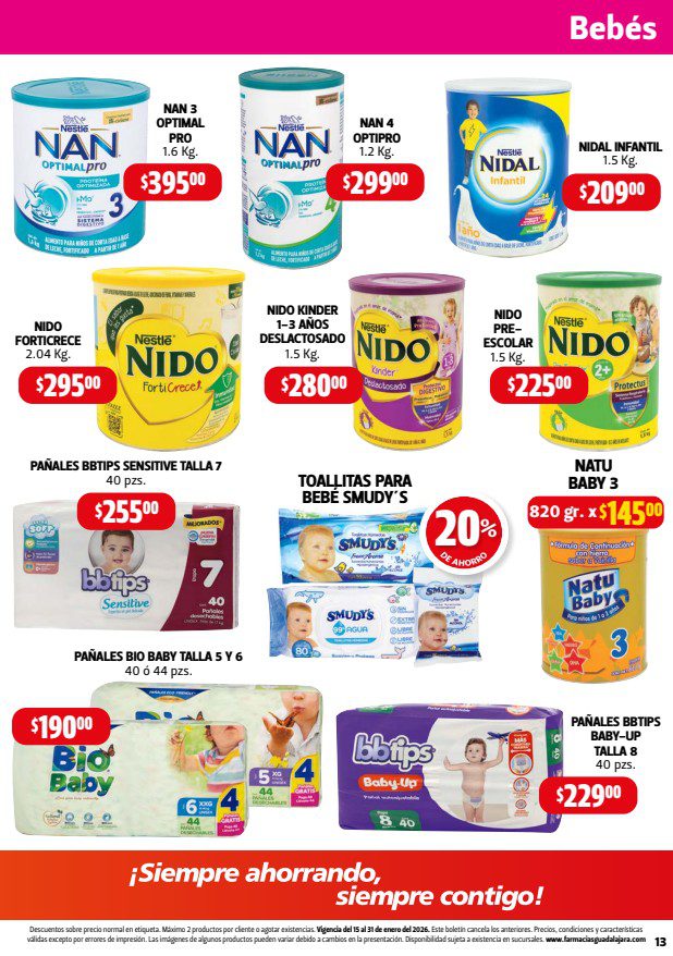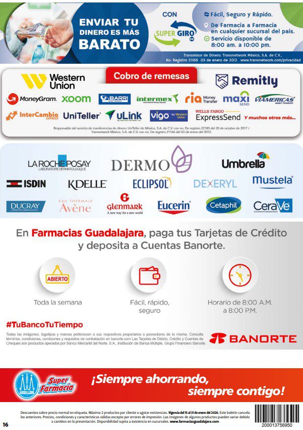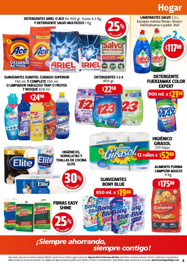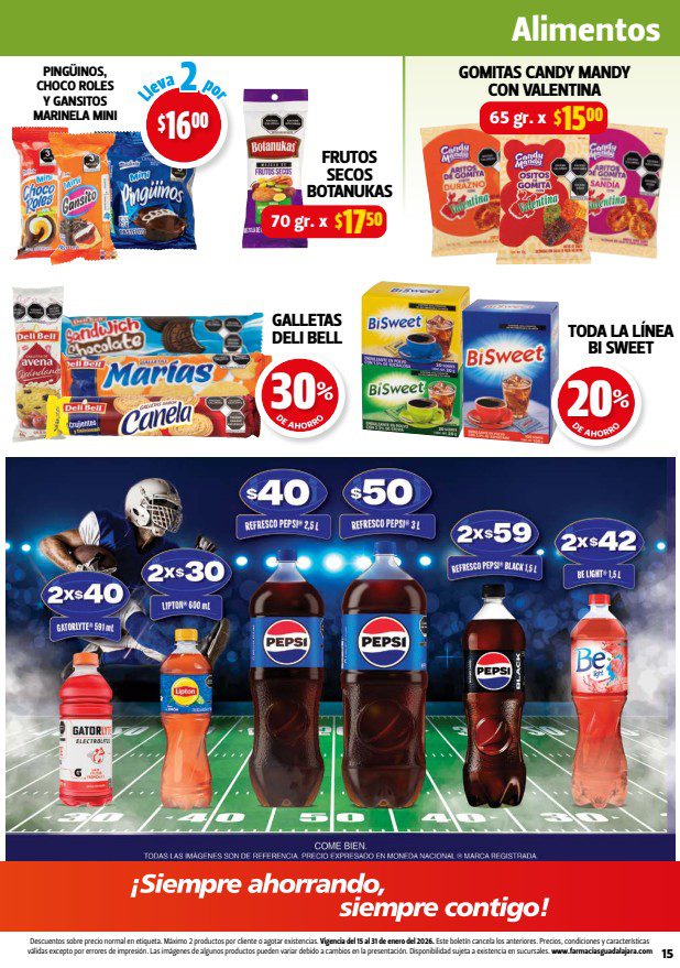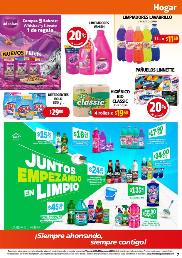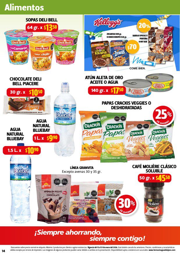 Hace un momento vi el folleto Básicos a Precios ¡Muy Bajos!, que las Farmacias Guadalajara publicaron y que contiene sus ofertas válidas del 15 al 31 de enero de 2026 en departamentos como Alimentos, Hogar, Bebés, Cuidado Personal y Medicina; en el que encontrarás Ahorros especiales en la compra de determinada cantidad de productos, hasta un 50% de descuento en productos participantes y Precios especiales en mercancía seleccionada. Aquí te dejo el folleto: