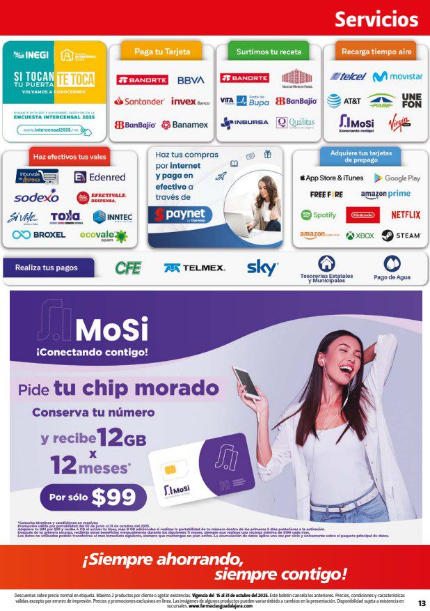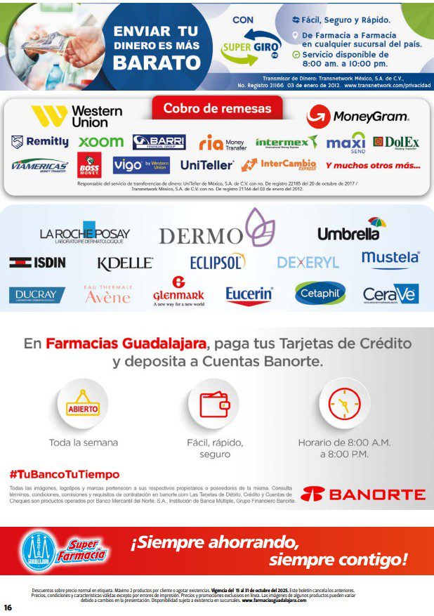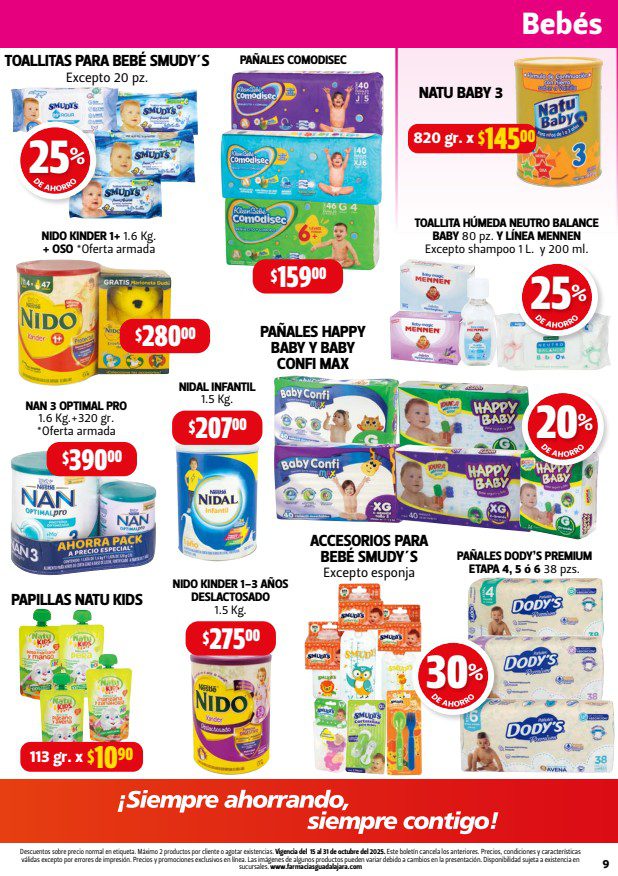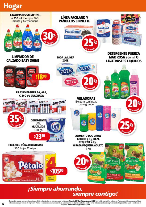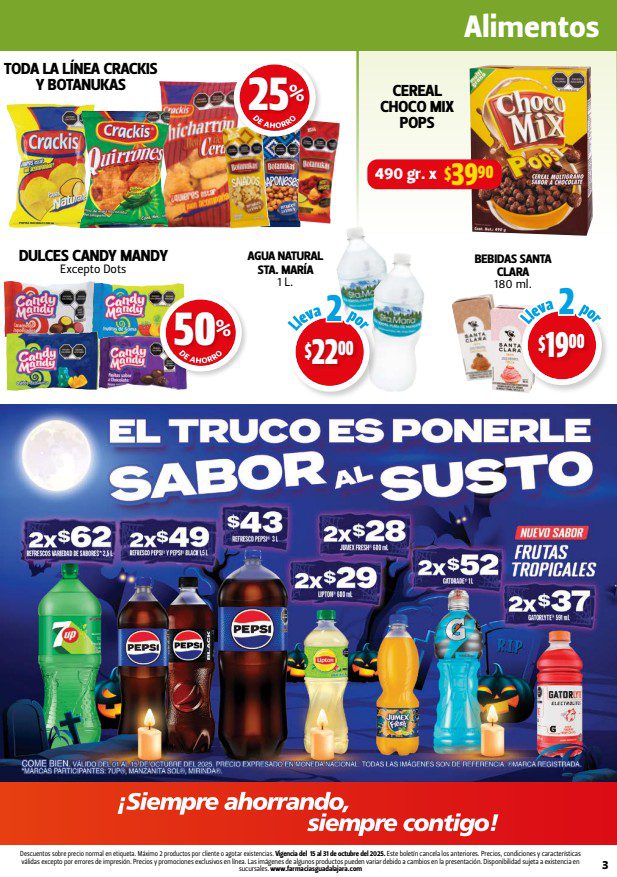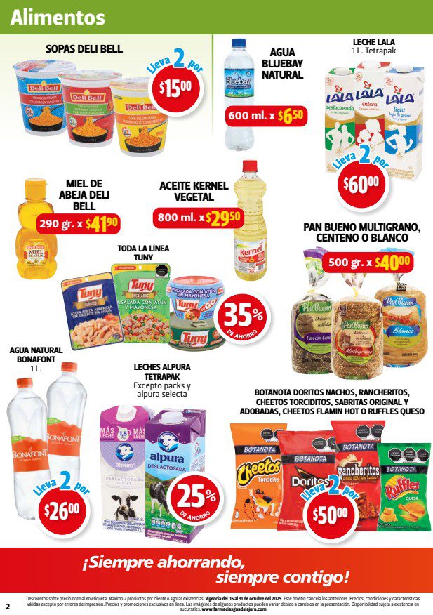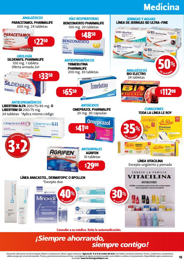 Hace un momento vi el folleto Las Torres del Ahorro, que las Farmacias Guadalajara publicaron y que contiene sus ofertas válidas del 15 al 31 de octubre de 2025 en departamentos como Alimentos, Hogar, Bebés, Cuidado Personal y Medicina; en el que encontrarás 3×2 en artículos seleccionados, Combina y Ahorra, Ahorros especiales en la compra de determinada cantidad de productos, hasta un 50% de descuento en productos participantes y Precios especiales en mercancía seleccionada. Aquí te dejo el folleto: