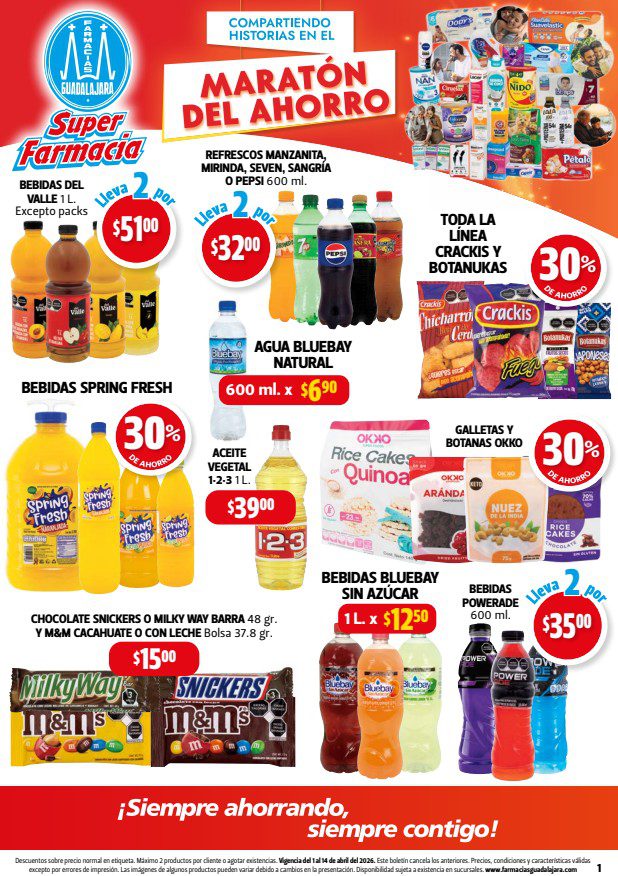 Hace un momento vi el folleto Maratón del Ahorro, que las Farmacias Guadalajara publicaron y que contiene sus ofertas válidas del 01 al 14 de abril de 2026 en departamentos como Alimentos, Hogar, Bebés, Cuidado Personal y Medicina; en el que encontrarás 2×1, 3×2 en artículos seleccionados, Ahorros especiales en la compra de determinada cantidad de productos, hasta un 50% de descuento en productos participantes y Precios especiales en mercancía seleccionada. Aquí te dejo el folleto: