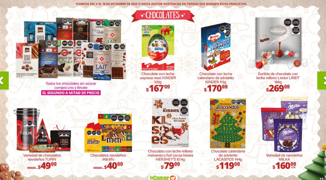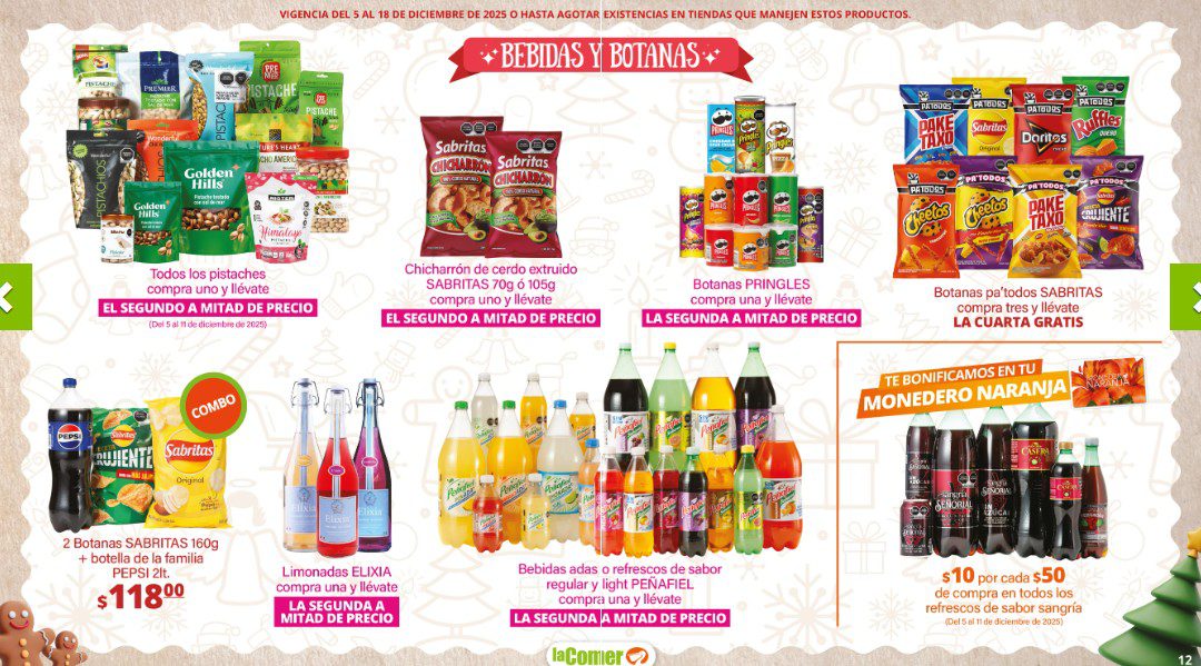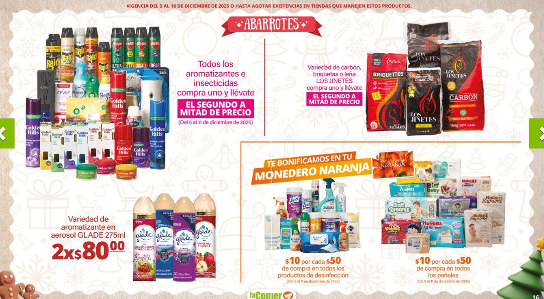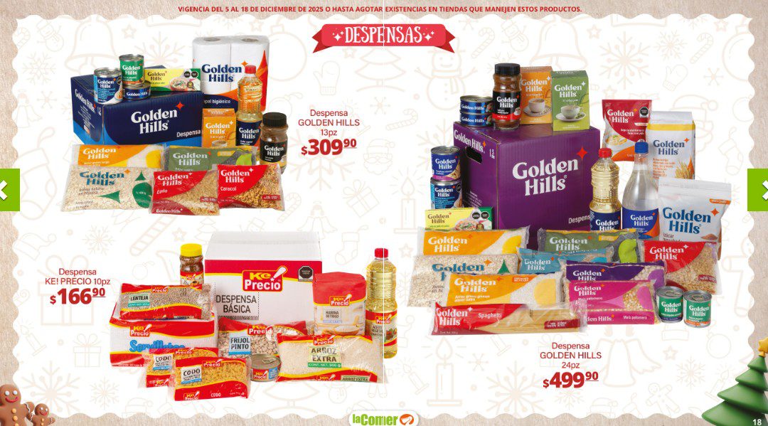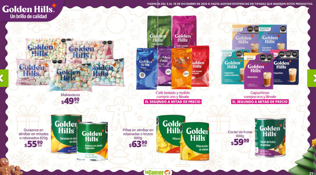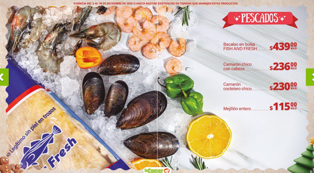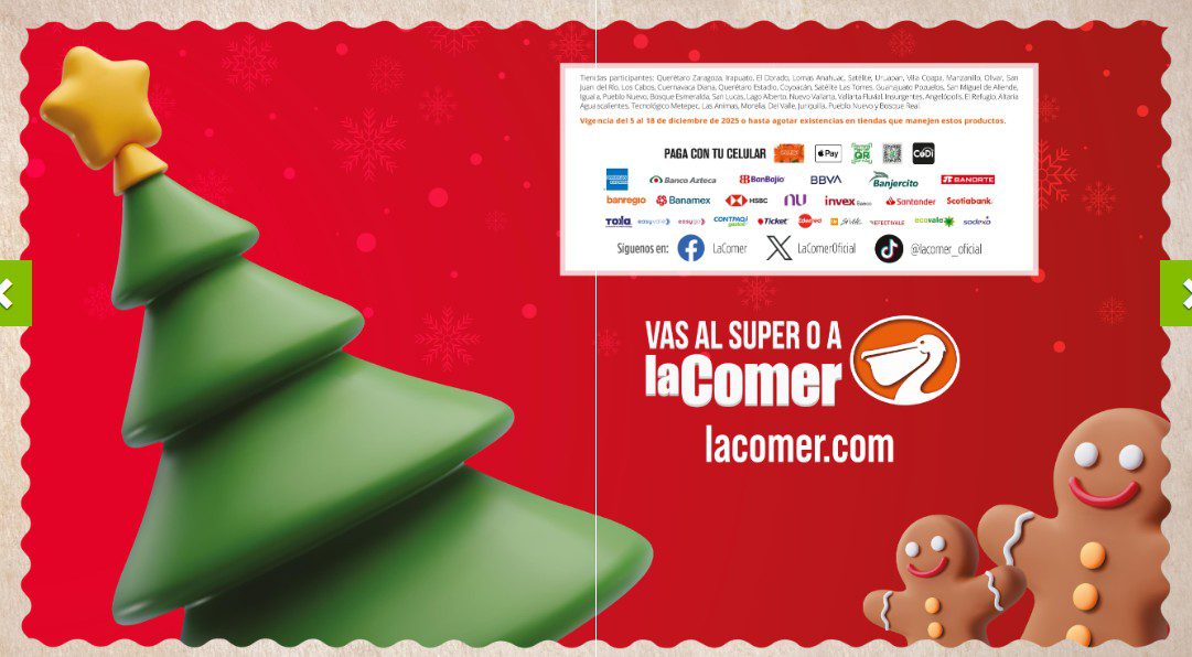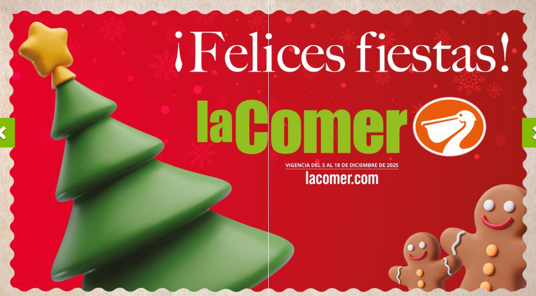 Te comparto el folleto Felices Fiestas por Navidad de La Comer y Fresko, que contiene sus ofertas válidas del 05 al 18 de diciembre de 2025 o hasta agotar existencias y en el que encontrarás un 4×3 (en la compra de 3, te llevas GRATIS el 4º), en la compra de 1 te llevas el Segundo a Mitad de precio, Bonificaciones en tu Monedero Naranja en la compra de determinados importes, Descuentos especiales en compras por determinadas cantidades, Despensas, Cenas Navideñas, Ahorros especiales en la compra de determinadas unidades, Precios especiales en productos seleccionados y Ofertas especiales en su línea de productos Golden Hills; las ofertas son válidas en su tienda en línea: lacomer.com.mx y en sus sucursales físicas y este es su folleto: