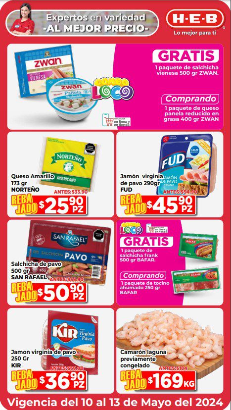 HEB ya publicó su folleto de Fin de semana ´por el Día de las Madres, con las ofertas tendrán del 10 al 13 de mayo de 2024 o hasta agotar existencias; algunas aplican solo en sucursales físicas y otras también en su tienda en línea heb.com.mx; encontrarás ofertas en sus categorías Combo Loco (producto Gratis en la compra de artículos participantes); Promo Ahorro (ahorros en dinero en la compra de determinados importes); Rebajado (descuentos o precios especiales en mercancía seleccionada); Ahorra Más (Combos a precios especiales); Segundo a Mitad de Precio (en la compra de 1 te dan el 2º a mitad de precio); Precio Bajo (Precios especiales) y Promociones especiales si pagas con tu tarjeta de crédito HEB-Afirme. Éste es el folleto: