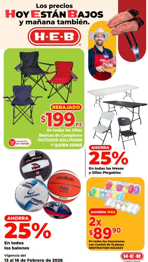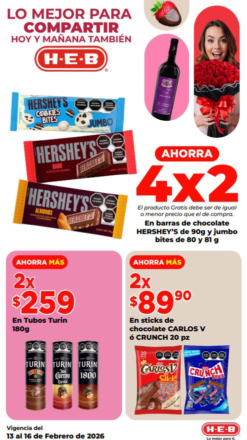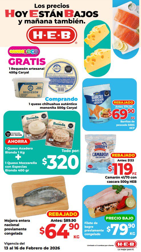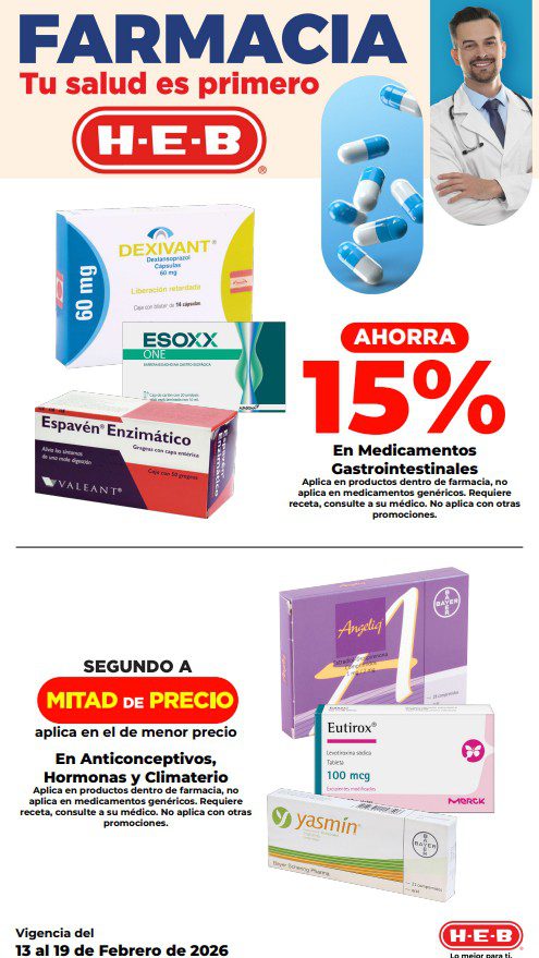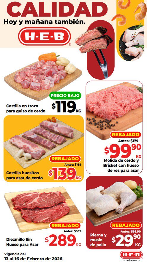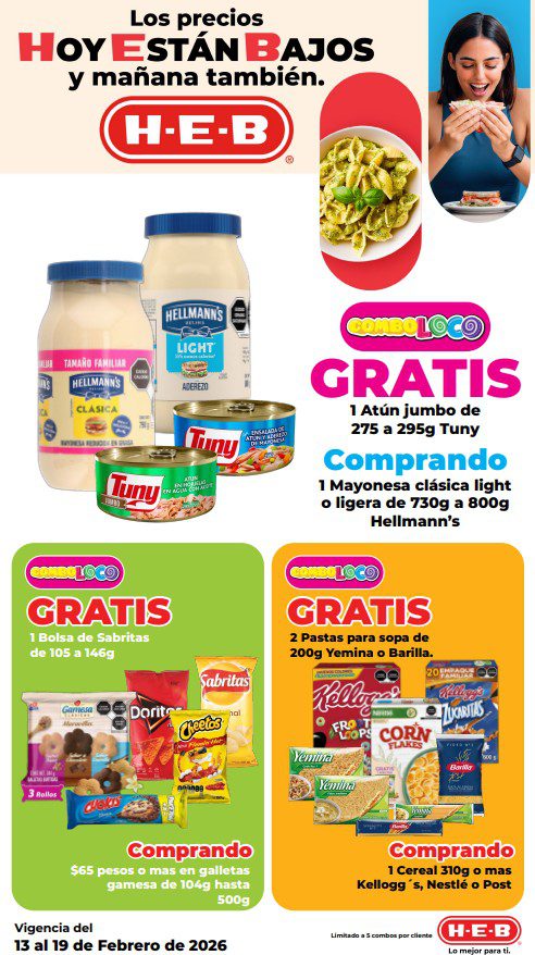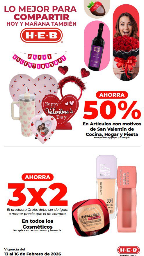 HEB ya publicó su folleto de Fin de semana: Lo Mejor para Compartir Hoy y Mañana También, con las ofertas tendrán del 13 al 16 de febrero de 2026 o hasta agotar existencias; algunas aplican solo en sucursales físicas y otras también en su tienda en línea heb.com.mx; encontrarás ofertas en sus categorías Combo Loco (producto Gratis en la compra de artículos participantes); 2×1; 3×2; 4×2; Promo Ahorro (ahorros en dinero en la compra de determinados importes); Rebajado (Descuentos o precios especiales en mercancía seleccionada); Ahorra Más (Combos a precios especiales); hasta un 50% de descuento; Segundo a Mitad de Precio (en la compra de 1 te dan el 2º a mitad de precio); Precio Bajo (Precios especiales); Combos (Ahorros especiales en la compra de mercancía participante); Promociones especiales si pagas con tu tarjeta de crédito HEB-Afirme, en Farmacia, Producto Gratis en la compra de determinadas unidades de medicamentos participantes y en su Gran Liquidación de Temporada, hasta un 50% de descuento en variedad de Ropa Otoño-Invierno para toda la Familia. Éste es el folleto: