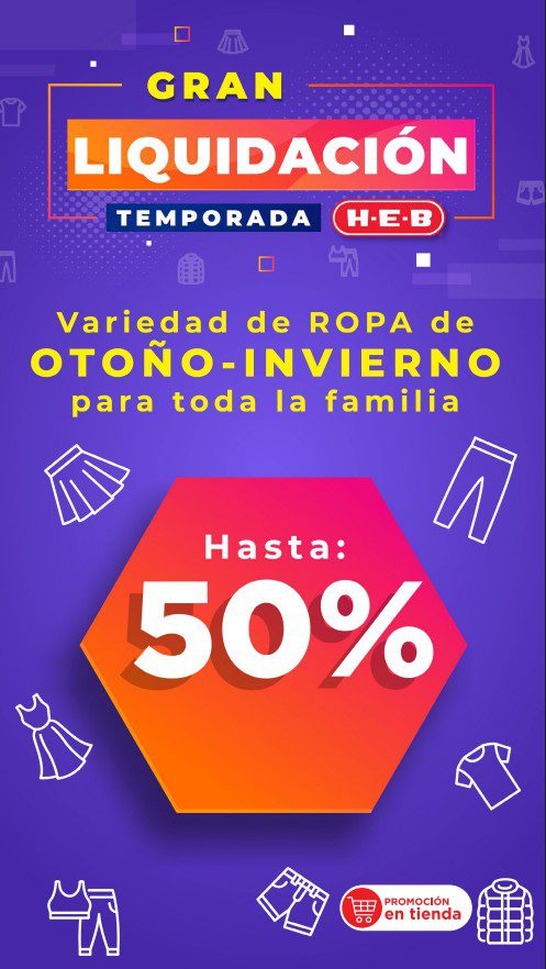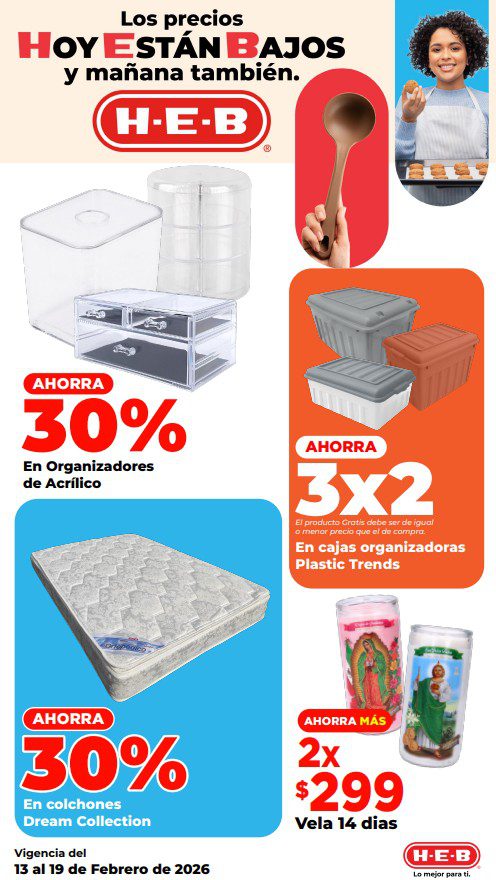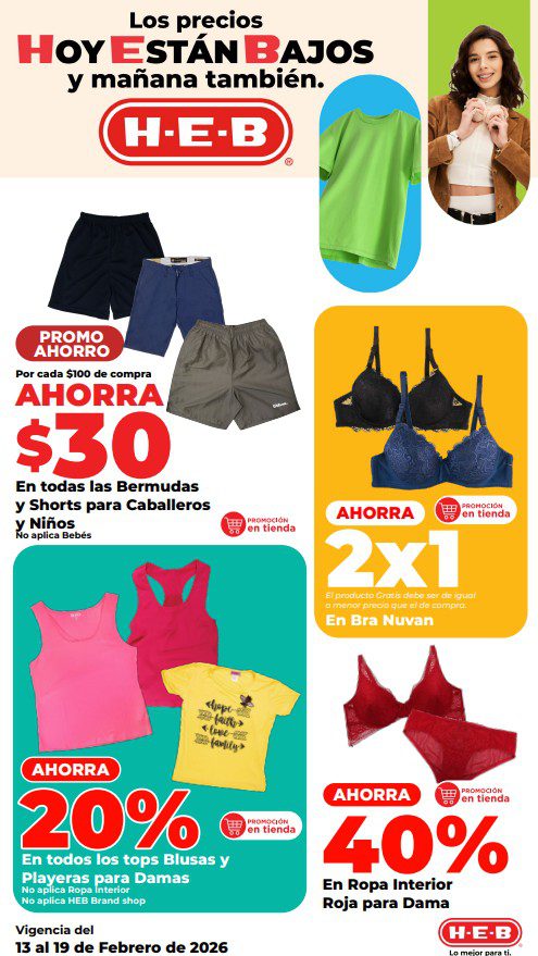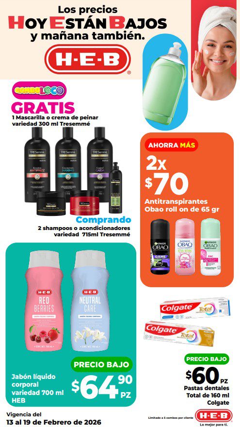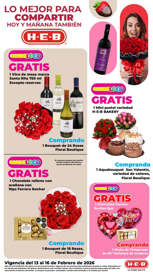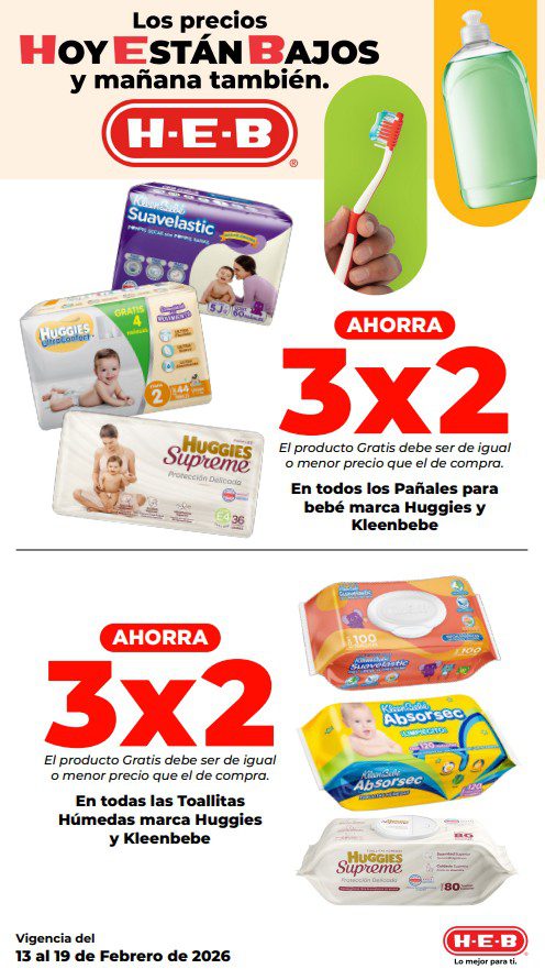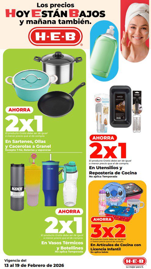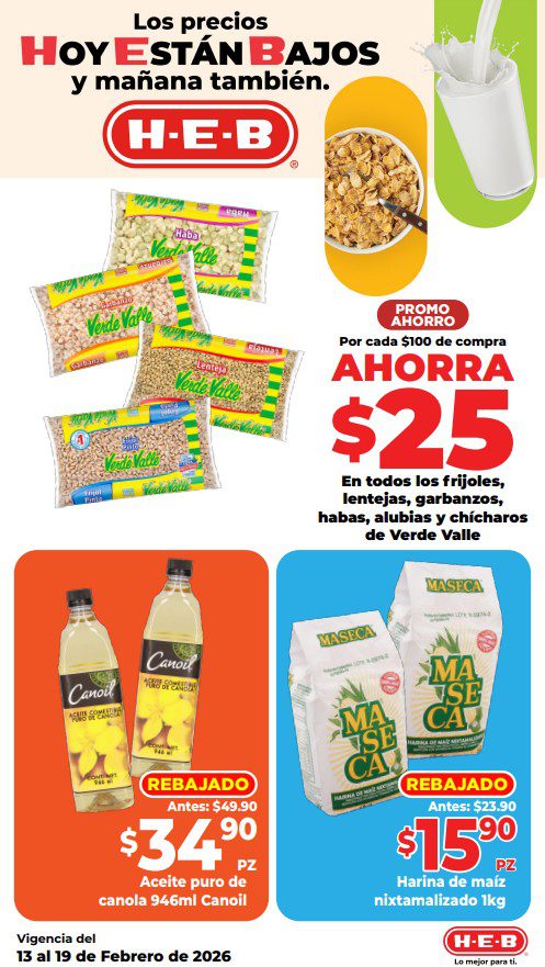 HEB ya publicó su folleto de Fin de semana: Lo Mejor para Compartir Hoy y Mañana También, con las ofertas tendrán del 13 al 16 de febrero de 2026 o hasta agotar existencias; algunas aplican solo en sucursales físicas y otras también en su tienda en línea heb.com.mx; encontrarás ofertas en sus categorías Combo Loco (producto Gratis en la compra de artículos participantes); 2×1; 3×2; 4×2; Promo Ahorro (ahorros en dinero en la compra de determinados importes); Rebajado (Descuentos o precios especiales en mercancía seleccionada); Ahorra Más (Combos a precios especiales); hasta un 50% de descuento; Segundo a Mitad de Precio (en la compra de 1 te dan el 2º a mitad de precio); Precio Bajo (Precios especiales); Combos (Ahorros especiales en la compra de mercancía participante); Promociones especiales si pagas con tu tarjeta de crédito HEB-Afirme, en Farmacia, Producto Gratis en la compra de determinadas unidades de medicamentos participantes y en su Gran Liquidación de Temporada, hasta un 50% de descuento en variedad de Ropa Otoño-Invierno para toda la Familia. Éste es el folleto: