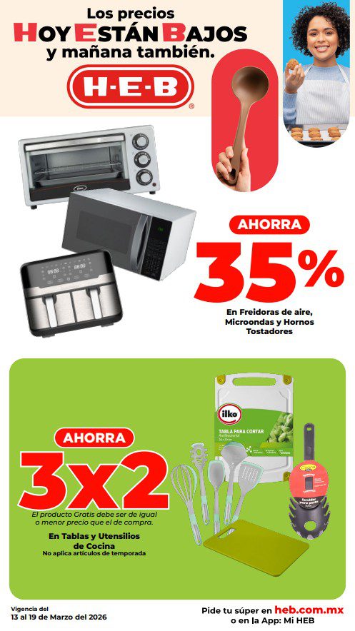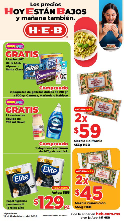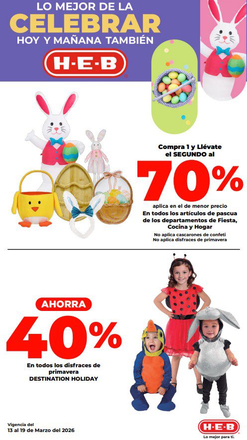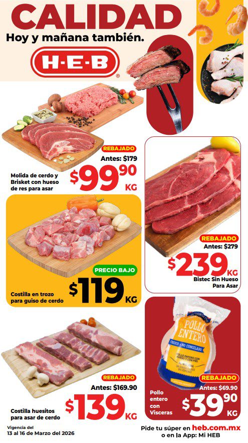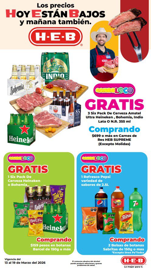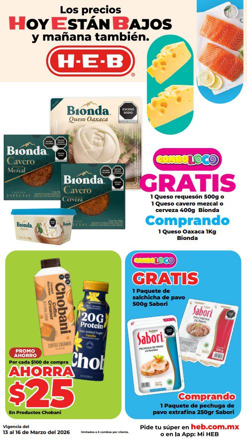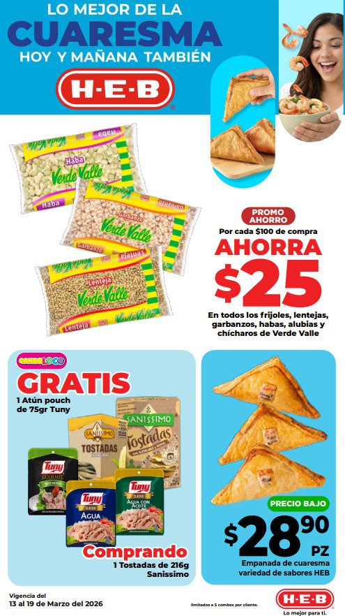 HEB ya publicó su folleto de Fin de semana: Frescura en Cuaresma Hoy y Mañana También, con las ofertas tendrán del 13 al 16 de marzo de 2026 o hasta agotar existencias; algunas aplican solo en sucursales físicas y otras también en su tienda en línea heb.com.mx; encontrarás ofertas en sus categorías Combo Loco (producto Gratis en la compra de artículos participantes); 3×2; 4×3; Promo Ahorro (ahorros en dinero en la compra de determinados importes); Rebajado (Descuentos o precios especiales en mercancía seleccionada); Ahorra Más (Combos a precios especiales); hasta un 40% de descuento; Segundo a Mitad de Precio (en la compra de 1 te dan el 2º a mitad de precio); el Segundo artículo al 70% (el descuento aplica en el producto de menor precio); Precio Bajo (Precios especiales); Promociones especiales si pagas con tu tarjeta de crédito HEB-Afirme y en su Gran Liquidación de Temporada, hasta un 70% de descuento en variedad de Ropa Otoño-Invierno para toda la Familia. Éste es el folleto: