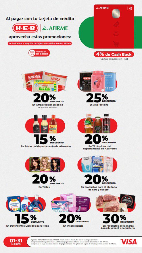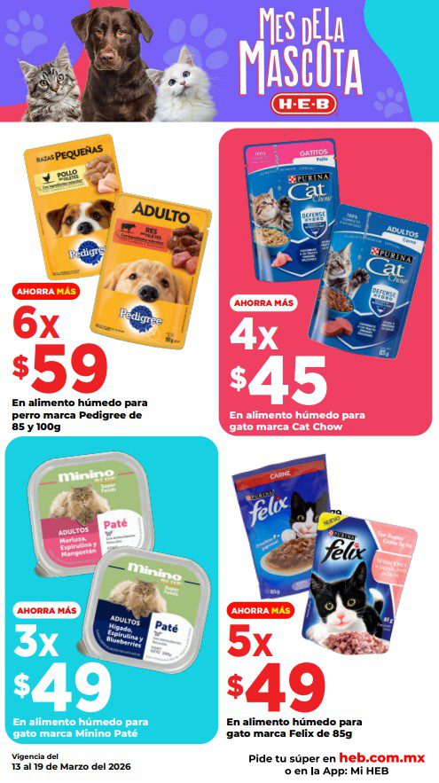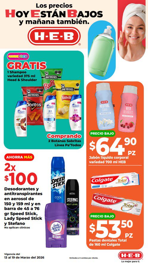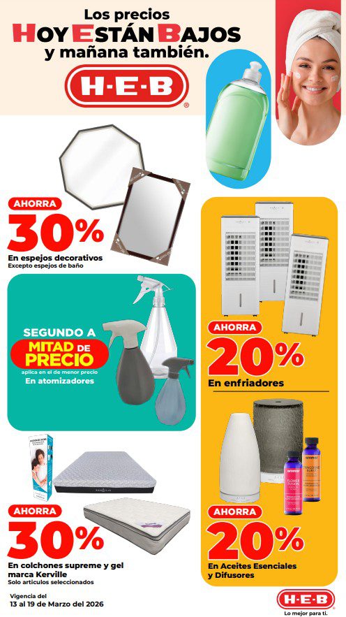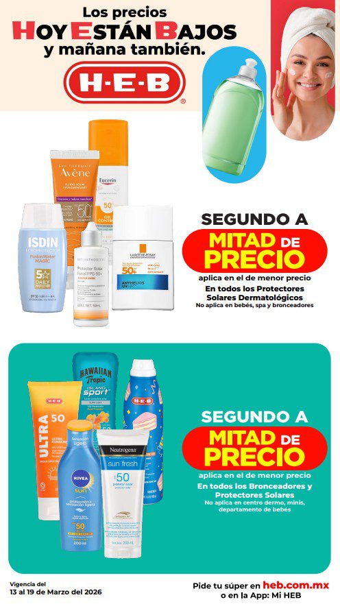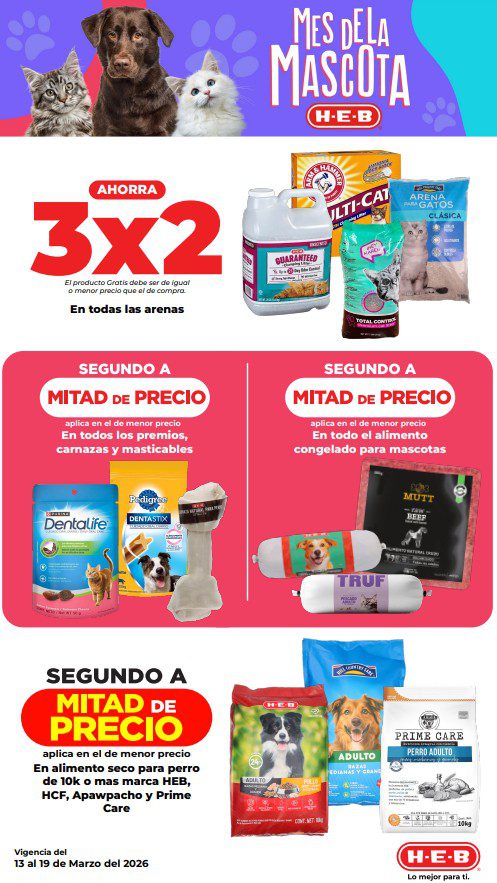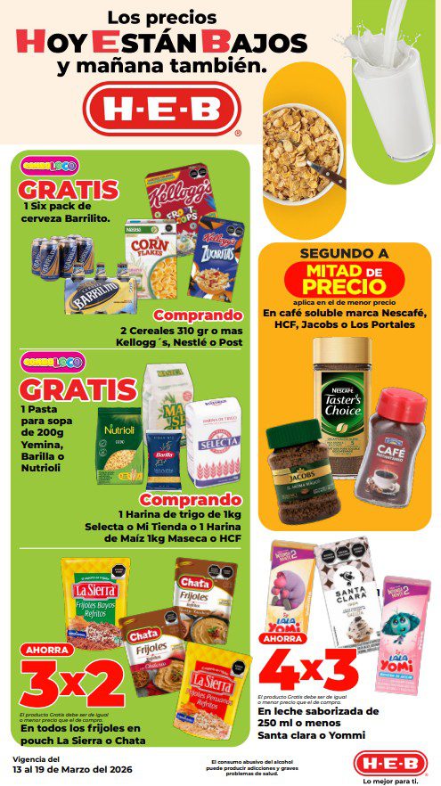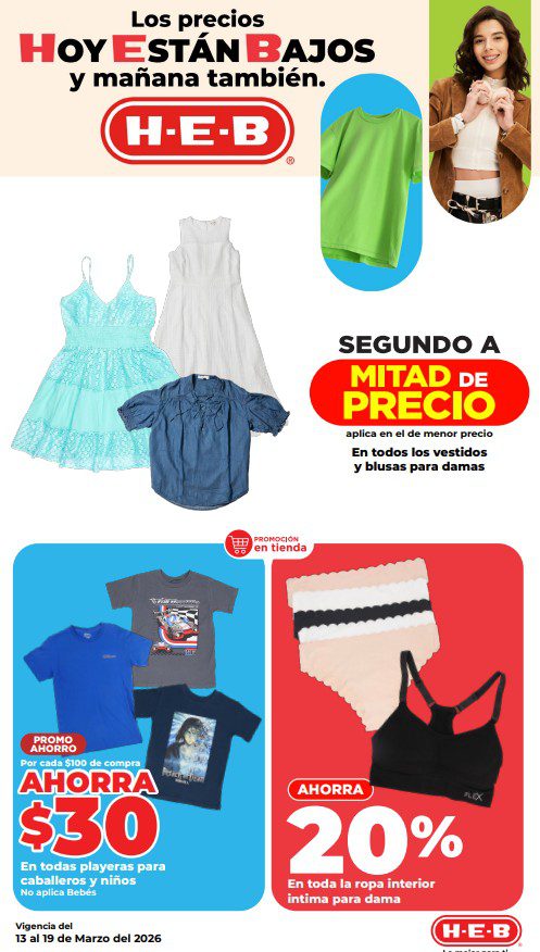 HEB ya publicó su folleto de Fin de semana: Frescura en Cuaresma Hoy y Mañana También, con las ofertas tendrán del 13 al 16 de marzo de 2026 o hasta agotar existencias; algunas aplican solo en sucursales físicas y otras también en su tienda en línea heb.com.mx; encontrarás ofertas en sus categorías Combo Loco (producto Gratis en la compra de artículos participantes); 3×2; 4×3; Promo Ahorro (ahorros en dinero en la compra de determinados importes); Rebajado (Descuentos o precios especiales en mercancía seleccionada); Ahorra Más (Combos a precios especiales); hasta un 40% de descuento; Segundo a Mitad de Precio (en la compra de 1 te dan el 2º a mitad de precio); el Segundo artículo al 70% (el descuento aplica en el producto de menor precio); Precio Bajo (Precios especiales); Promociones especiales si pagas con tu tarjeta de crédito HEB-Afirme y en su Gran Liquidación de Temporada, hasta un 70% de descuento en variedad de Ropa Otoño-Invierno para toda la Familia. Éste es el folleto: