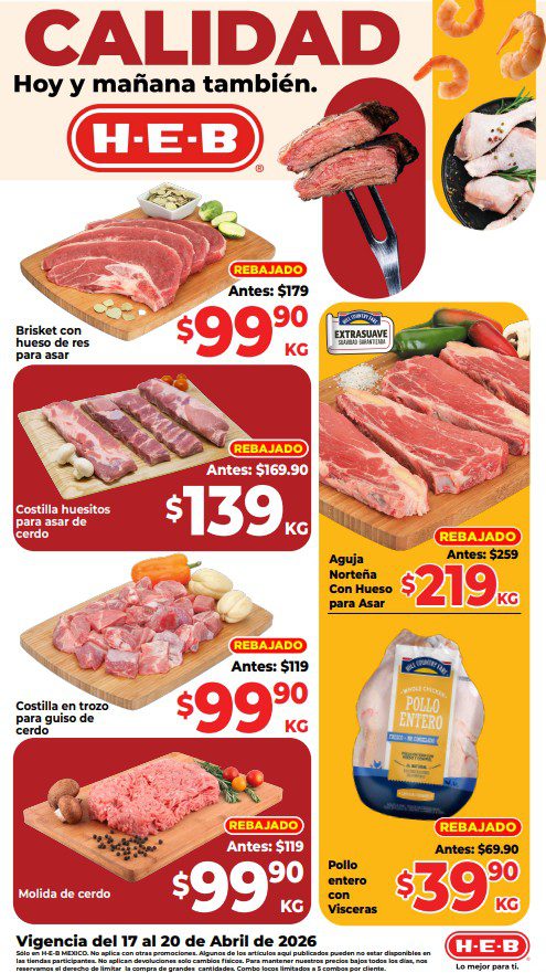 HEB ya publicó su folleto de Fin de semana: Calidad Hoy y Mañana También, con las ofertas tendrán del 17 al 20 de abril de 2026 o hasta agotar existencias; algunas aplican solo en sucursales físicas y otras también en su tienda en línea heb.com.mx; encontrarás ofertas en sus categorías Combo Loco (producto Gratis en la compra de artículos participantes); 2×1; 3×2; Promo Ahorro (ahorros en dinero en la compra de determinados importes); Rebajado (Descuentos o precios especiales en mercancía seleccionada); Ahorra Más (Combos a precios especiales); hasta un 30% de descuento; Ahorros en la compra de determinadas unidades; Segundo a Mitad de Precio (en la compra de 1 te dan el 2º a mitad de precio); Precio Bajo (Precios especiales); Promociones especiales si pagas con tu tarjeta de crédito HEB-Afirme y en Farmacia, Producto Gratis en la compra de determinadas unidades de medicamentos participantes. Éste es el folleto: