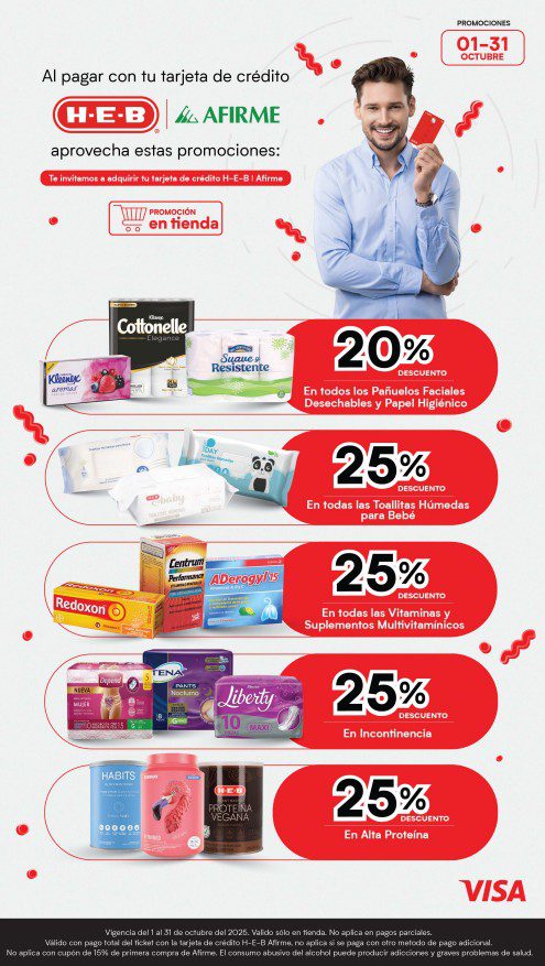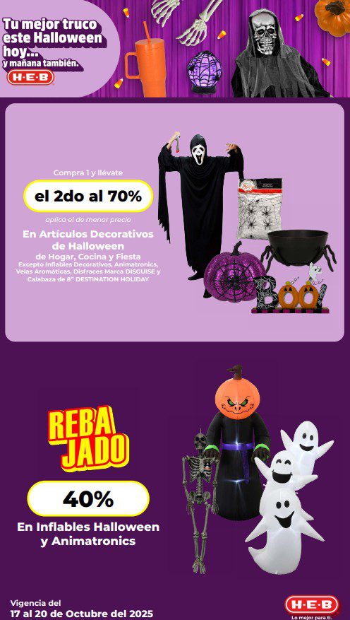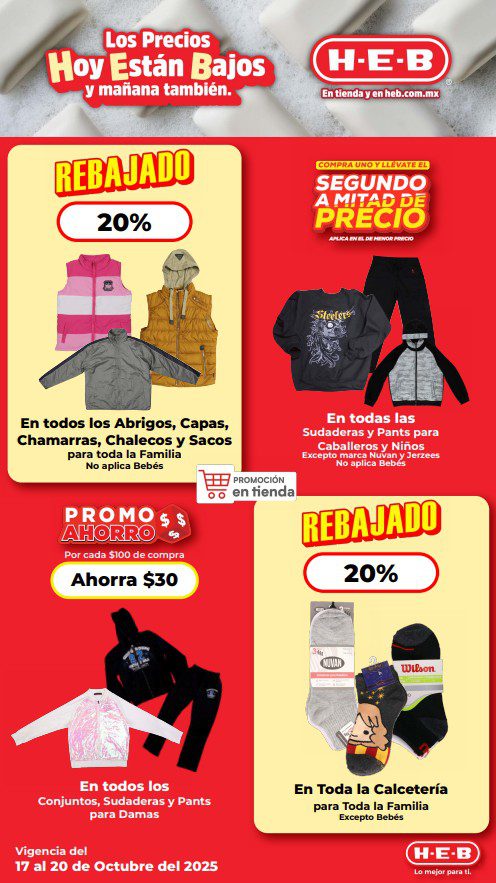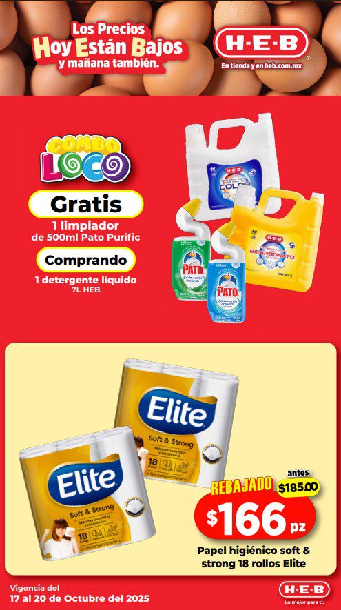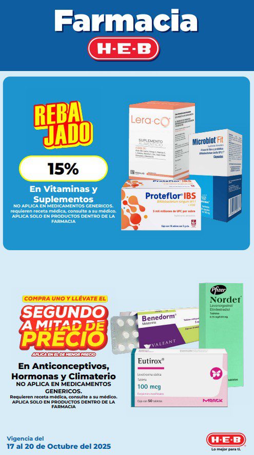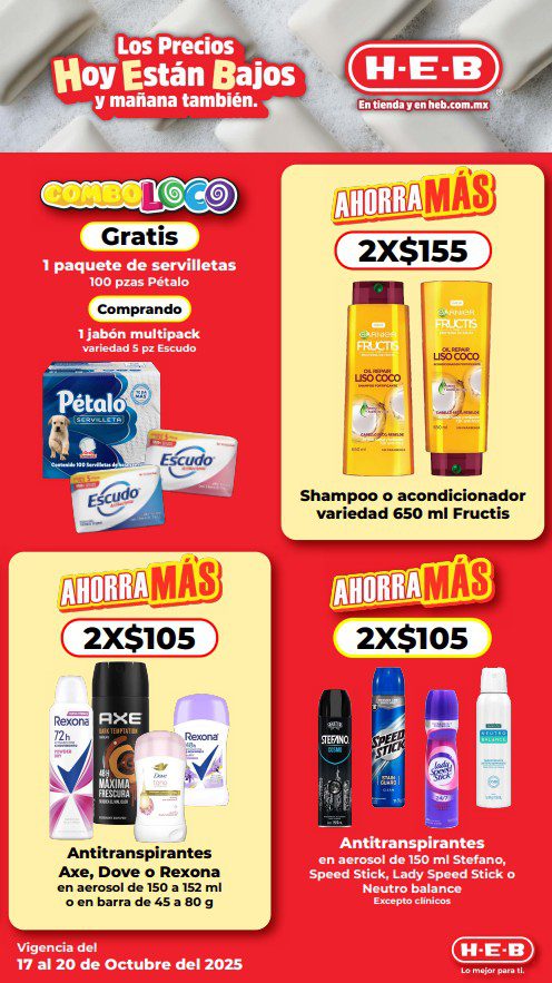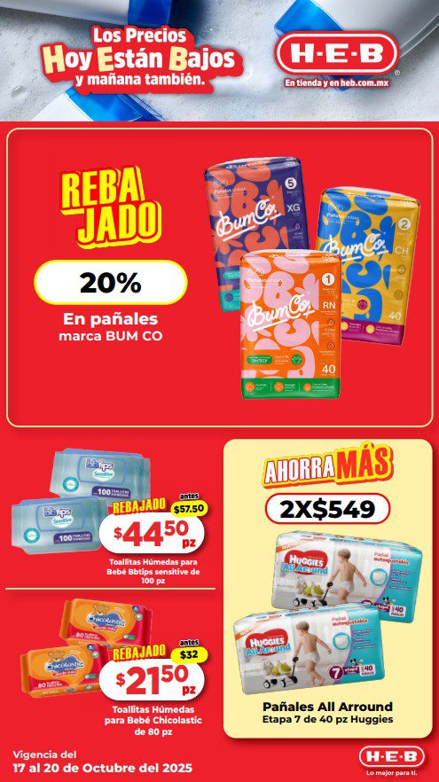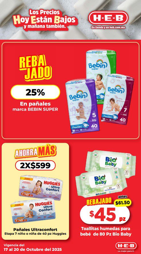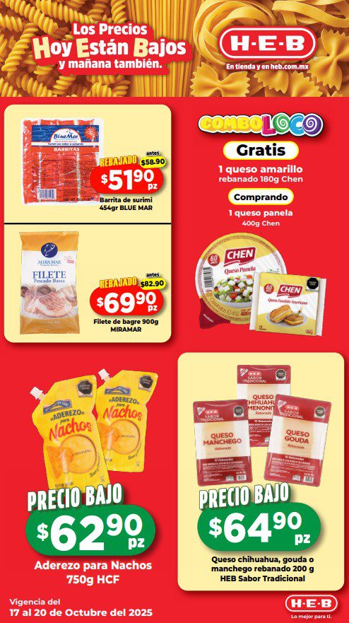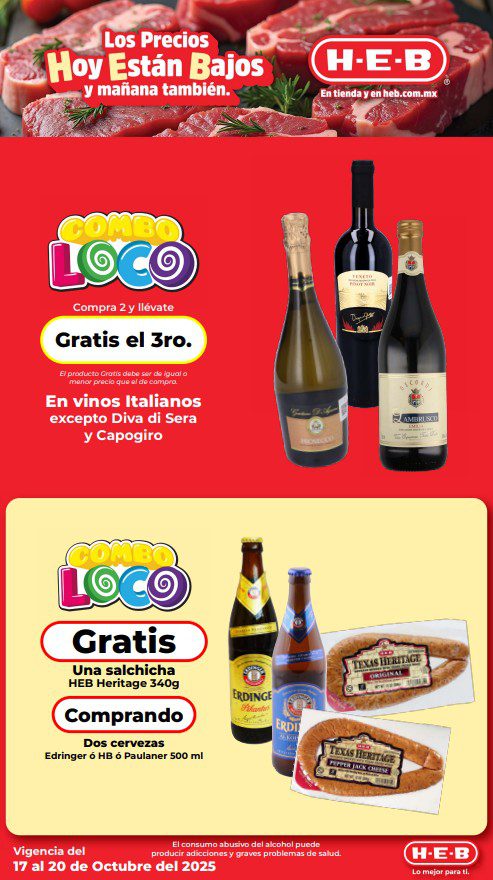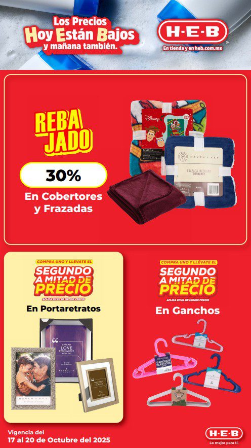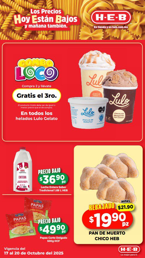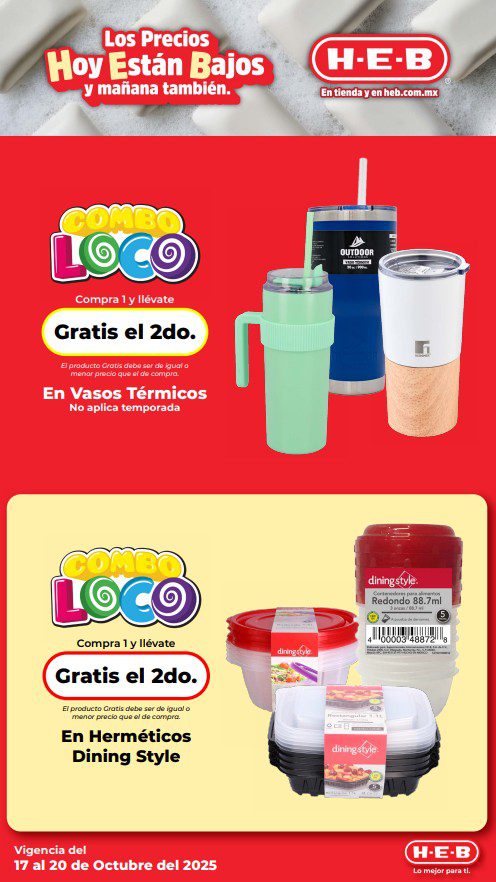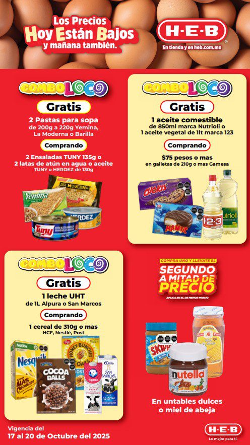 HEB ya publicó su folleto de Fin de semana los Precios Hoy están Bajos… y Mañana También, con las ofertas tendrán del 17 al 20 de octubre de 2025 o hasta agotar existencias; algunas aplican solo en sucursales físicas y otras también en su tienda en línea heb.com.mx; encontrarás ofertas en sus categorías Combo Loco (producto Gratis en la compra de artículos participantes); Promo Ahorro (ahorros en dinero en la compra de determinados importes); Rebajado (descuentos o precios especiales en mercancía seleccionada); Ahorra Más (Combos a precios especiales); Segundo a Mitad de Precio (en la compra de 1 te dan el 2º a mitad de precio); el Segundo artículo al 70% (el descuento aplica en el producto de menor precio); Precio Bajo (Precios especiales); Promociones especiales si pagas con tu tarjeta de crédito HEB-Afirme y en Farmacia, Producto Gratis en la compra de determinadas unidades de medicamentos participantes. Éste es el folleto: