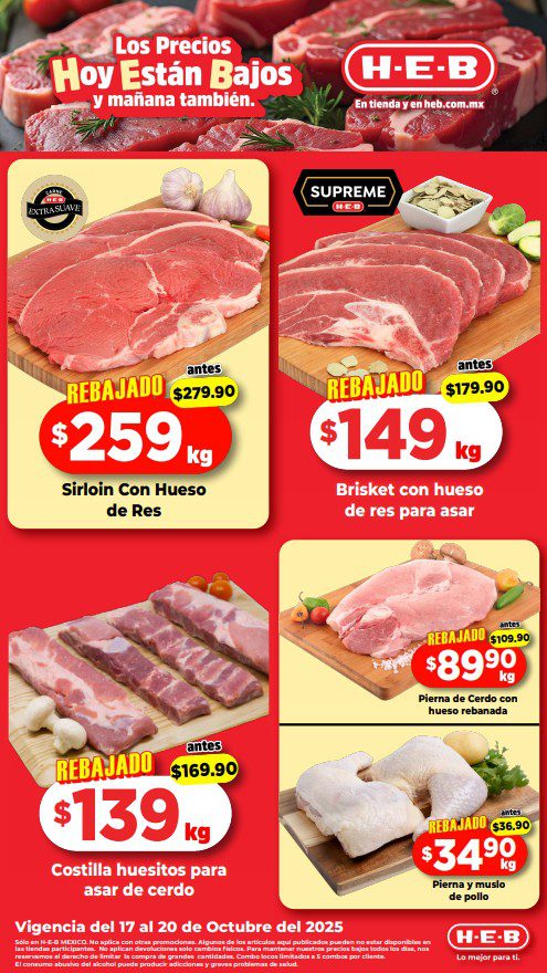 HEB ya publicó su folleto de Fin de semana los Precios Hoy están Bajos… y Mañana También, con las ofertas tendrán del 17 al 20 de octubre de 2025 o hasta agotar existencias; algunas aplican solo en sucursales físicas y otras también en su tienda en línea heb.com.mx; encontrarás ofertas en sus categorías Combo Loco (producto Gratis en la compra de artículos participantes); Promo Ahorro (ahorros en dinero en la compra de determinados importes); Rebajado (descuentos o precios especiales en mercancía seleccionada); Ahorra Más (Combos a precios especiales); Segundo a Mitad de Precio (en la compra de 1 te dan el 2º a mitad de precio); el Segundo artículo al 70% (el descuento aplica en el producto de menor precio); Precio Bajo (Precios especiales); Promociones especiales si pagas con tu tarjeta de crédito HEB-Afirme y en Farmacia, Producto Gratis en la compra de determinadas unidades de medicamentos participantes. Éste es el folleto: