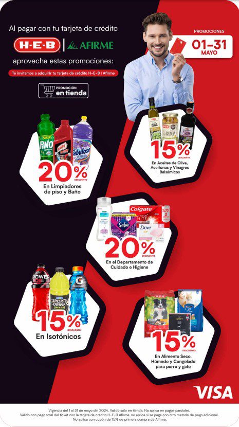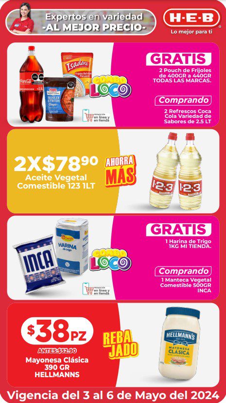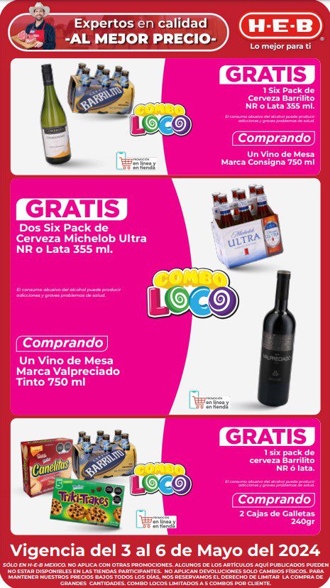 HEB ya publicó su folleto de Fin de semana Expertos en Calidad al Mejor Precio, con las ofertas tendrán del 03 al 06 de mayo de 2024 o hasta agotar existencias; algunas aplican solo en sucursales físicas y otras también en su tienda en línea heb.com.mx; encontrarás ofertas en sus categorías Combo Loco (producto Gratis en la compra de artículos participantes); Promo Ahorro (ahorros en dinero en la compra de determinados importes); Rebajado (descuentos o precios especiales en mercancía seleccionada); Ahorra Más (Combos a precios especiales); Segundo a Mitad de Precio (en la compra de 1 te dan el 2º a mitad de precio) y Promociones especiales si pagas con tu tarjeta de crédito HEB-Afirme. Éste es el folleto: