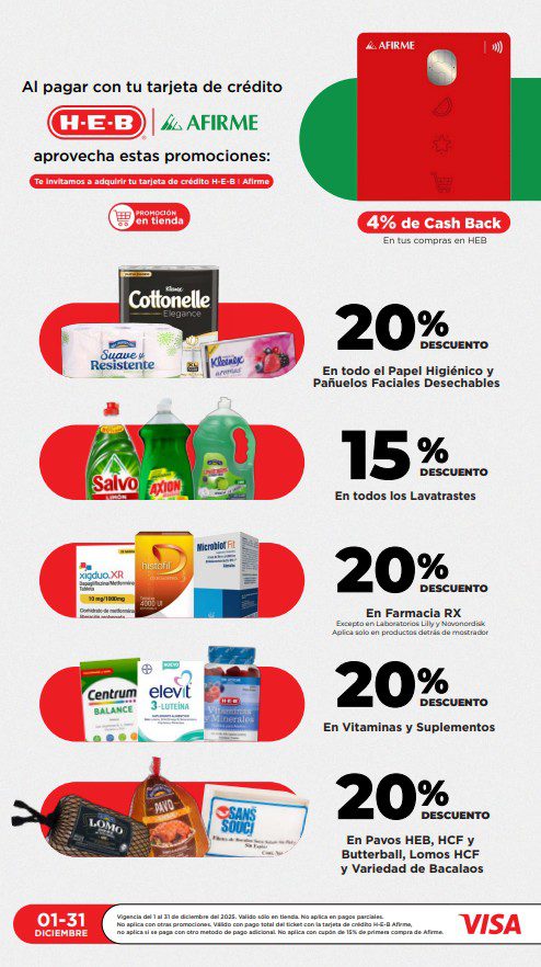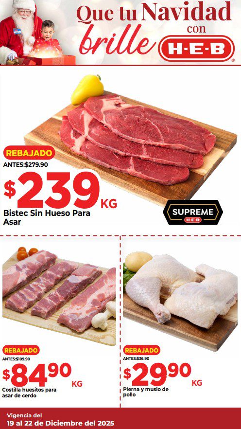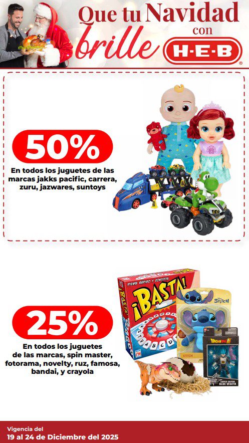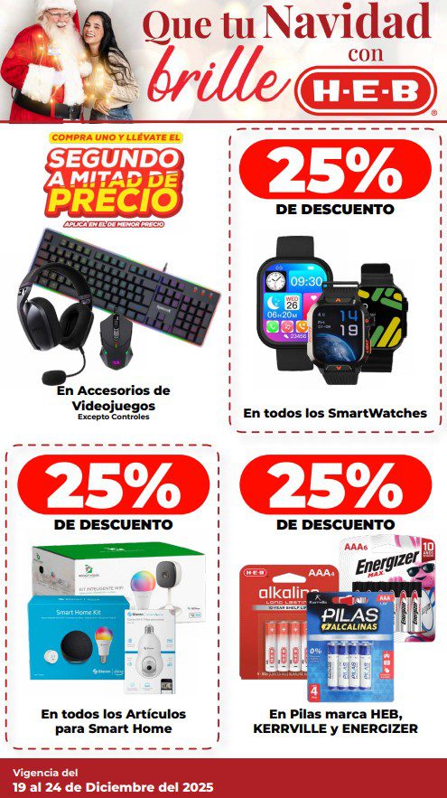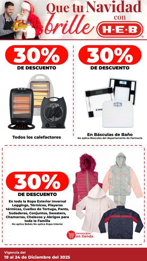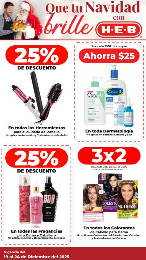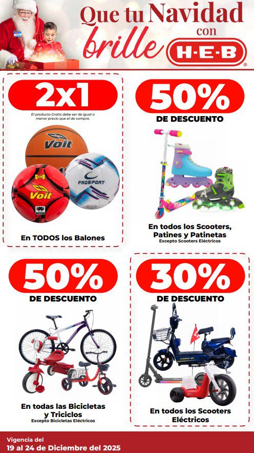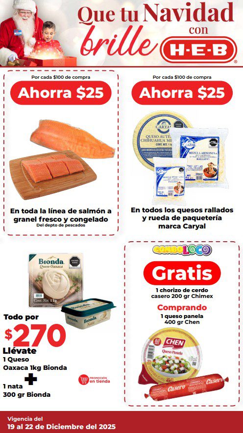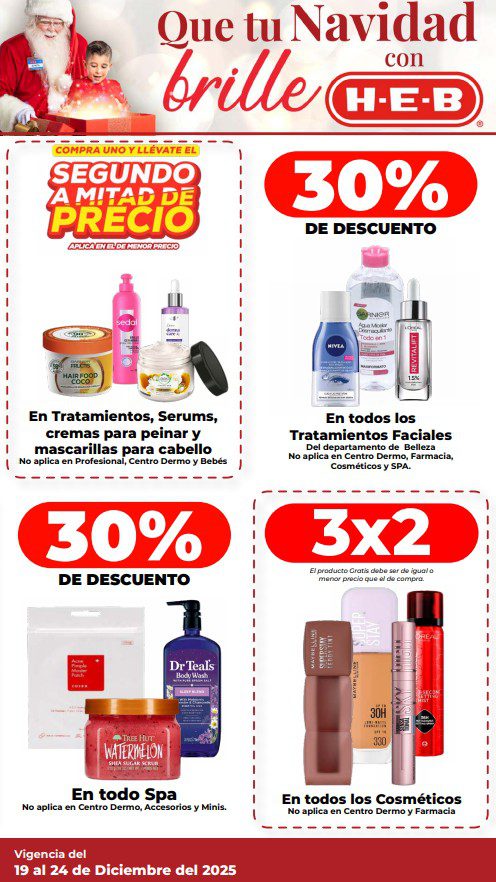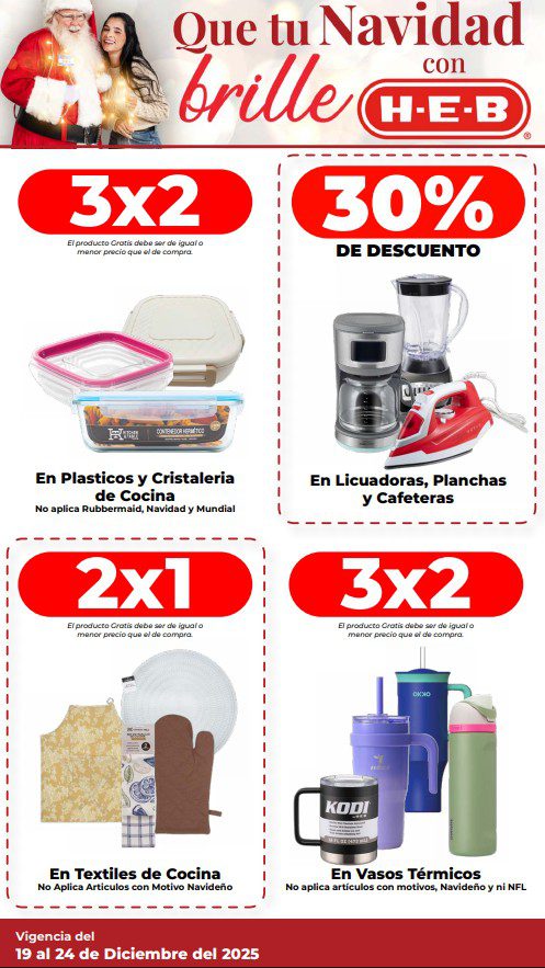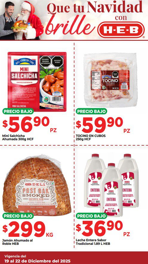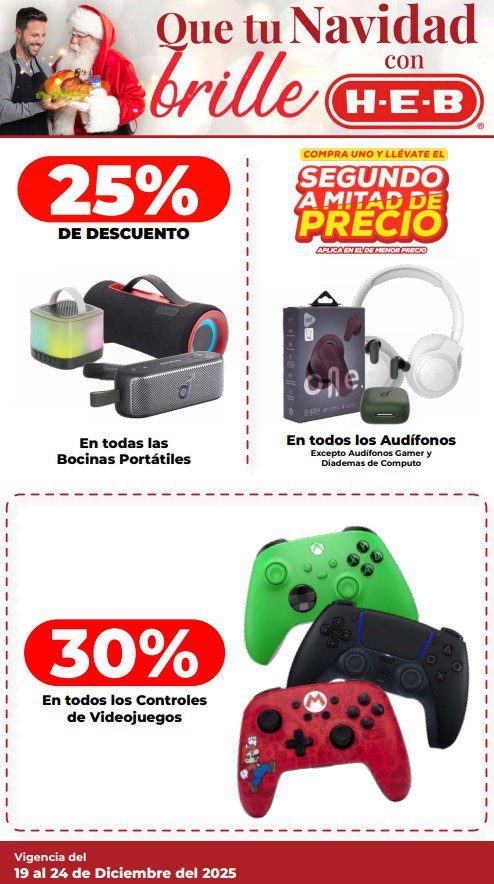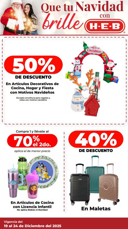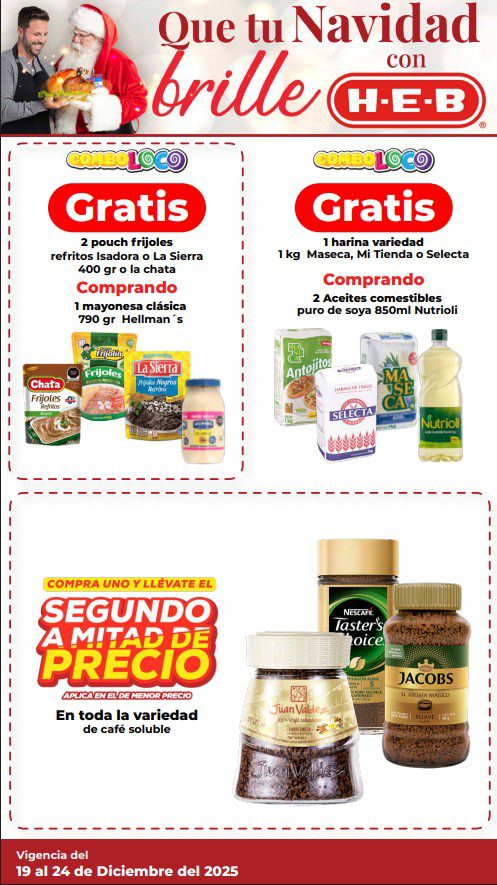 HEB ya publicó semanal Que tu Navidad Brille, con las ofertas tendrán del 19 al 24 de diciembre de 2025 o hasta agotar existencias; algunas aplican solo en sucursales físicas participantes, otras únicamente en su tienda en línea heb.com.mx y otras más en ambos casos; encontrarás ofertas en sus categorías Combo Loco (producto Gratis en la compra de artículos participantes); 2×1; 3×2; Ahorros en dinero en la compra de determinados importes; Rebajado (precios especiales en mercancía seleccionada); hasta un 50% de descuento; Segundo a Mitad de Precio (en la compra de 1 te dan el 2º a mitad de precio); el Segundo artículo al 70% (el descuento aplica en el producto de menor precio); Precio Bajo (Precios especiales); Combos; Precios especiales y Promociones especiales si pagas con tu tarjeta de crédito HEB-Afirme. Éste es el folleto: