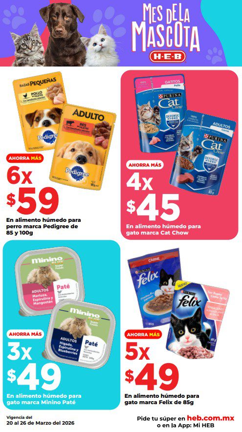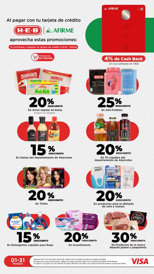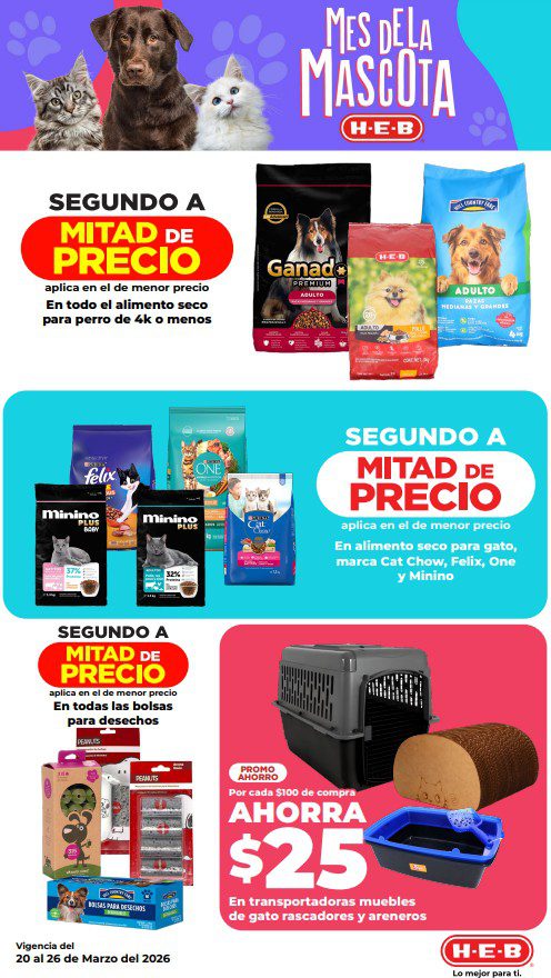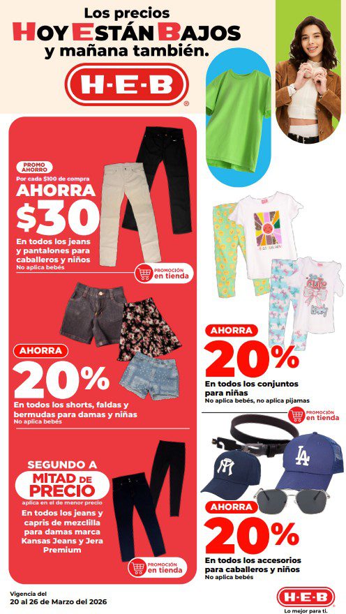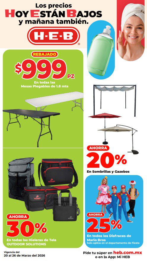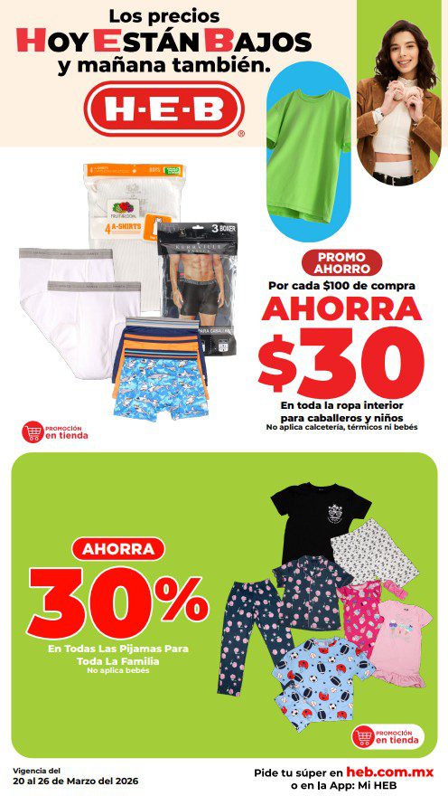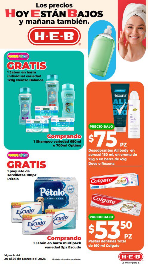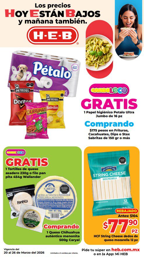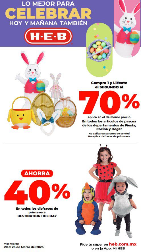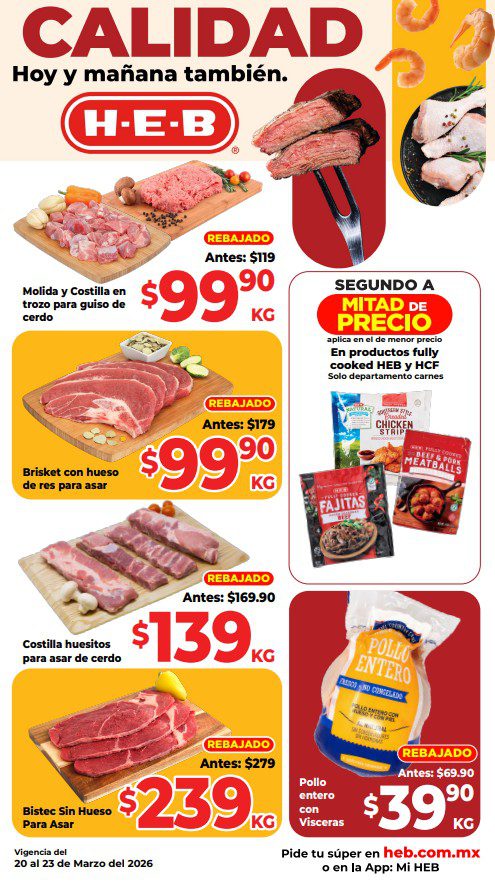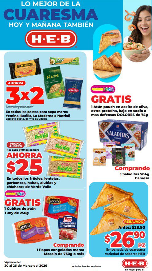 HEB ya publicó semanal Frescura en Cuaresma Hoy y Mañana también, con las ofertas tendrán del 20 al 26 de marzo de 2026 (algunas ofertas terminan el 23 de marzo) o hasta agotar existencias; algunas aplican solo en sucursales físicas participantes, otras únicamente en su tienda en línea heb.com.mx y otras más en ambos casos; encontrarás ofertas en sus categorías: 3×2 (el producto Gratis será el de igual o menor precio), Combo Loco (producto Gratis en la compra de artículos participantes); Promo Ahorro (ahorros en dinero en la compra de determinados importes); Rebajado (descuentos o precios especiales en mercancía seleccionada); Ahorra Más (Combos a precios especiales); hasta un 40% de descuento; Segundo a Mitad de Precio (en la compra de 1 te dan el 2º a mitad de precio); el Segundo artículo al 70% (el descuento aplica en el producto de menor precio); Precio Bajo (Precios especiales) y Promociones especiales si pagas con tu tarjeta de crédito HEB-Afirme. Éste es el folleto: