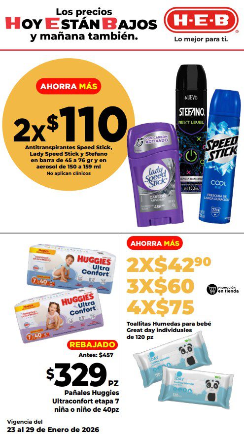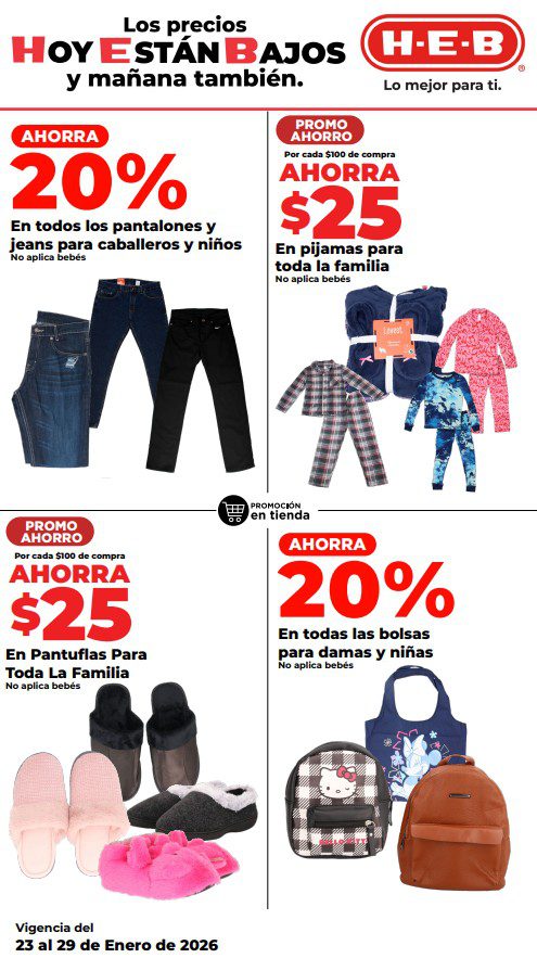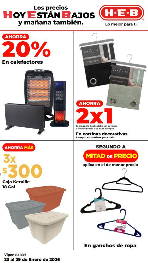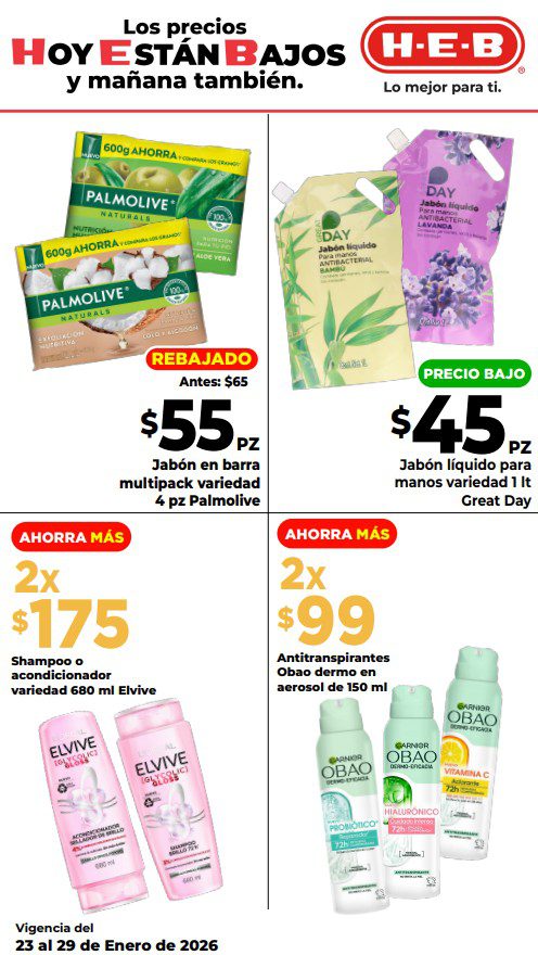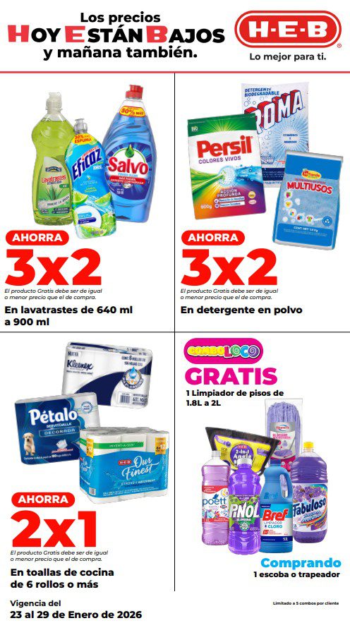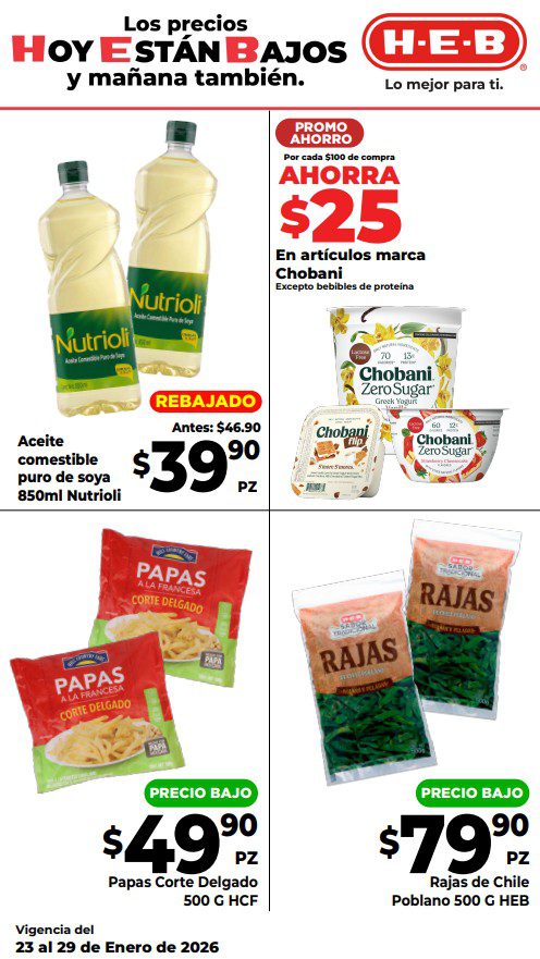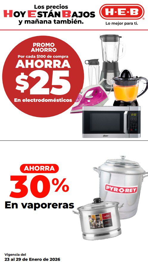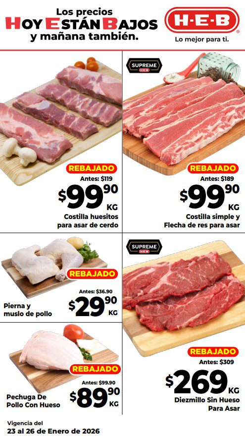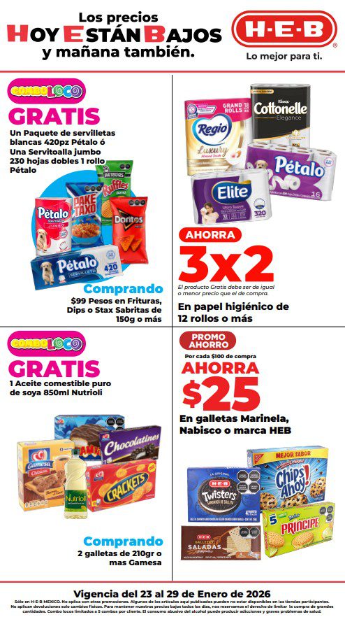 HEB ya publicó semanal Los Precios Hoy están Bajos, y Mañana también, con las ofertas tendrán del 23 al 29 de enero de 2026 o hasta agotar existencias; algunas aplican solo en sucursales físicas participantes, otras únicamente en su tienda en línea heb.com.mx y otras más en ambos casos; encontrarás ofertas en sus categorías: 2×1, 3×2 (el producto Gratis será el de igual o menor precio), Combo Loco (producto Gratis en la compra de artículos participantes); Promo Ahorro (ahorros en dinero en la compra de determinados importes); Rebajado (descuentos o precios especiales en mercancía seleccionada); Ahorra Más (Combos a precios especiales); hasta un 30% de descuento; Segundo a Mitad de Precio (en la compra de 1 te dan el 2º a mitad de precio); Precio Bajo (Precios especiales); Precios especiales y Promociones especiales si pagas con tu tarjeta de crédito HEB-Afirme. Éste es el folleto: