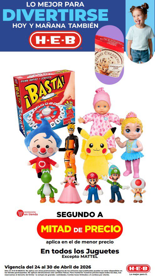 HEB ya publicó semanal Lo Mejor para Divertirse Hoy y Mañana también, con las ofertas tendrán del 24 al 30 de abril de 2026 (algunas ofertas terminan el 23 de marzo) o hasta agotar existencias; algunas aplican solo en sucursales físicas participantes, otras únicamente en su tienda en línea heb.com.mx y otras más en ambos casos; encontrarás ofertas en sus categorías: 2×1, 3×2 (el producto Gratis será el de igual o menor precio), Combo Loco (producto Gratis en la compra de artículos participantes); Promo Ahorro (ahorros en dinero en la compra de determinados importes); Combos (precios especiales en mercancía seleccionada), Rebajado (descuentos o precios especiales en mercancía seleccionada); Ahorra Más (Combos a precios especiales); hasta un 40% de descuento; Segundo a Mitad de Precio (en la compra de 1 te dan el 2º a mitad de precio); Precio Bajo (Precios especiales); Promociones especiales si pagas con tu tarjeta de crédito HEB-Afirme y en Farmacia, Producto GRATIS en la compra de determinadas unidades de medicamentos participantes. Éste es el folleto: