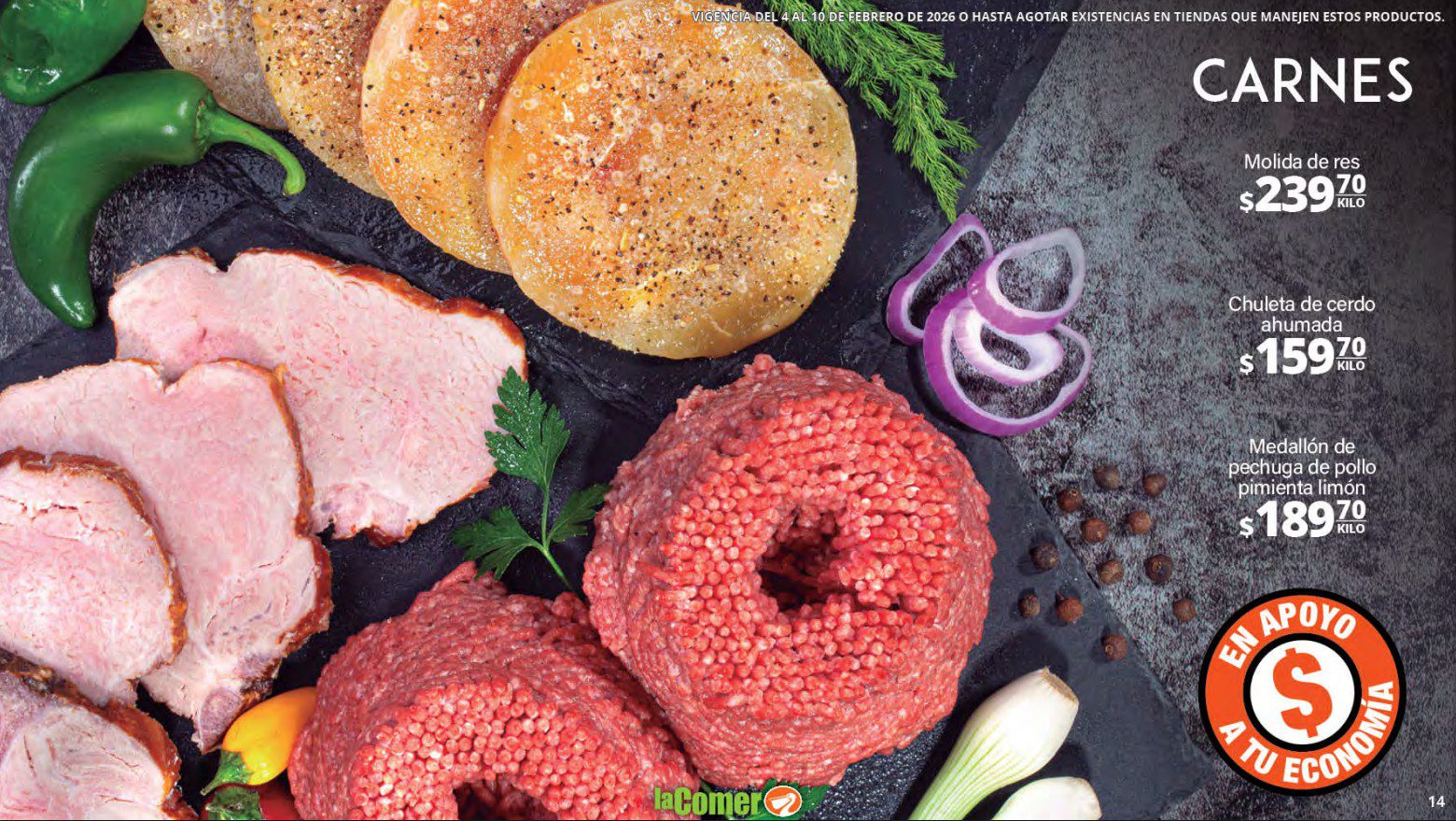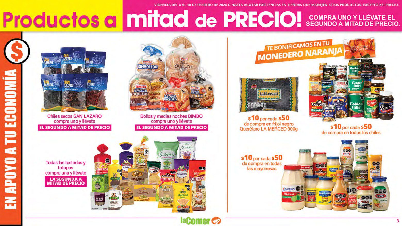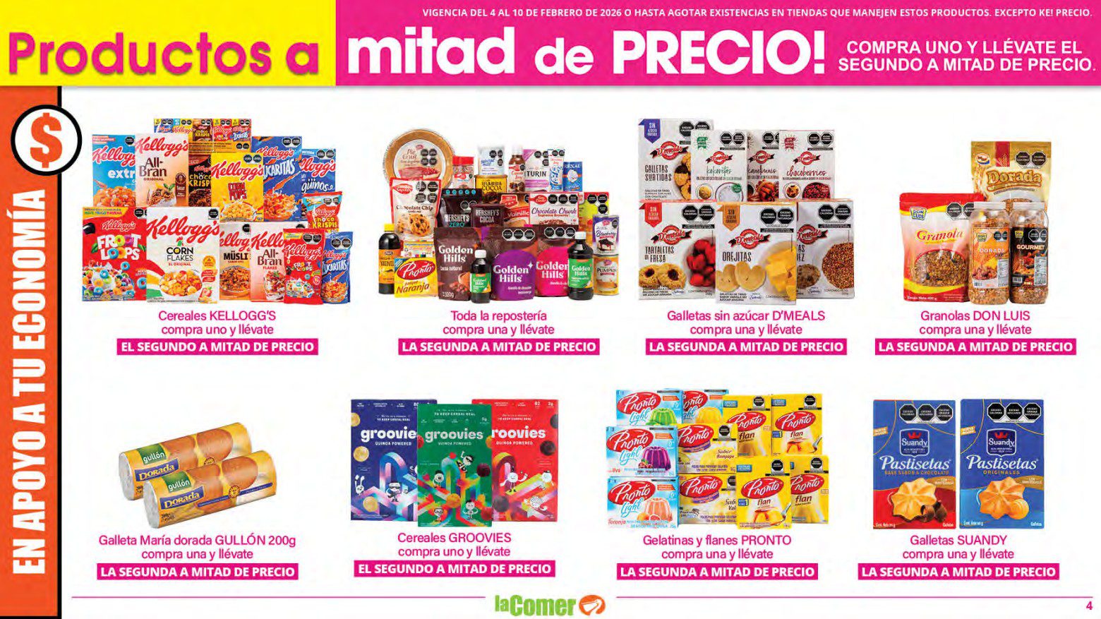 Te comparto el folleto Llegaron los Mejores Precios de La Comer, que contiene sus ofertas válidas del 04 al 10 de febrero de 2026 o hasta agotar existencias y en el que encontrarás que, en la compra de 1 te llevas el Segundo a Mitad de precio, Ofertas especiales en la compra de importes determinados, Bonificaciones en tu Monedero Naranja en la compra de determinados importes, Precios especiales en productos seleccionados y Ofertas especiales en sus líneas de productos Ke! Precio; las ofertas son válidas en su tienda en línea: www.lacomer.com.mx/ y en sus sucursales físicas y este es su folleto: