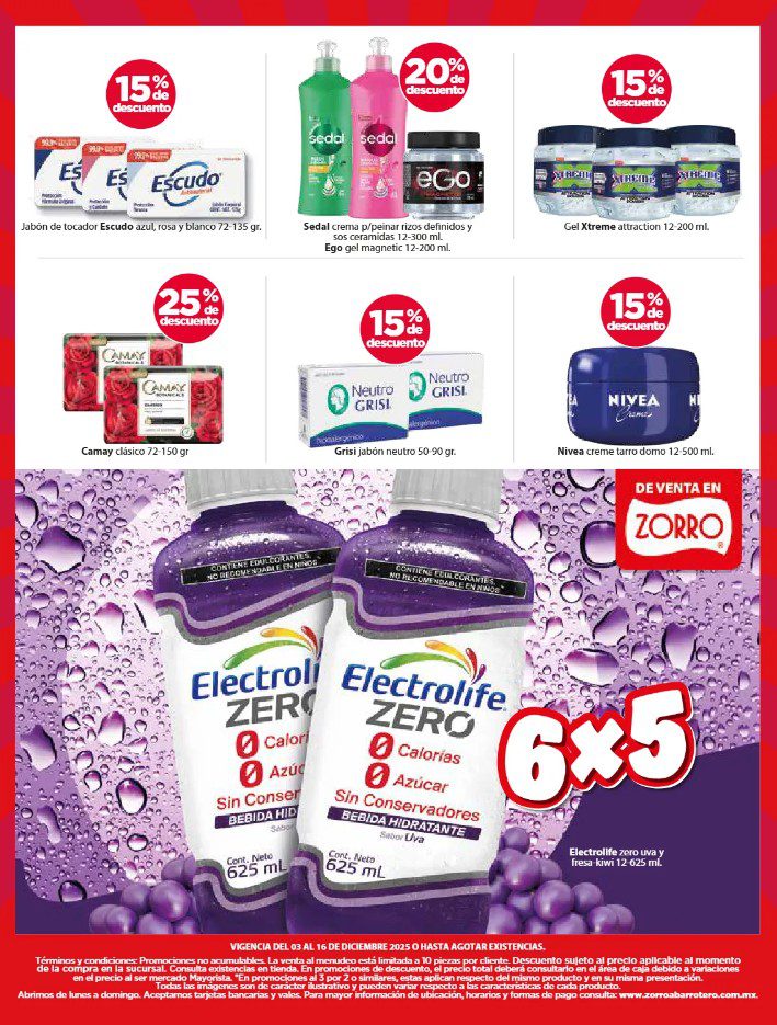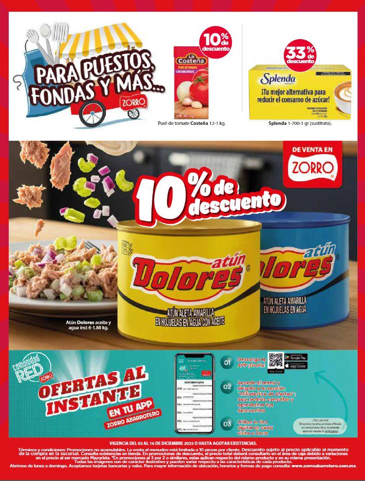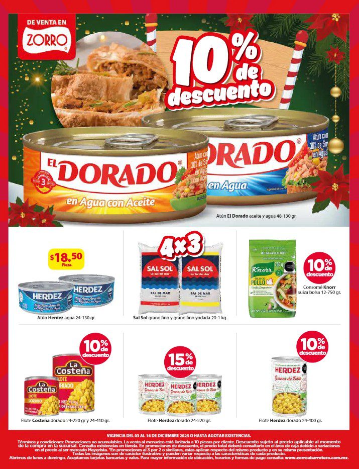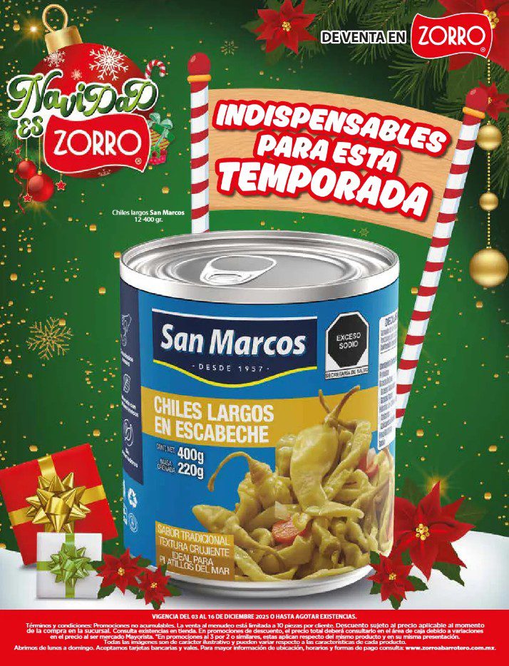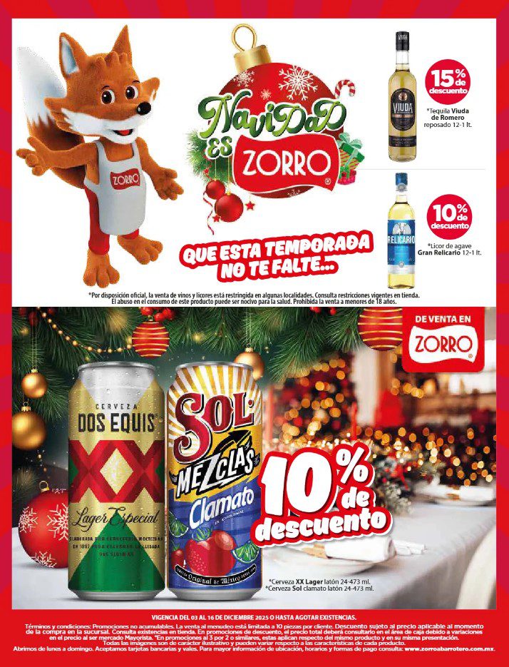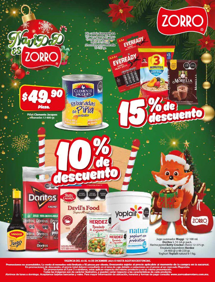 Apenas estoy viendo el folleto Navidad es Zorro, que el Zorro Abarrotero publicó y que contiene sus ofertas que estarán disponibles del 03 al 16 de diciembre de 2025, entre las que se encuentran 4×3, 6×5, Marcas Exclusivas, Indispensables para tu Negocio, Producto Gratis en la compra de mercancía seleccionada, hasta un 25% de descuento y Precios especiales; las ofertas aplican en mercancía seleccionada. No es acumulable con otras promociones y aquí les dejo el folleto completo: