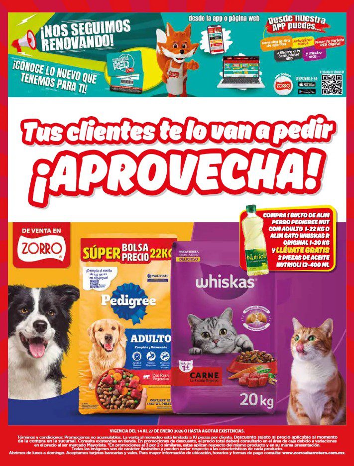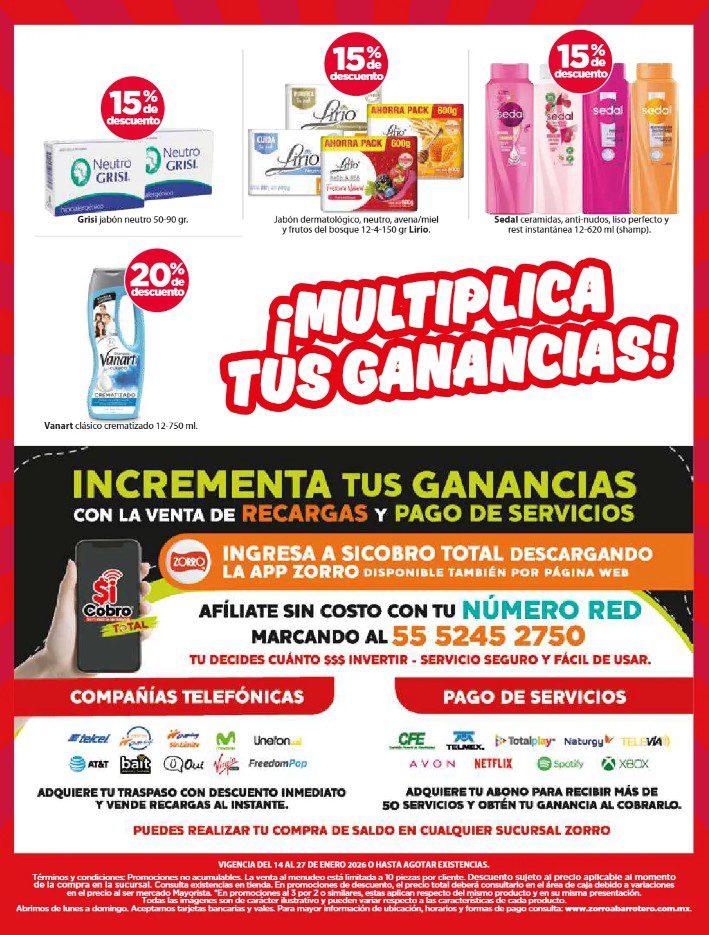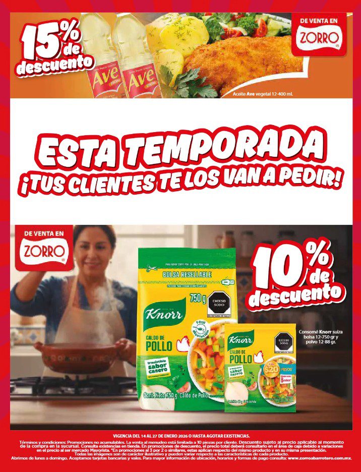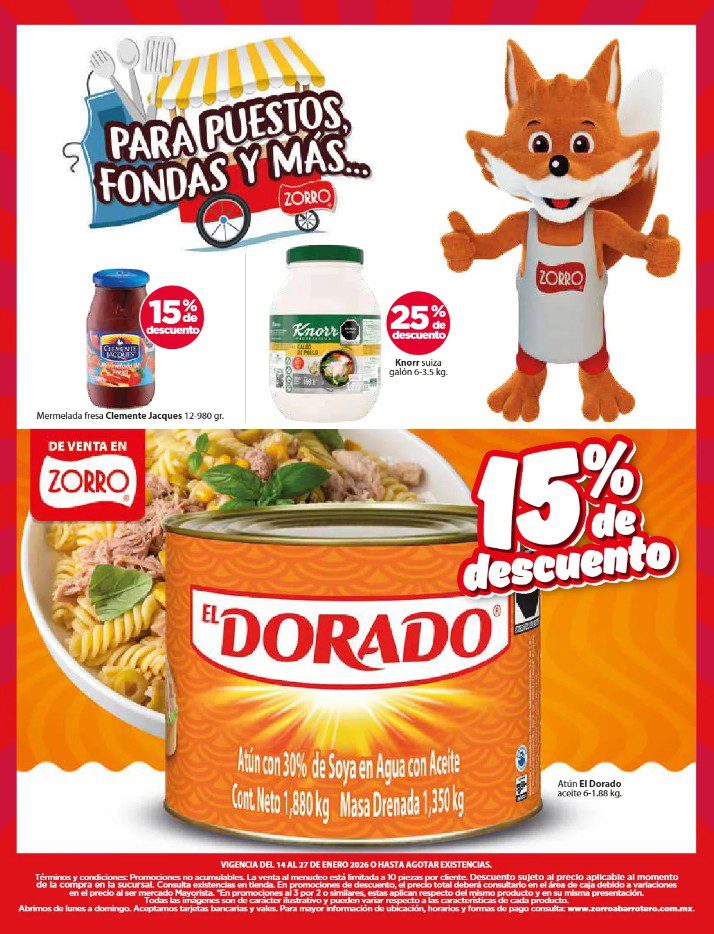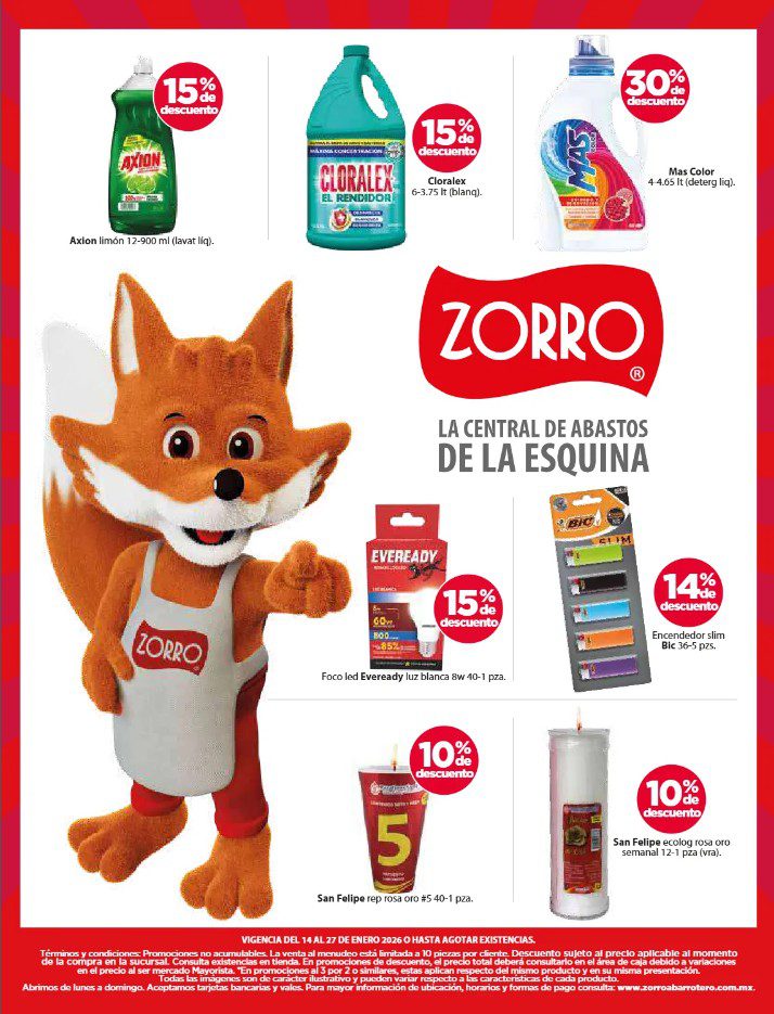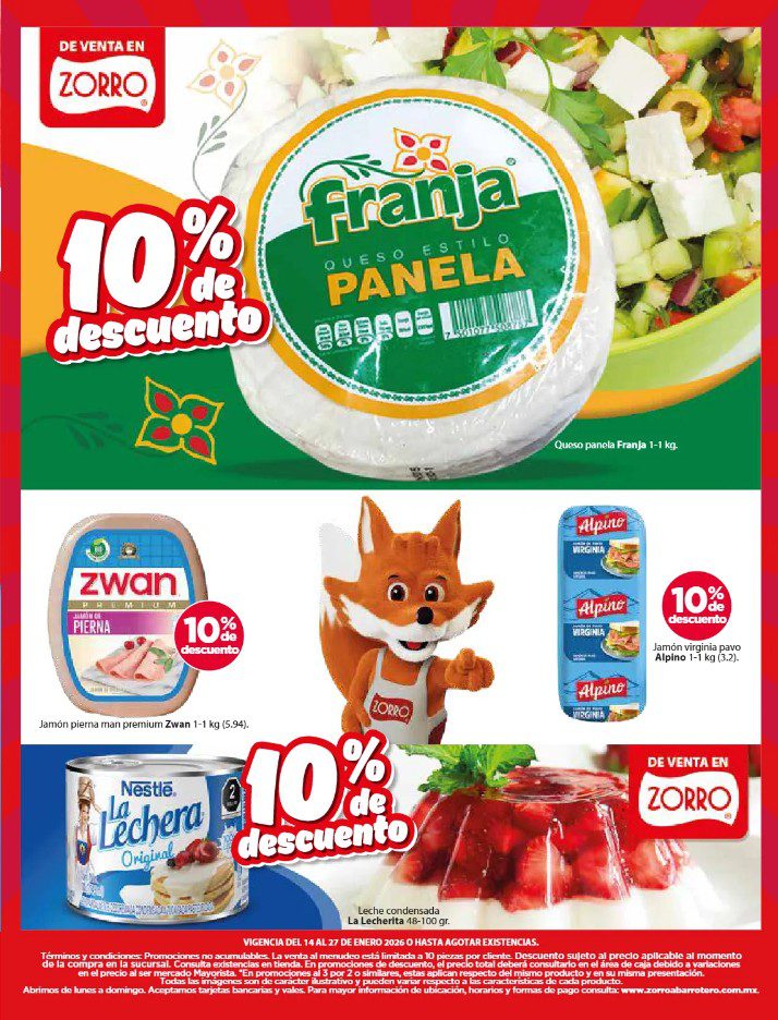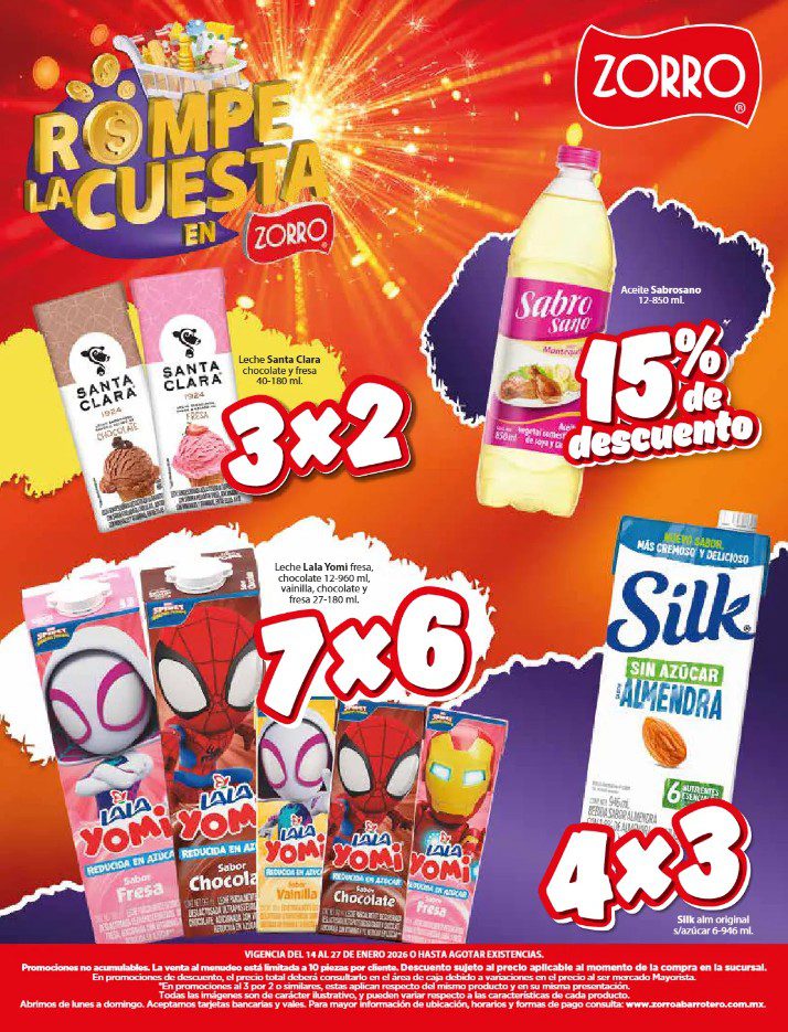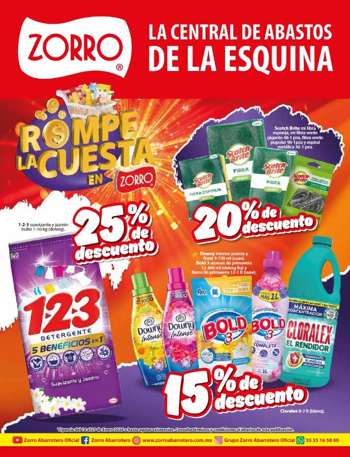 Apenas estoy viendo el folleto Rompe la Cuesta, que el Zorro Abarrotero publicó y que contiene sus ofertas que estarán disponibles del 14 al 27 de enero de 2026, entre las que se encuentran 3×2, 4×3, 7×6, Marcas Exclusivas, Producto Gratis en la compra de mercancía seleccionada, hasta un 30% de descuento y Precios especiales; las ofertas aplican en mercancía seleccionada. No es acumulable con otras promociones y aquí les dejo el folleto completo: