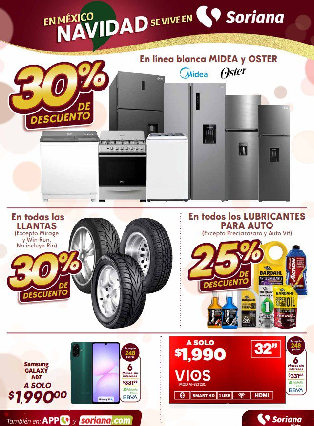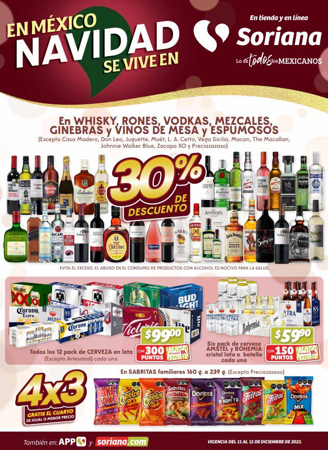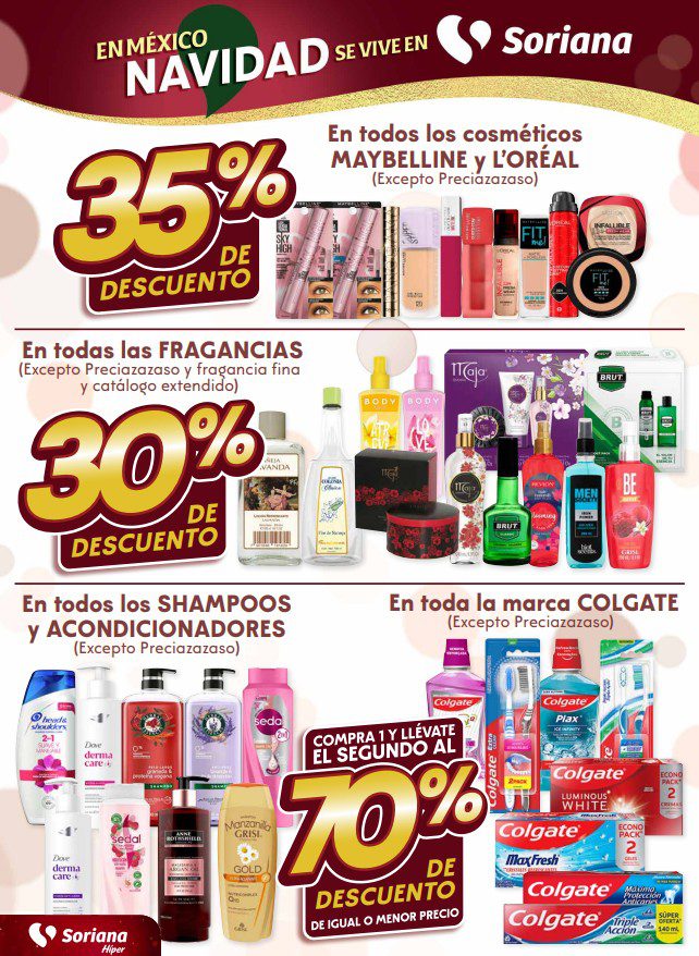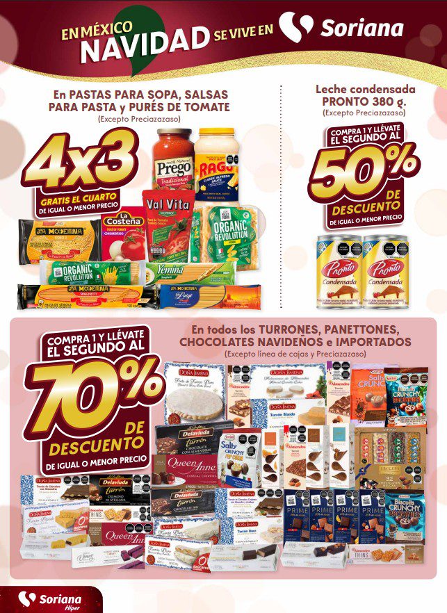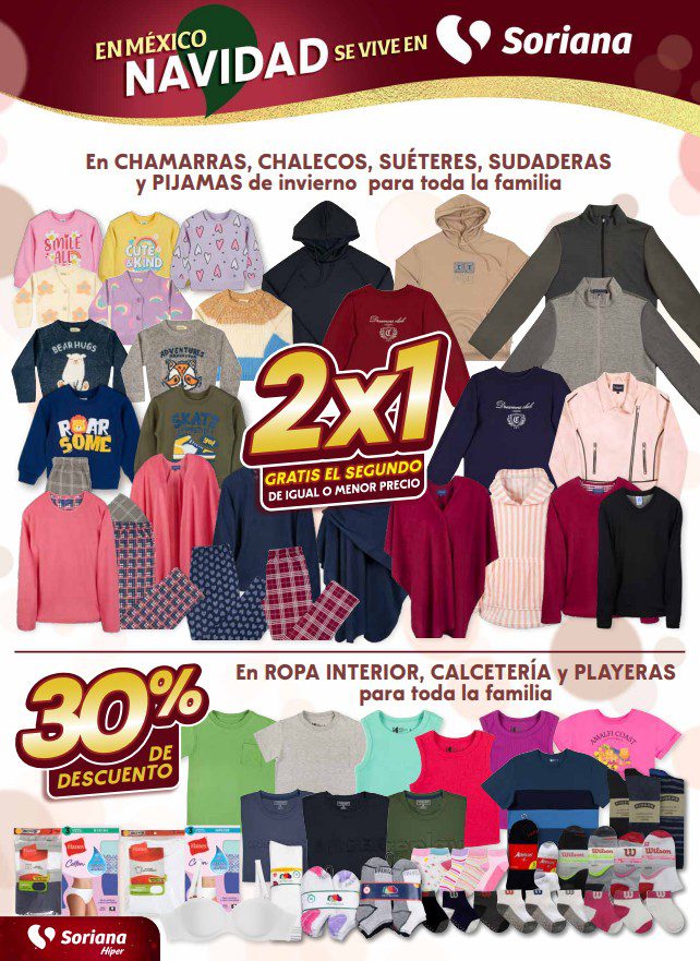 Soriana Híper dio a conocer su folleto de Fin de semana: En México Navidad se Vive en Soriana, que contiene sus ofertas válidas del 11 al 15 de diciembre de 2025, hasta agotar existencias, entre las que encontrarás un 2×1, 3×2, 4×3 (el producto GRATIS será el de igual o menor precio), el 2º producto con un 50% ó un 70% de descuento (en artículos de igual o menor precio), hasta un 70% de descuento, Precios especiales, Beneficios con tu Tarjeta Soriana Ya y hasta 6 Meses sin intereses; las ofertas son válidas en mercancía seleccionada y aplican en sucursales físicas y en su tienda en línea soriana.com. Estas son solo algunas de sus ofertas (al final te dejo el folleto completo):