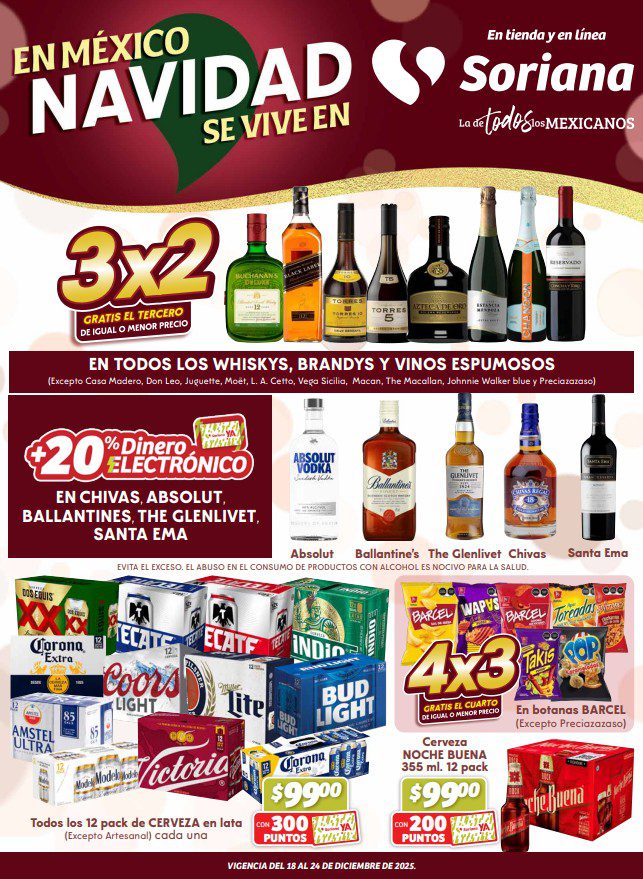 Soriana Híper dio a conocer su folleto de Fin de semana: En México Navidad se Vive en Soriana, que contiene sus ofertas válidas del 18 al 24 de diciembre de 2025, hasta agotar existencias, entre las que encontrarás un 3×2, 4×3 (el producto GRATIS será el de igual o menor precio), el 2º producto con un 50% ó un 70% de descuento (en artículos de igual o menor precio), hasta un 70% de descuento, Precios especiales, Beneficios con tu Tarjeta Soriana Ya y hasta 18 Meses sin intereses; las ofertas son válidas en mercancía seleccionada y aplican en sucursales físicas y en su tienda en línea soriana.com. Estas son solo algunas de sus ofertas (al final te dejo el folleto completo):