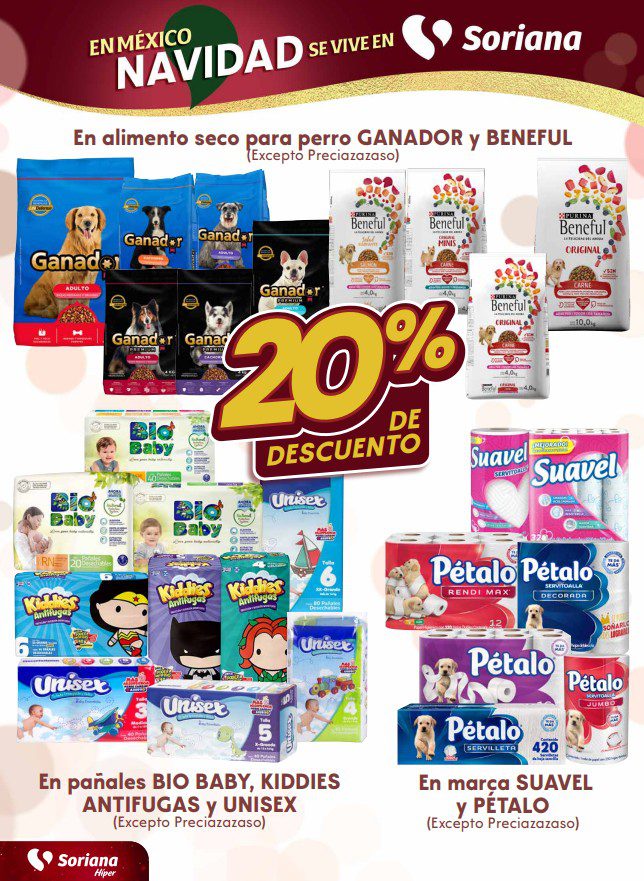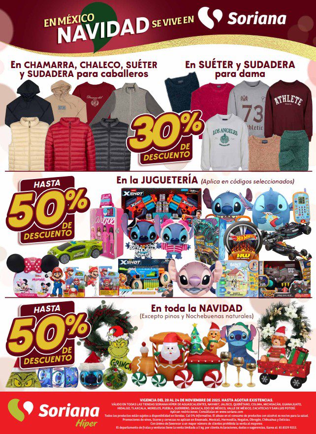 Soriana Híper dio a conocer su folleto de Fin de semana: En México Navidad se dice Soriana, que contiene sus ofertas válidas del 20 al 24 de noviembre de 2025, hasta agotar existencias, entre las que encontrarás un 3×2, 4×3 (el producto GRATIS será el de igual o menor precio), hasta un 50% de descuento, Precios especiales y Beneficios con tu Tarjeta Soriana Ya; las ofertas son válidas en mercancía seleccionada y aplican en sucursales físicas y en su tienda en línea soriana.com. Estas son solo algunas de sus ofertas (al final te dejo el folleto completo):