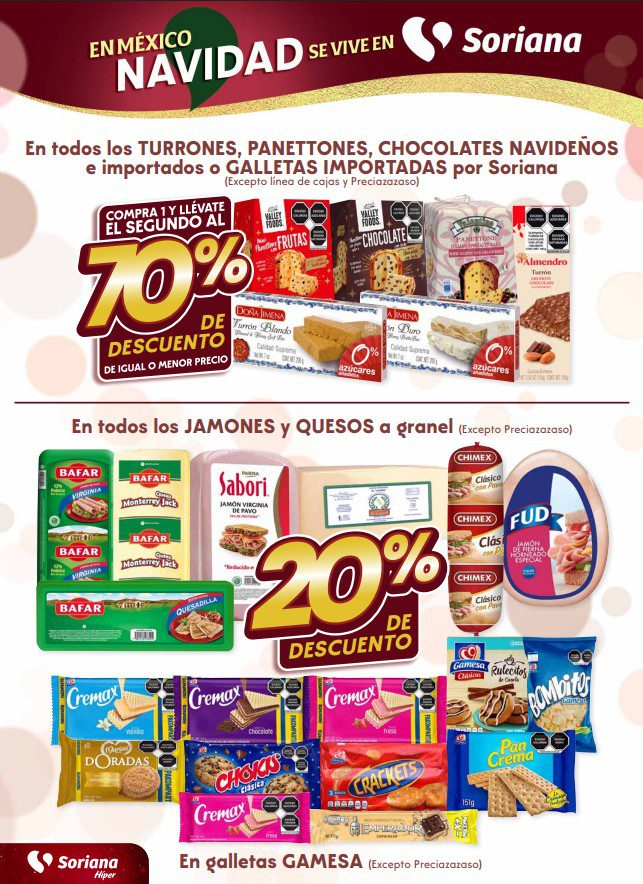 - Todos los Turrones, Panettones, Chocolñates Navideños e Importados ó Galletas Importadas por Soriana (excepto línea de cajas y Preciazazaso)