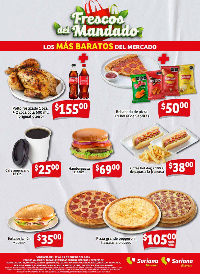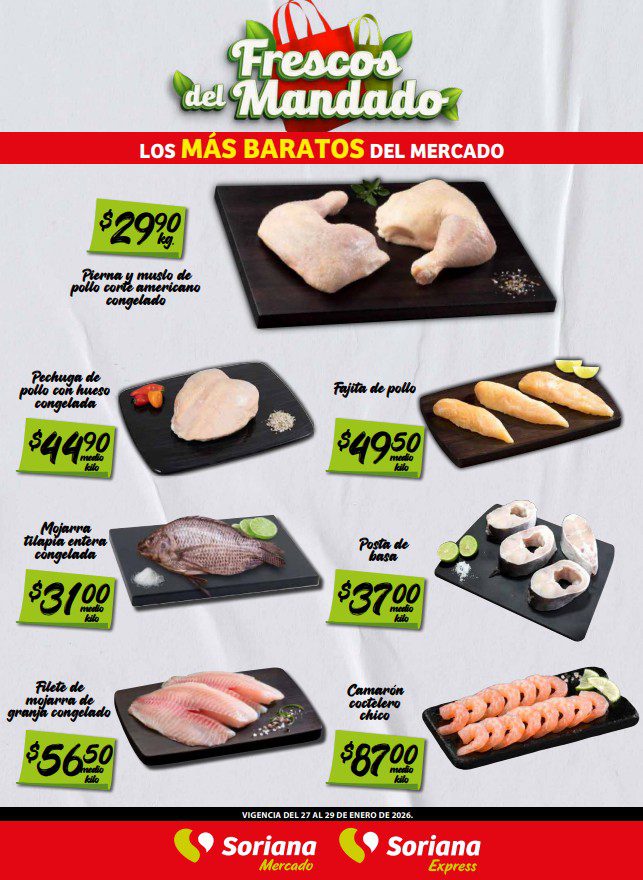 Acabo de ver las ofertas en Frutas, Verduras y Carnes del folleto de Media Semana Los Frescos del Mandado de las tiendas de autoservicio Soriana Mercado y Express que son válidas del 27 al 29 de enero de 2026; en el que encontrarás Precios especiales; la promoción es válida en sucursales participantes, aplican en artículos seleccionados y algunas de sus ofertas son estas (al final te dejo el folleto completo):