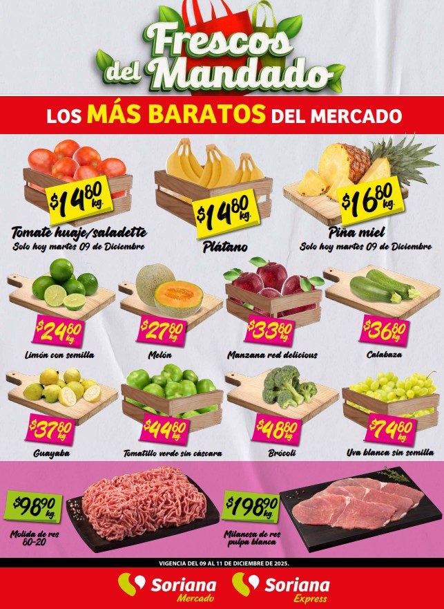 Acabo de ver las ofertas en Frutas, Verduras y Carnes del folleto de Media Semana Los Frescos del Mandado de las tiendas de autoservicio Soriana Mercado y Express que son válidas del 09 al 11 de diciembre de 2025; en el que encontrarás Precios especiales; la promoción es válida en sucursales participantes, aplican en artículos seleccionados y algunas de sus ofertas son estas (al final te dejo el folleto completo):