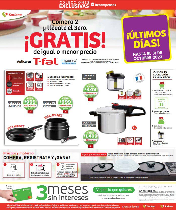 Hasta el martes 31 de octubre de 2023, estará vigente el folleto Recompensas Soriana de Soriana Híper, Súper Mercado y Express, en el que encontrarás Productos GRATIS usando tus Puntos Recompensa Soriana, ó en la compra de 2, te llevas GRATIS el 3º (de igual o menor precio); las ofertas aplican en productos participantes y son válidas en sus sucursales físicas.