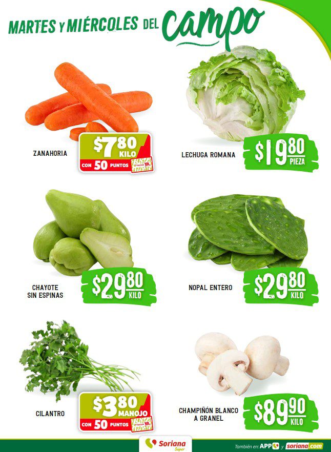 - Zanahoria a $7.80 el kilo con 50 Puntos Soriana Ya.