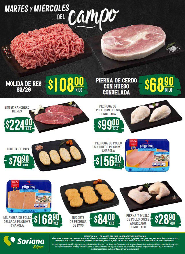 Hace un momento vi que Soriana Súper publicó su folleto Martes y Miércoles del Campo, que contiene sus ofertas válidas el martes 10 y miércoles 11 de marzo de 2026 o hasta agotar existencias, entre las que encontrarás Precios especiales, sus ofertas son válidas en artículos seleccionados, aplican en sus sucursales físicas participantes y las siguientes son las que corresponden a Frutas, Verduras y Carnes.