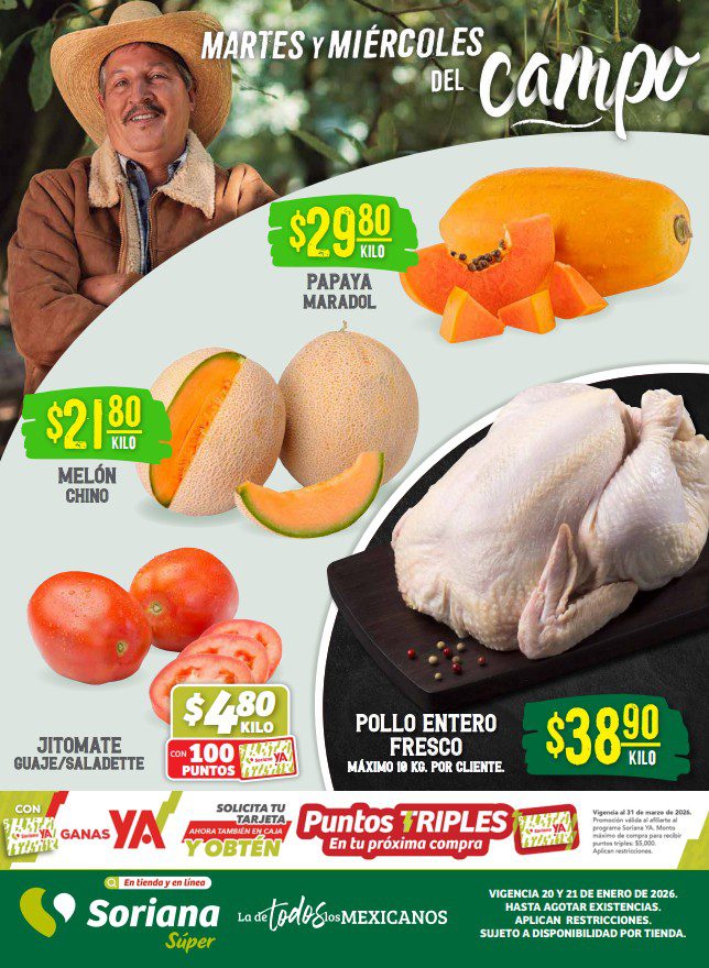 Hace un momento vi que Soriana Súper publicó su folleto Martes y Miércoles del Campo, que contiene sus ofertas válidas el martes 20 y miércoles 21 de enero de 2026 o hasta agotar existencias, entre las que encontrarás Precios especiales, sus ofertas son válidas en artículos seleccionados, aplican en sus sucursales físicas participantes y las siguientes son las que corresponden a Frutas, Verduras y Carnes.