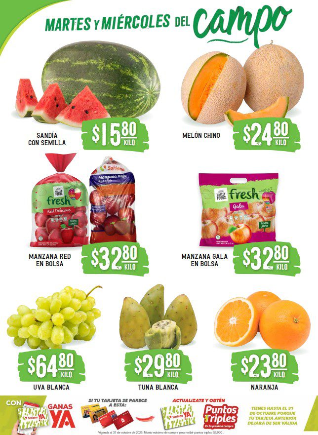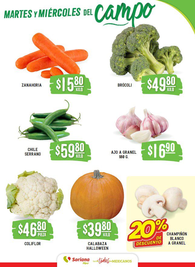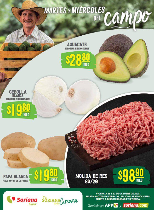 Hace un momento vi que Soriana Súper publicó su folleto Martes y Miércoles del Campo, que contiene sus ofertas válidas el martes 21 y miércoles 22 de octubre de 2025 o hasta agotar existencias, entre las que encontrarás hasta un 20% de descuento y Precios especiales, sus ofertas son válidas en artículos seleccionados, aplican en sus sucursales físicas participantes y las siguientes son las que corresponden a Frutas, Verduras y Carnes (al final te comparto el folleto completo):