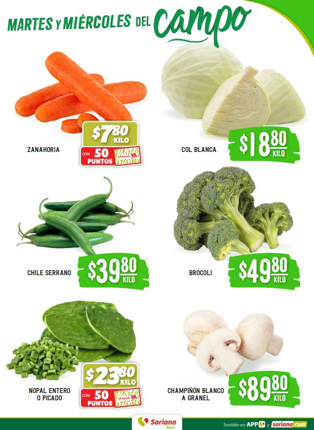 • Nopal entero o picado a $23.80 el kilo con 50 Puntos Soriana Ya.